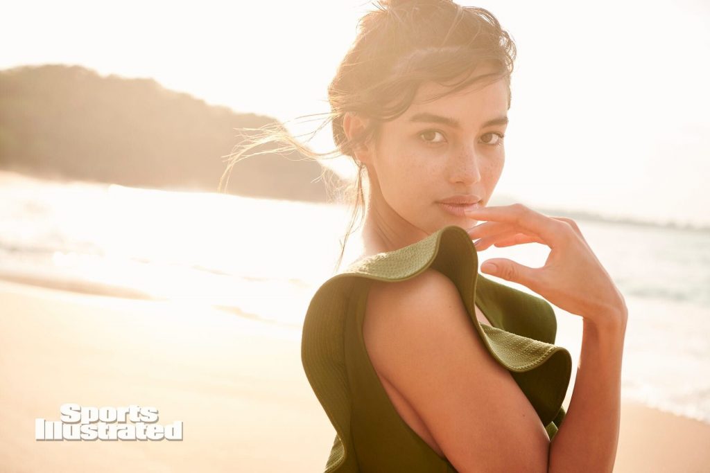 Modelo filipina/estadounidense Kelsey Merritt muestra un poco de bajo pecho, escote y su delgado cuerpo en bikini en la playa en una nueva sesión de fotos para Sports Illustrated Swimsuit 2020.