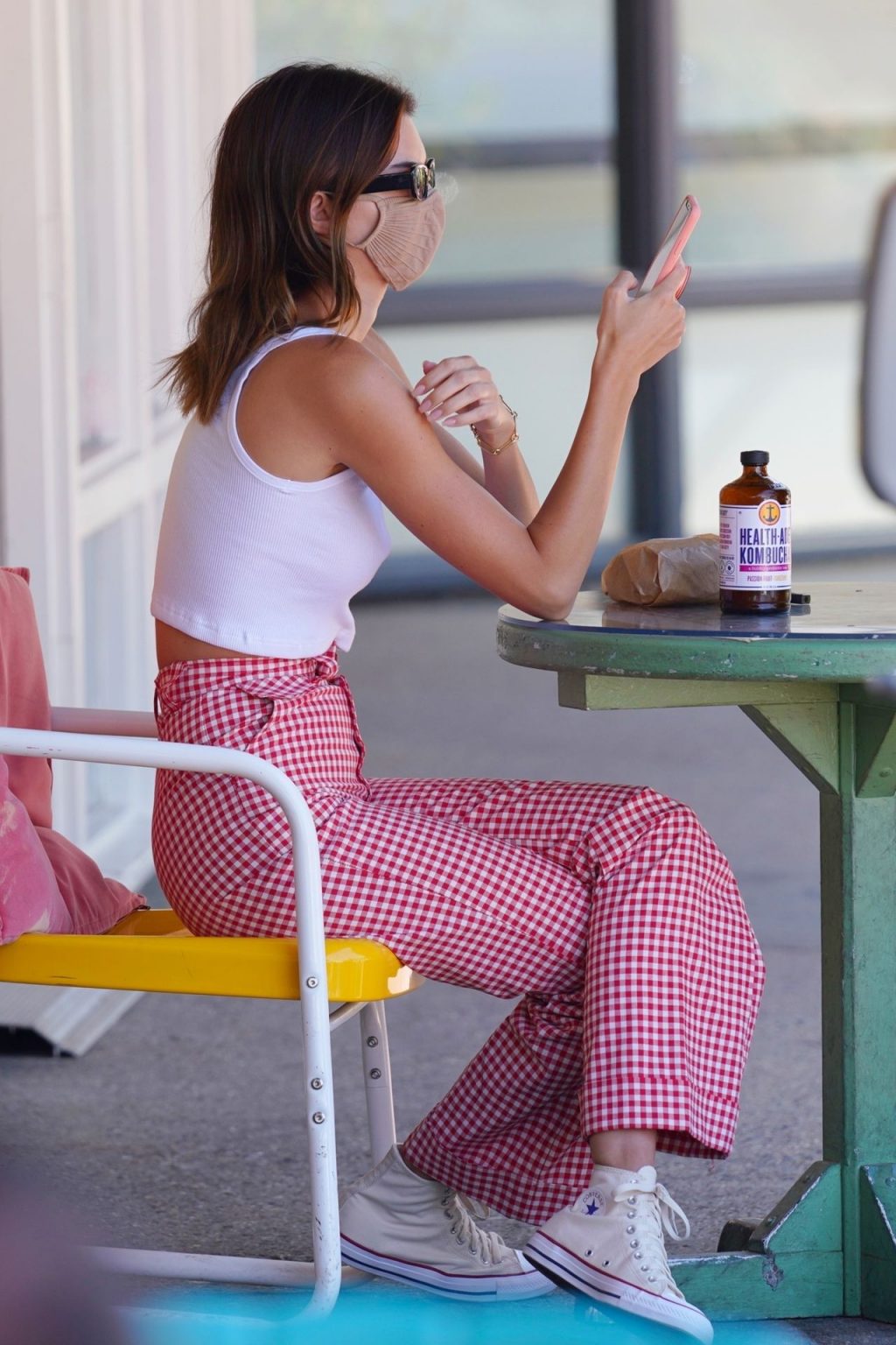 La joven supermodelo Kendall Jenner luce un estilo veraniego chic con sus pantalones de estampado vichy rojo y su top blanco de tirantes mientras es vista comprando y almorzando en Malibu con una amiga, 29/07/2020.