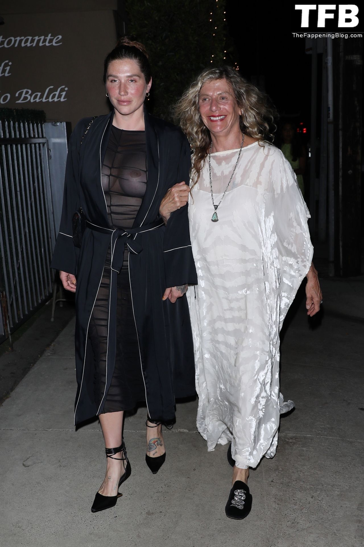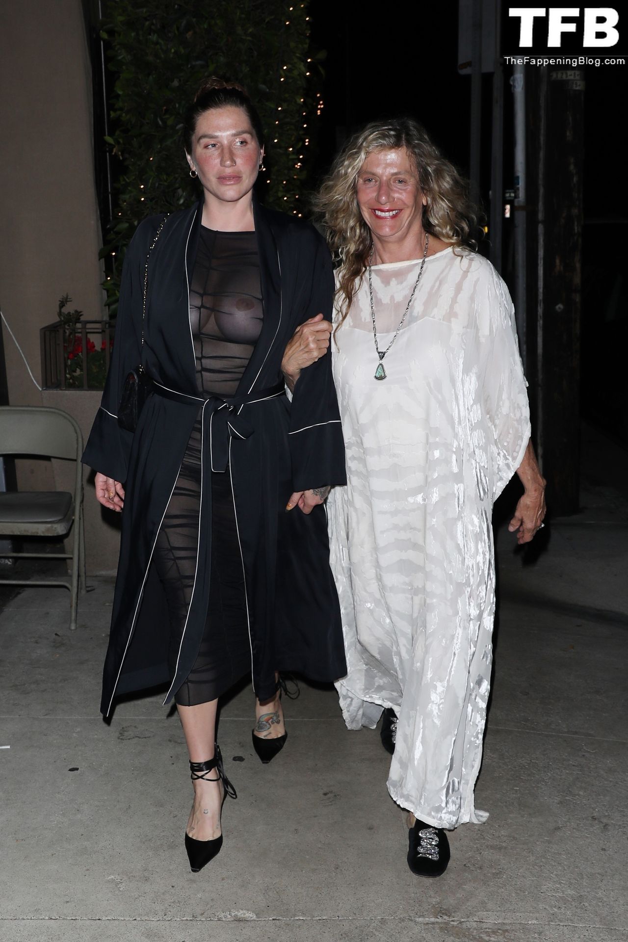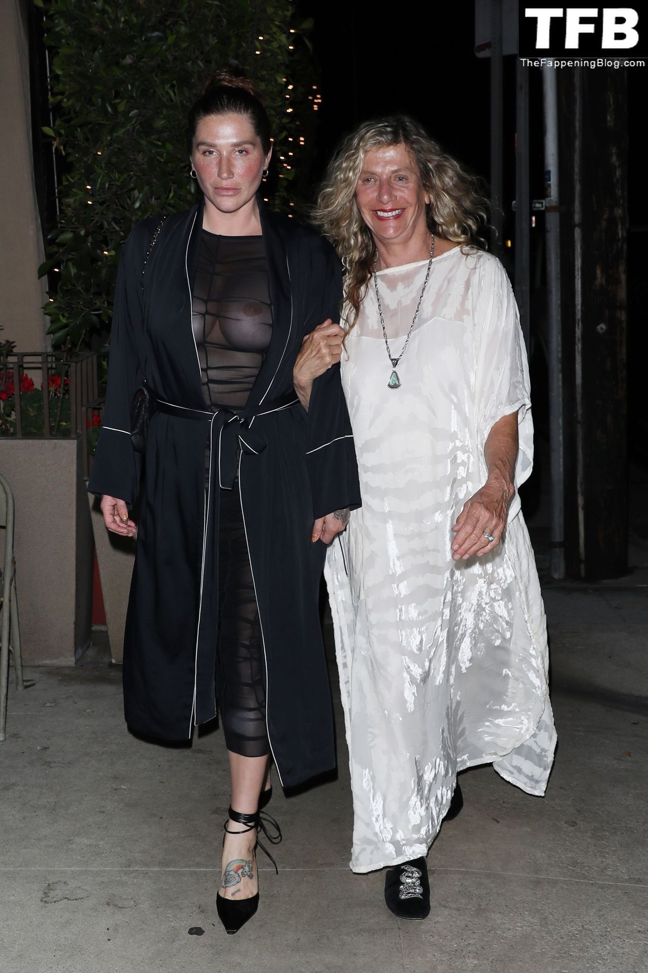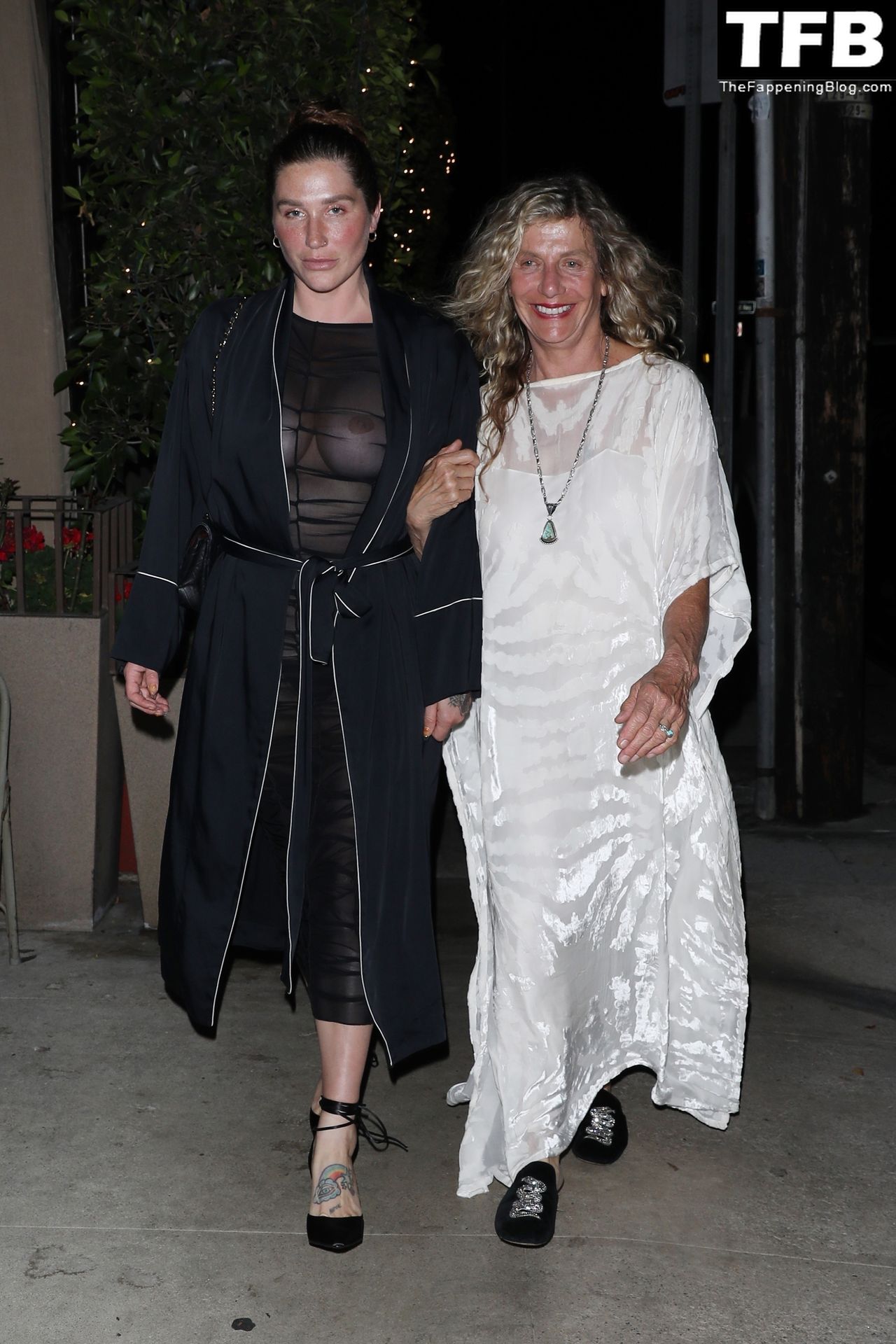 La cantante Kesha deja poco a la imaginación al salir de la cena en el restaurante Giorgio Baldi, vistiendo un vestido negro de malla transparente con ropa interior a juego, acompañada de su madre Pebe Sebert y una amiga en Santa Mónica, 07/08/2022.