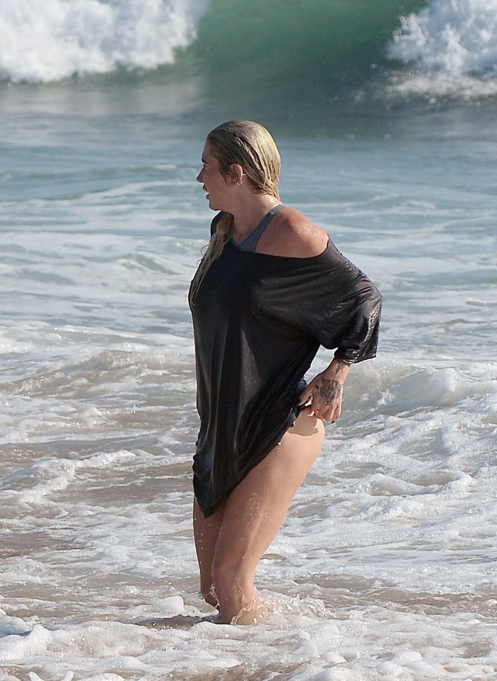 La cantante de 34 años se refrescó con un baño en el océano mientras llevaba una cubierta de playa gris y un bikini con estampado.