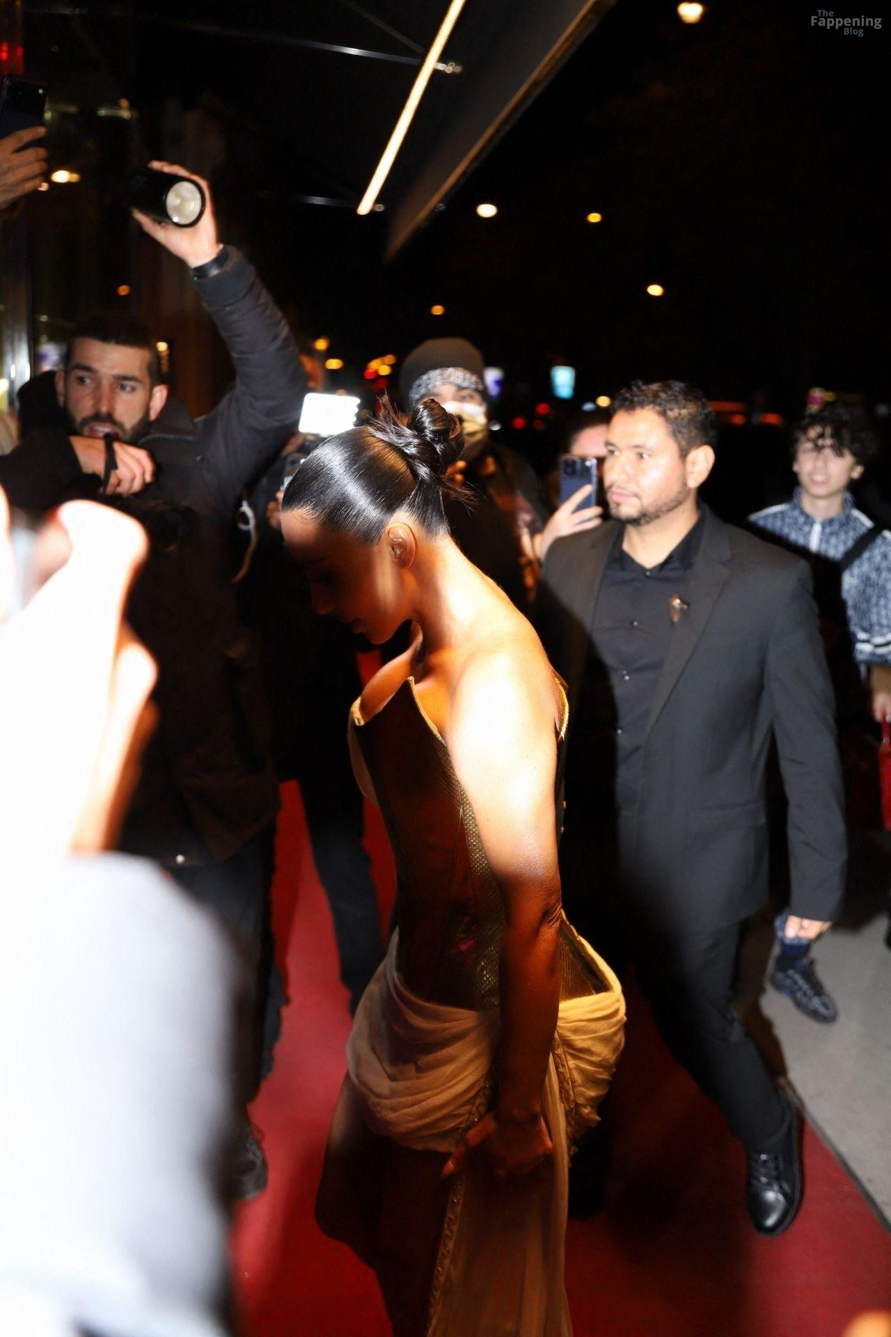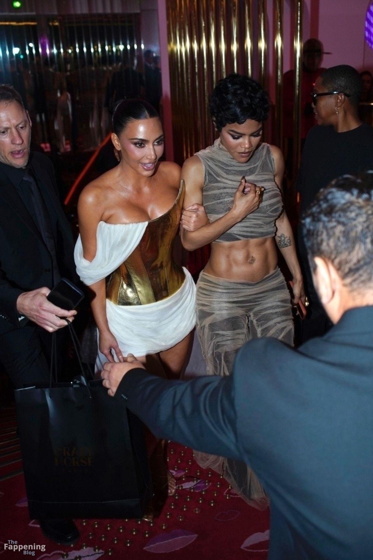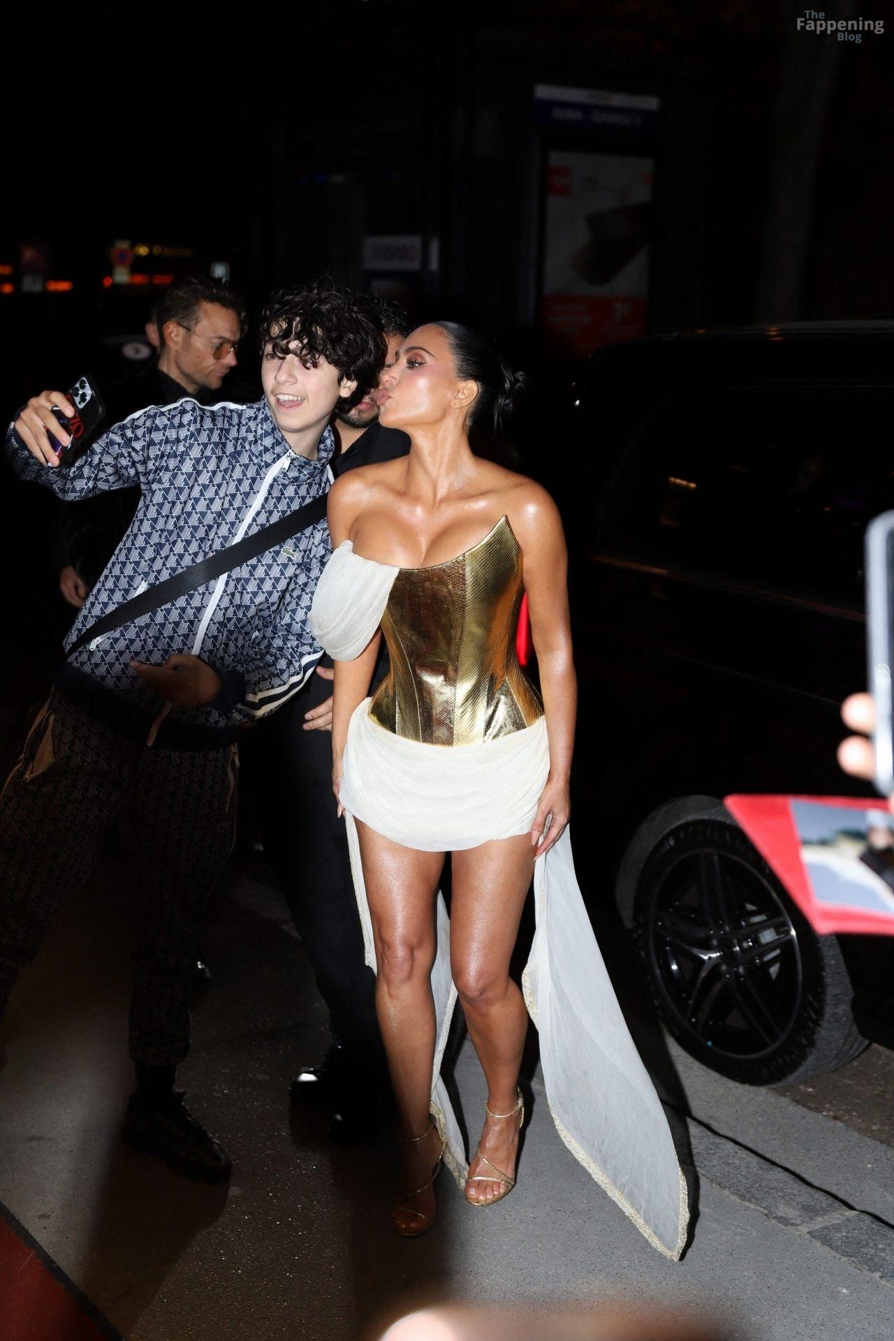 Kim Kardashian llegó a Crazy Horse en París para su fiesta de cumpleaños número 45 después del estreno de su serie All’s Fair en Disney+. Se puso un vestido corsé dorado que dejaba sus enormes pechos al descubierto con un escote impresionante, combinado con una falda con una abertura alta que mostraba su cuerpo y piernas.