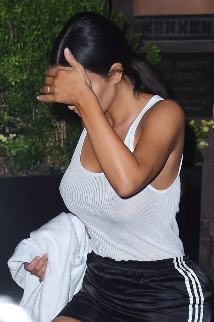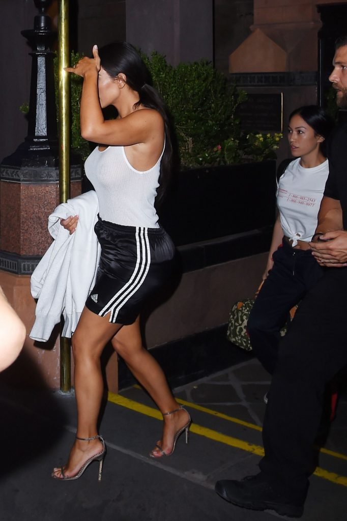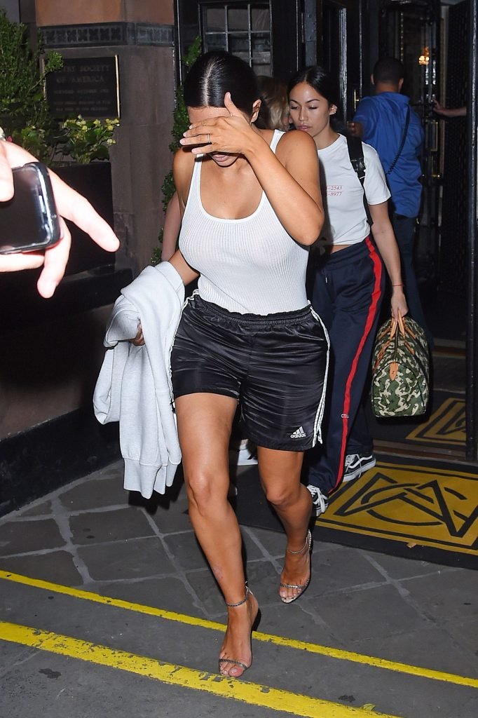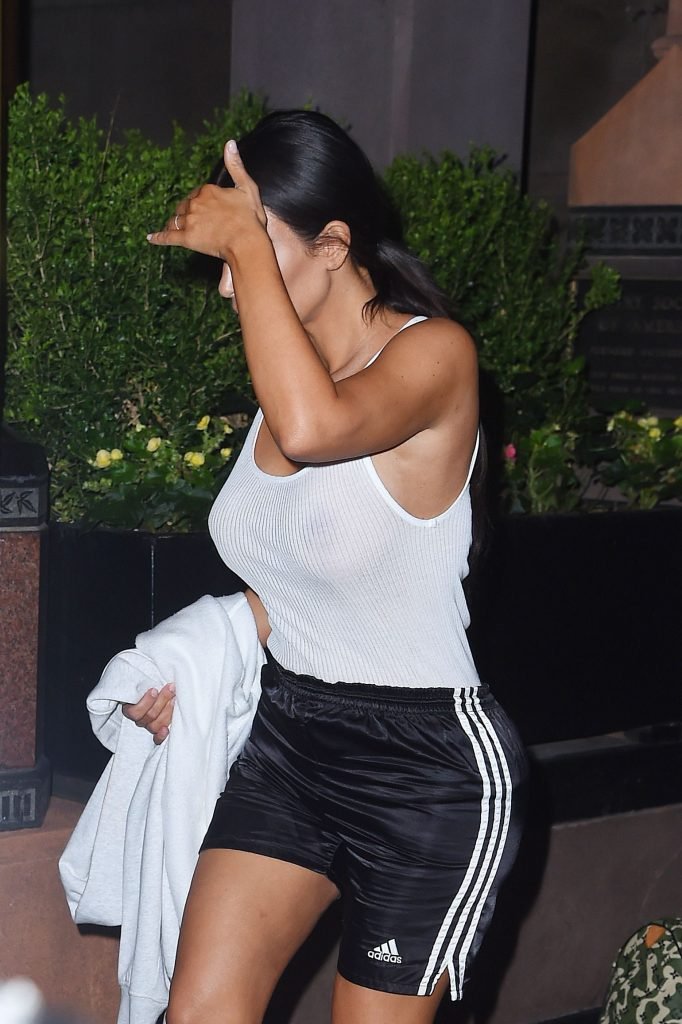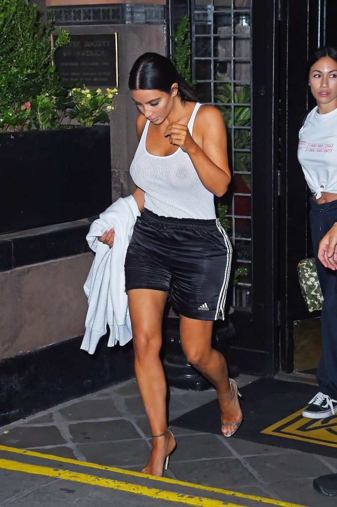 Kim Kardashian sin sostén sale de una sesión de fotos en NYC, 11/07/2017. La estrella de la televisión reality lleva shorts de Adidas y una camiseta blanca sin mangas combinada con tacones.