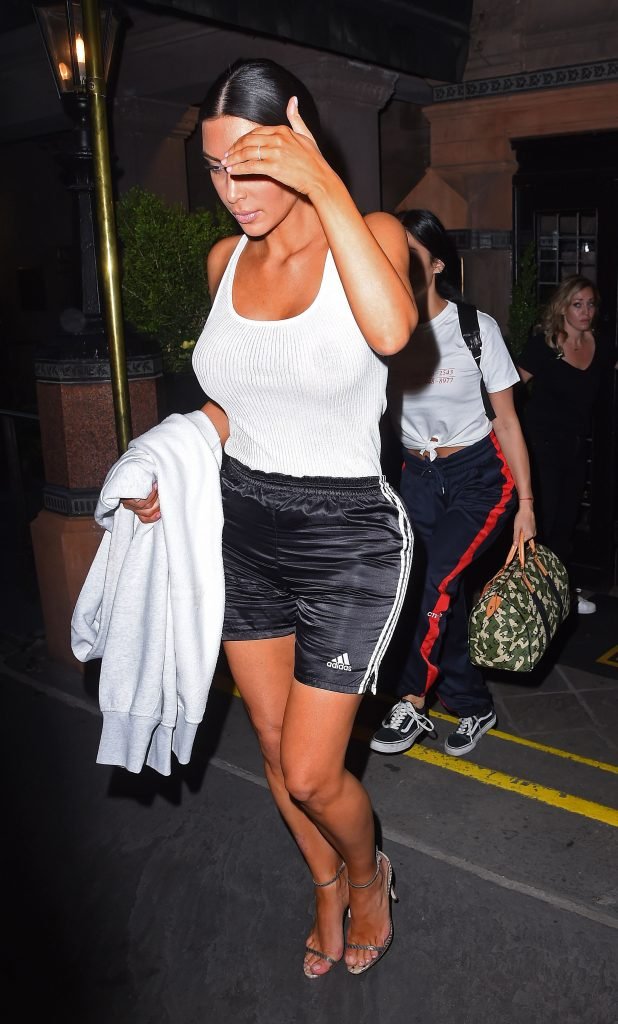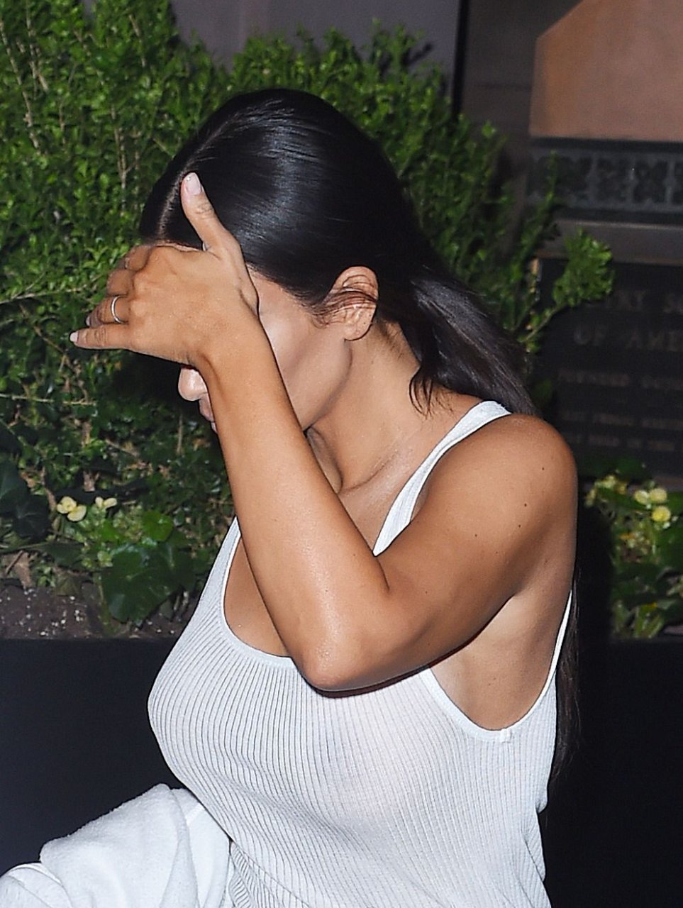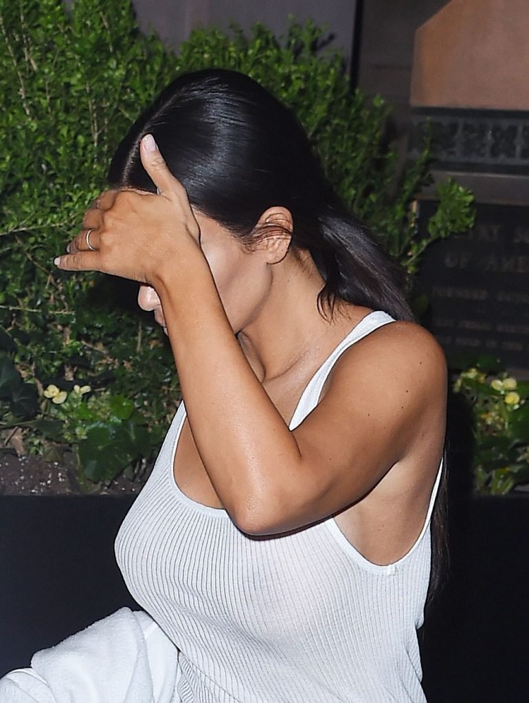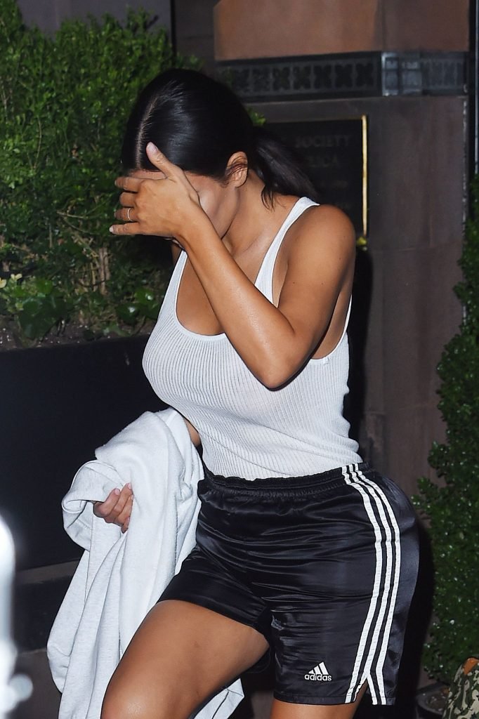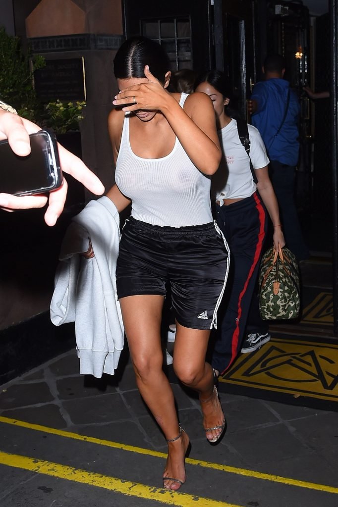 Kim Kardashian sin sostén sale de una sesión de fotos en NYC, 11/07/2017. La estrella de la televisión reality lleva shorts de Adidas y una camiseta blanca sin mangas combinada con tacones.
