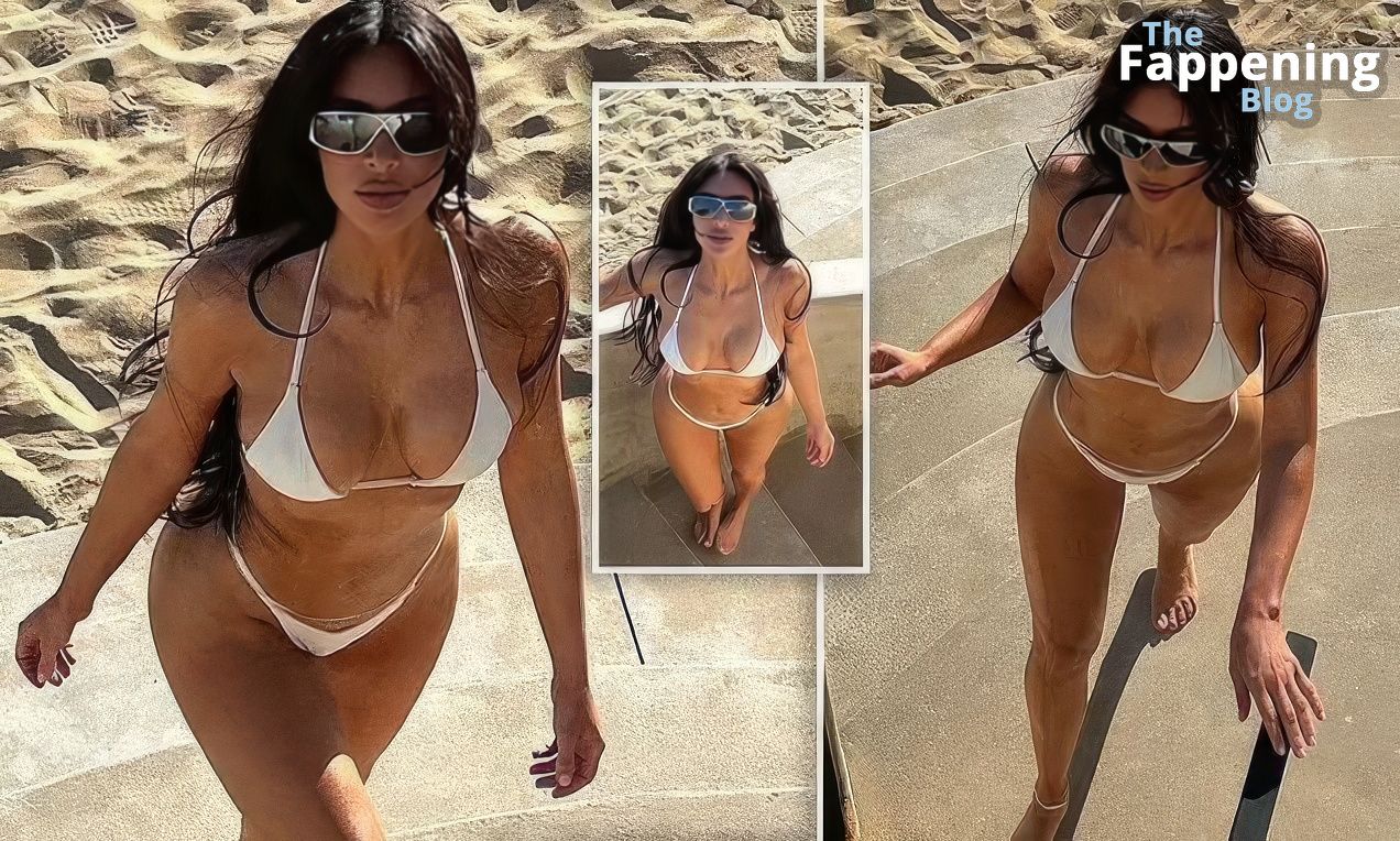 Imágenes tomadas por Kendall Jenner muestran a Kim Kardashian luciendo curvilínea en un bikini blanco, a pesar de las acusaciones de que se había sometido a cirugía para parecerse a Megan Fox – Instagram, 24/02/2023.