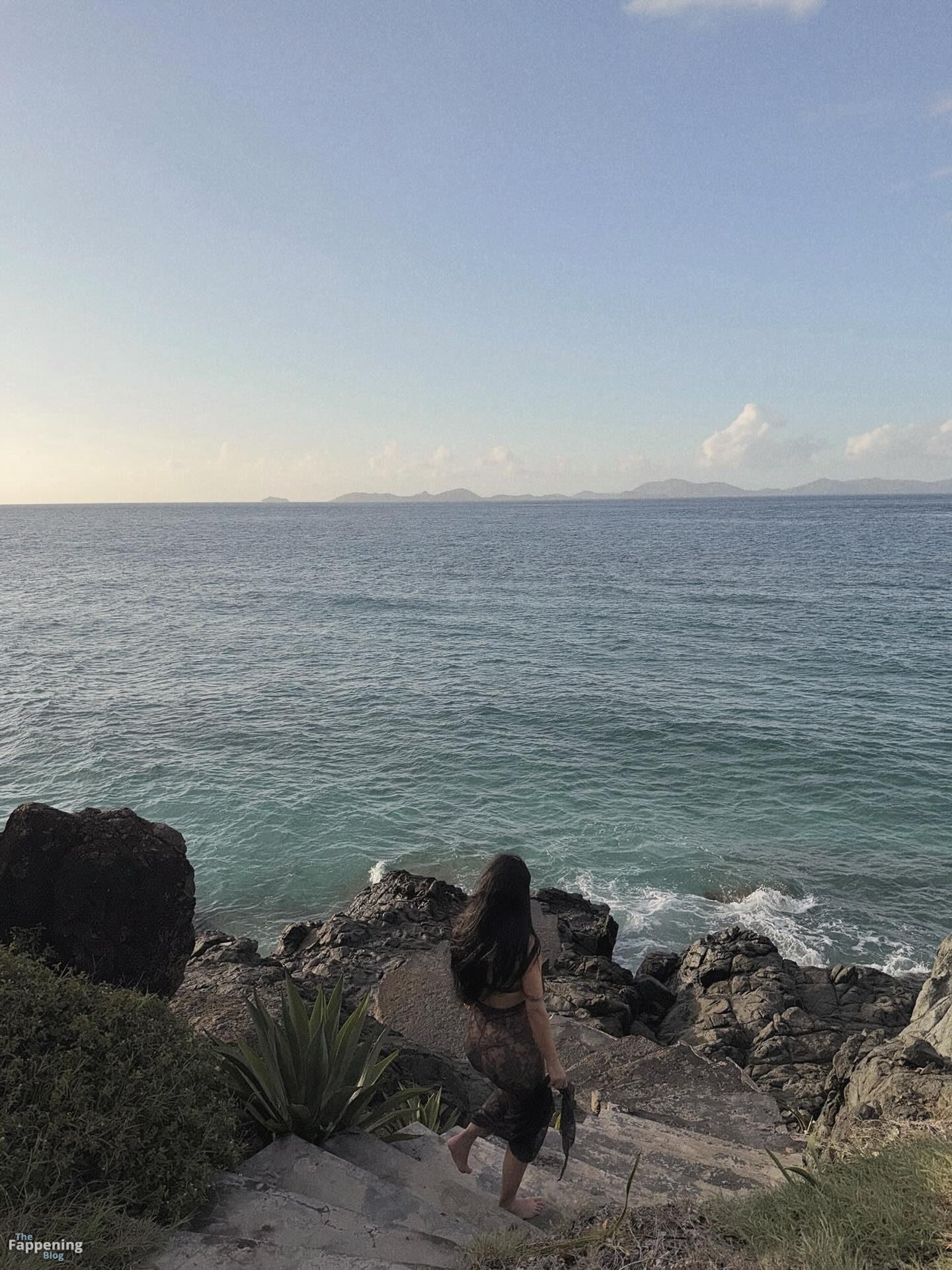 Kim Kardashian está en una sesión de fotos junto a la playa, luciendo un vestido de encaje transparente, mostrando sus pechos y trasero.