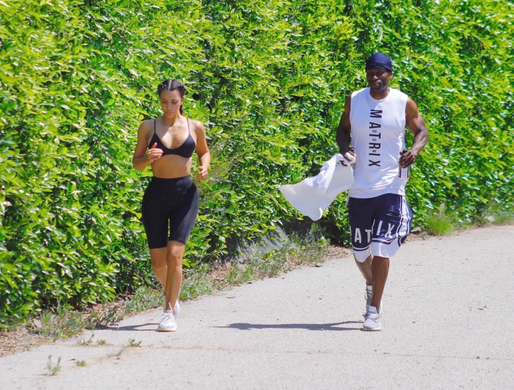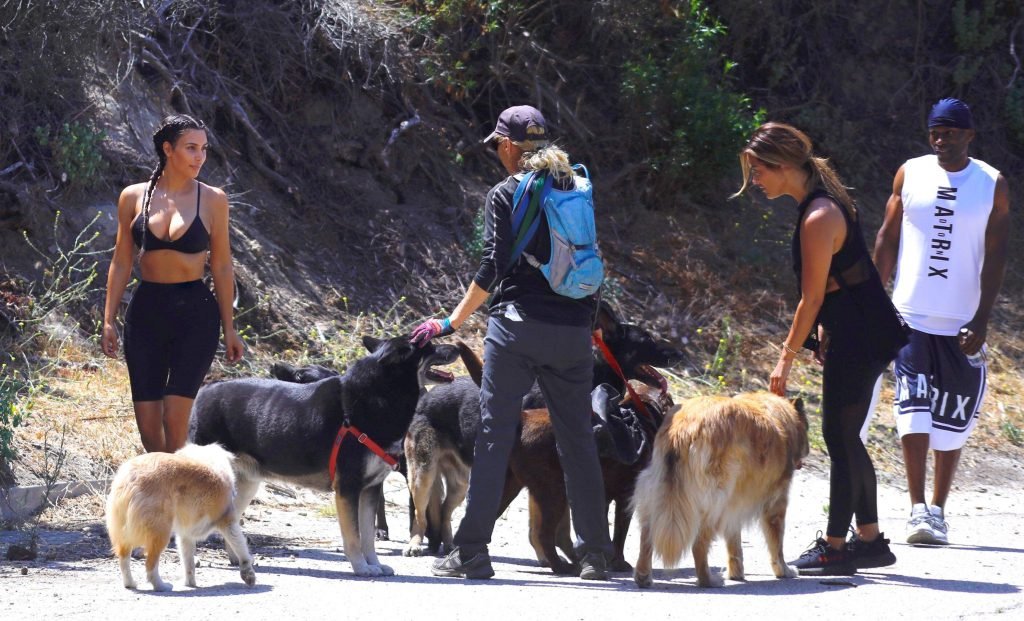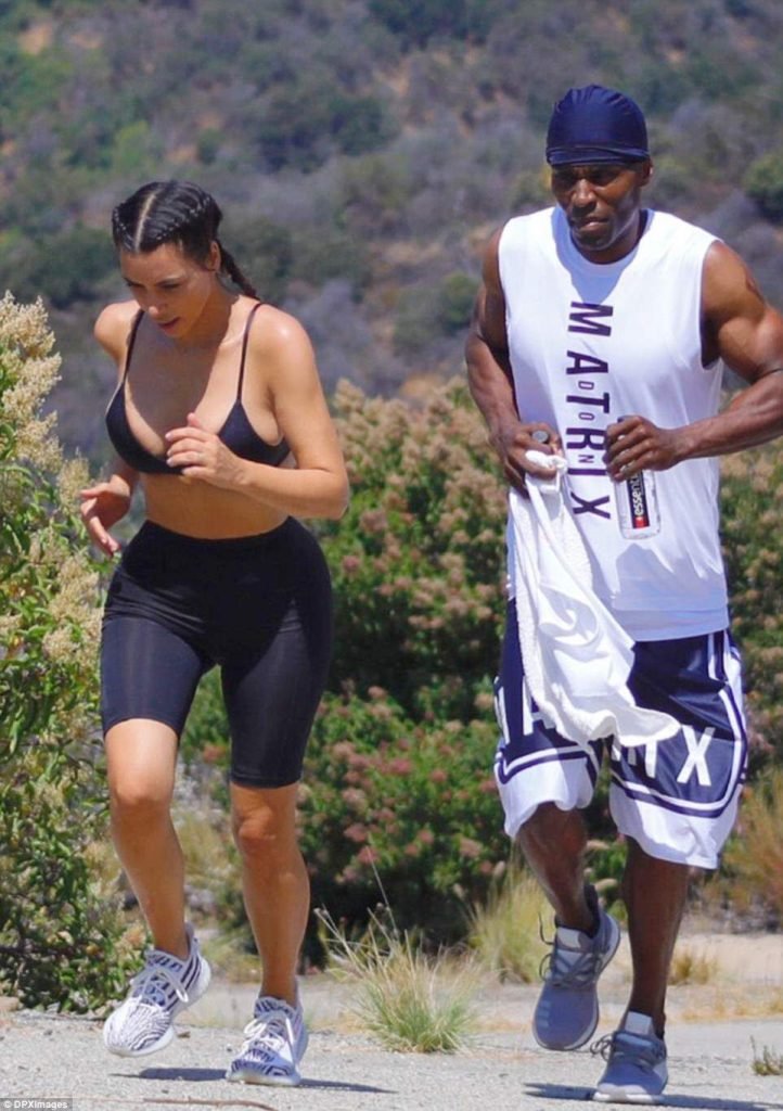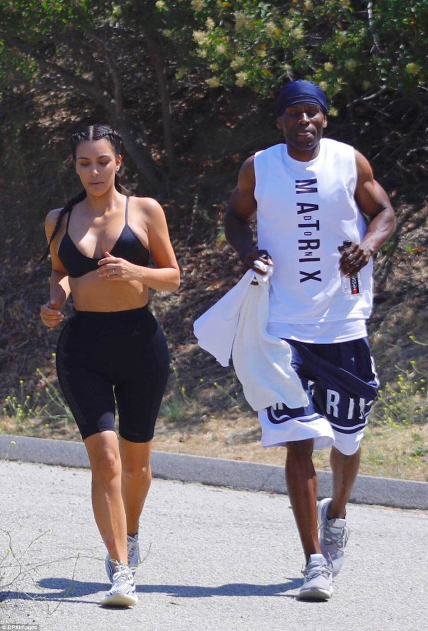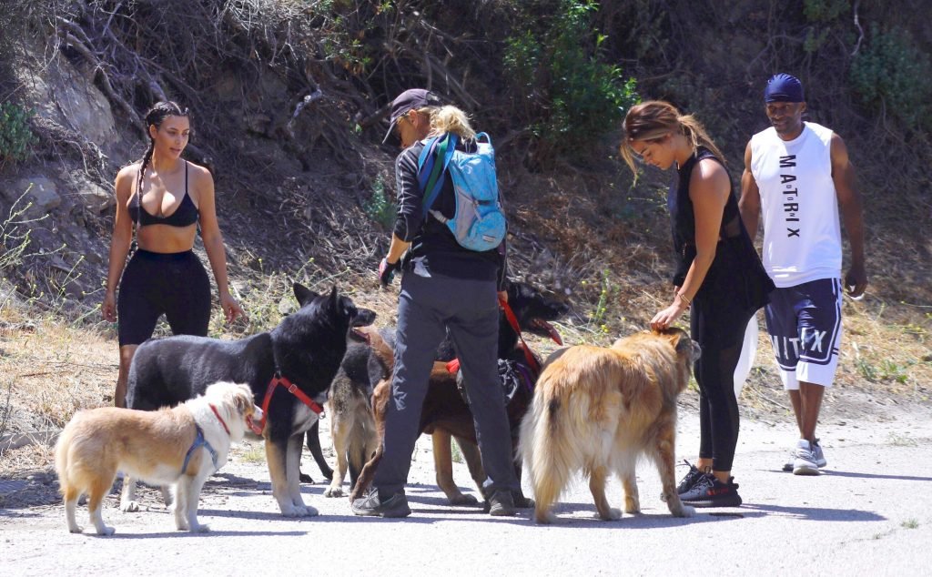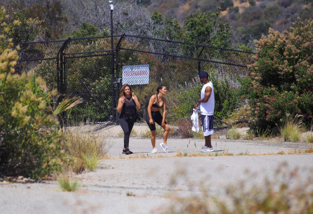 TV-estrella Kim Kardashian muestra su figura falsa con un top de sujetador deportivo y shorts en una agotadora caminata en Fryman Canyon, 07/07/2017.