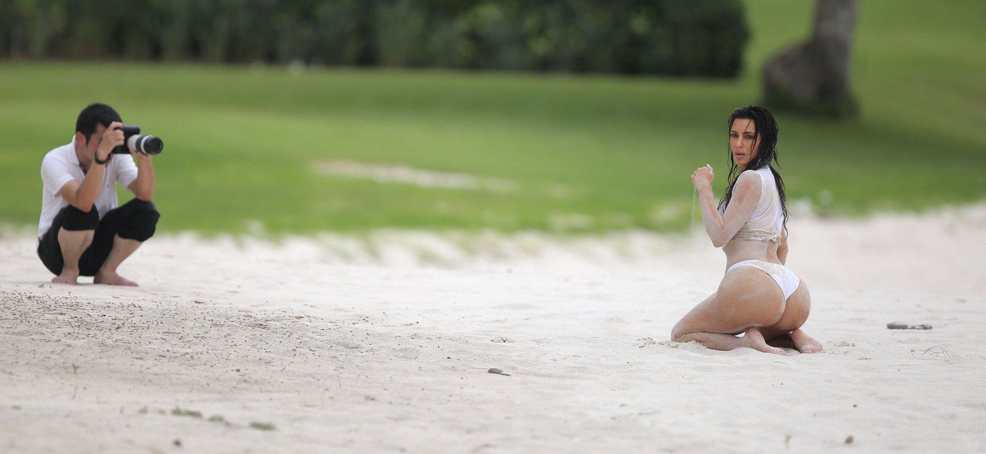 Durante las primeras fotos sólo lleva su bikini.. Pero al final de las fotos, está usando una de esas fundas sin tiras para la zona íntima..