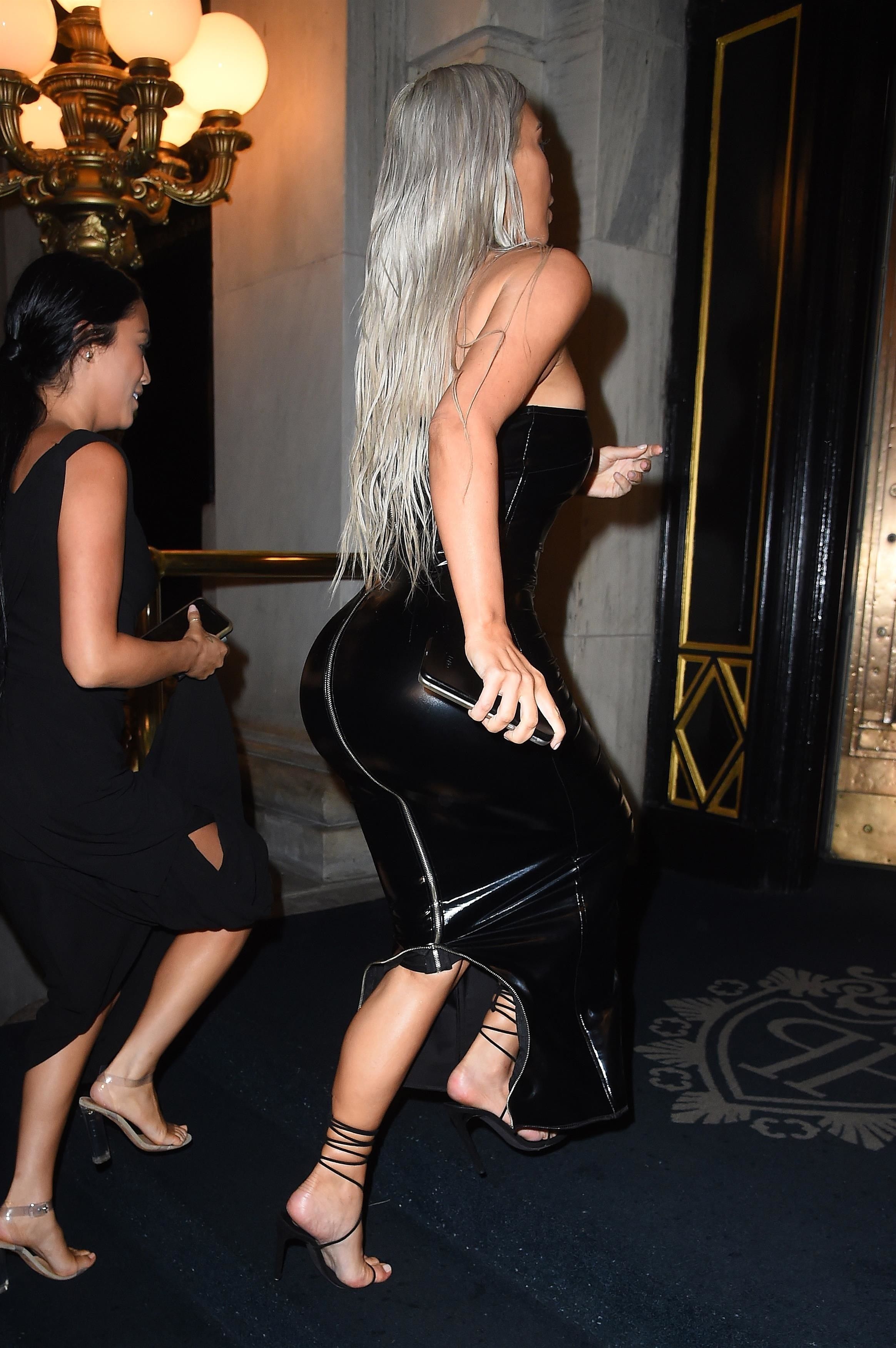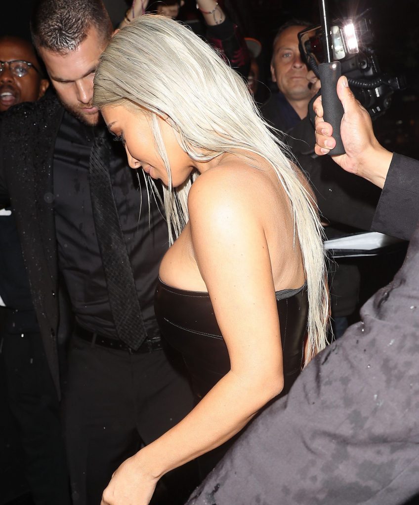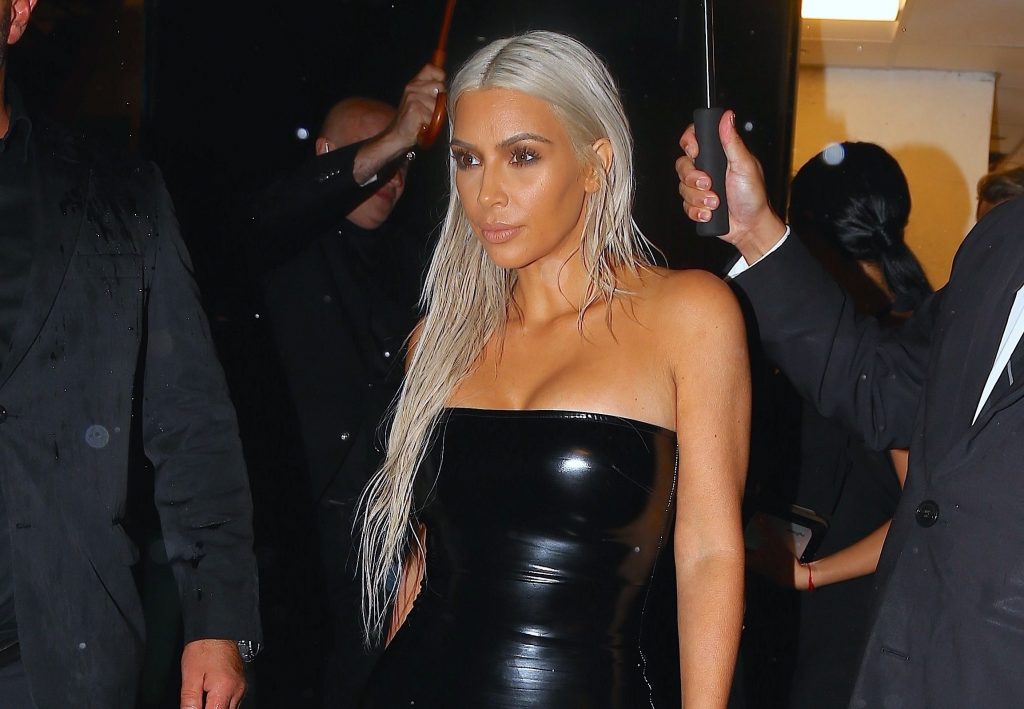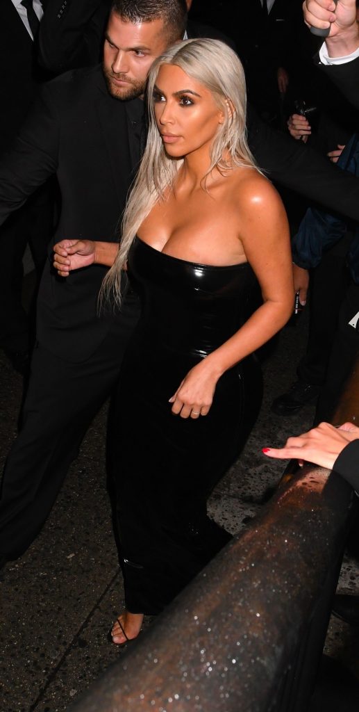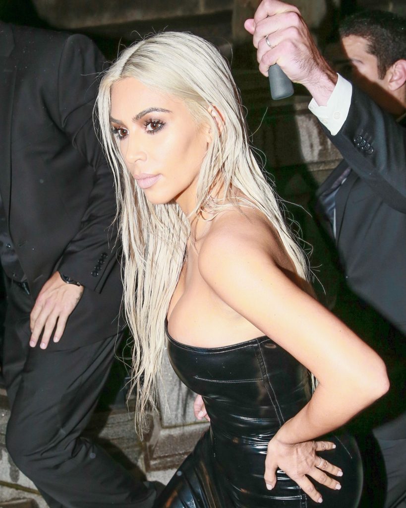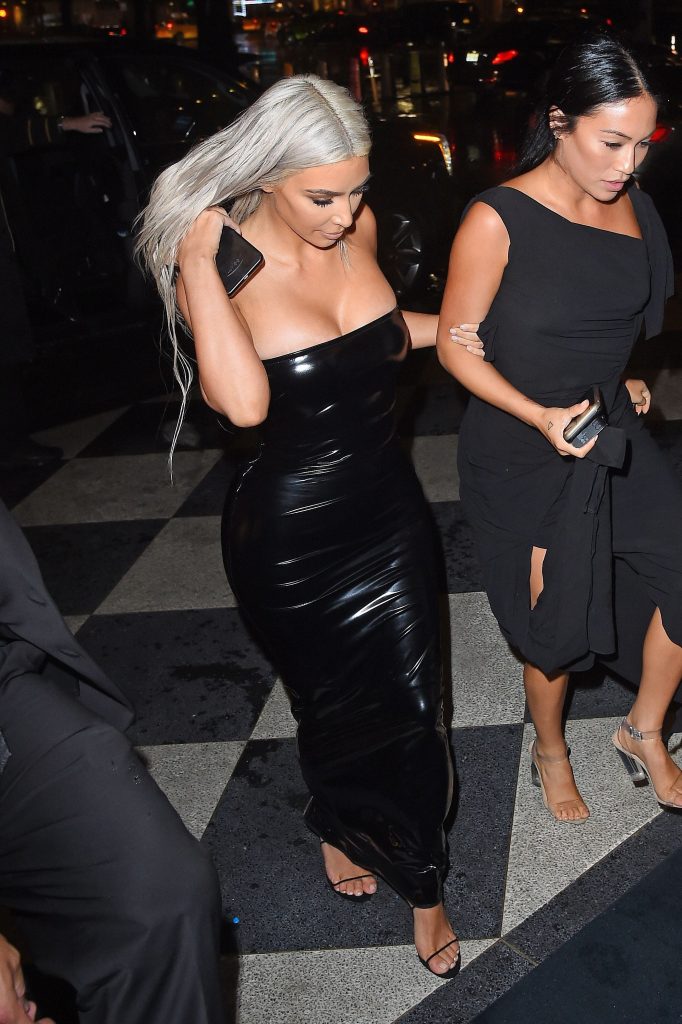 Kim Kardashian (36) sale por la noche con cabello rubio platino y un vestido ajustado de cuero negro durante la Semana de la Moda de Nueva York, 06/09/2017.