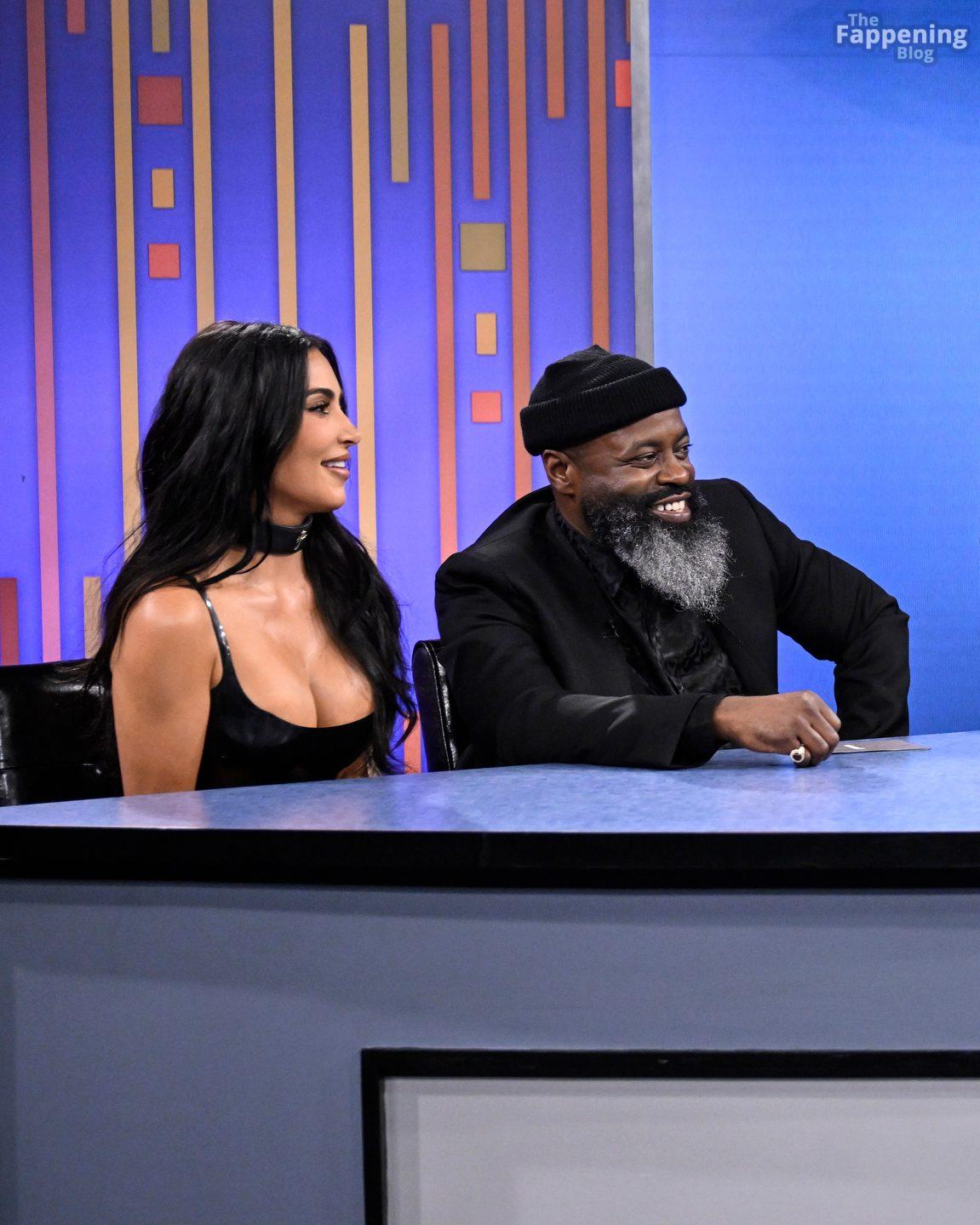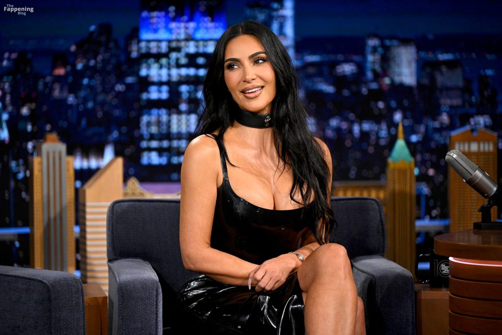 Kim Kardashian deslumbra en el Tonight Show, luciendo un ajustado vestido negro de látex que mostraba su escote y una abertura hasta el muslo.