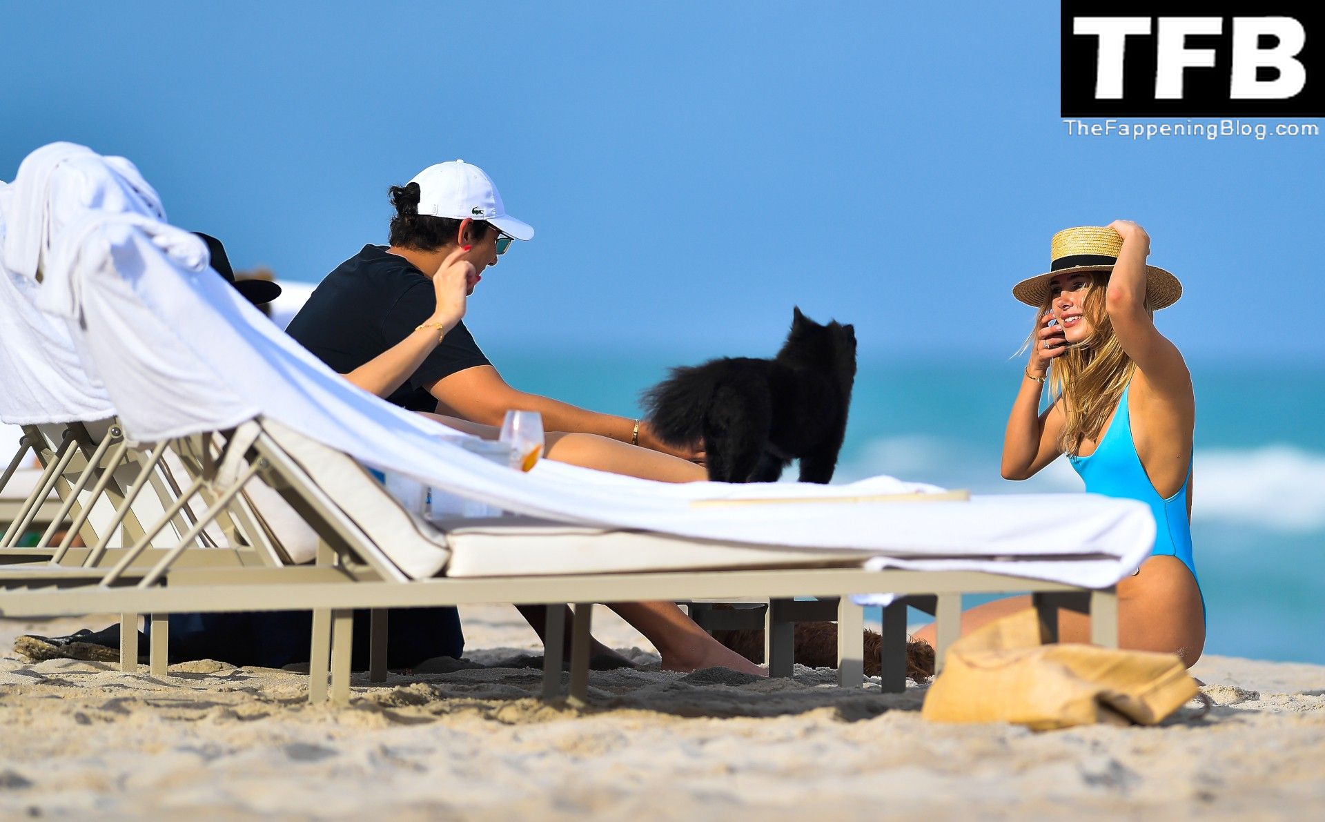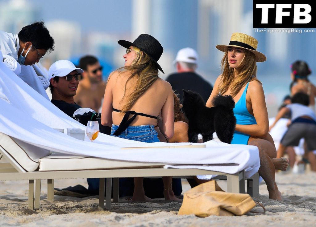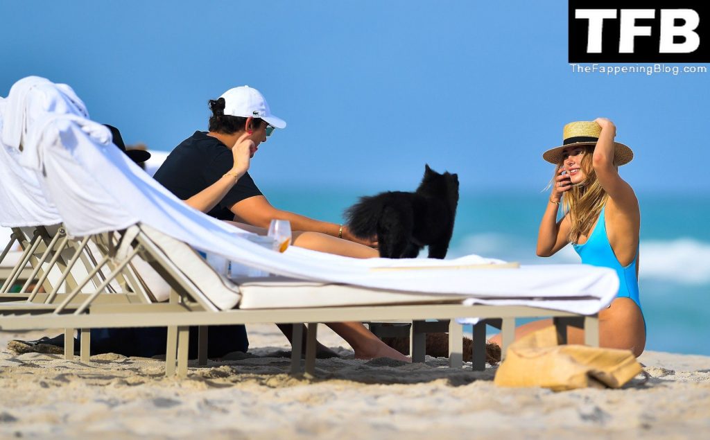 Modelo y diseñadora de trajes de baño Kimberley Garner muestra su increíble figura con un traje de baño azul ceñido mientras juega en el mar durante un viaje a Miami, 19/12/2021.