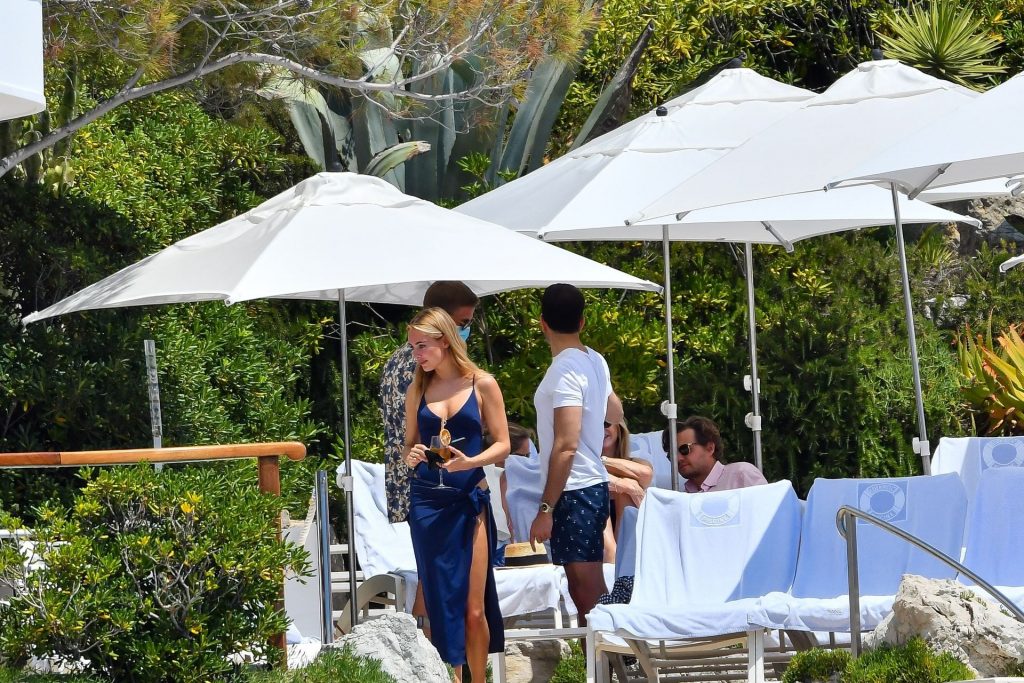 Kimberley Garner es vista con un traje de baño azul en el Hotel du Cap-Eden-Roc en Antibes, en la Riviera Francesa, 07/10/2021.