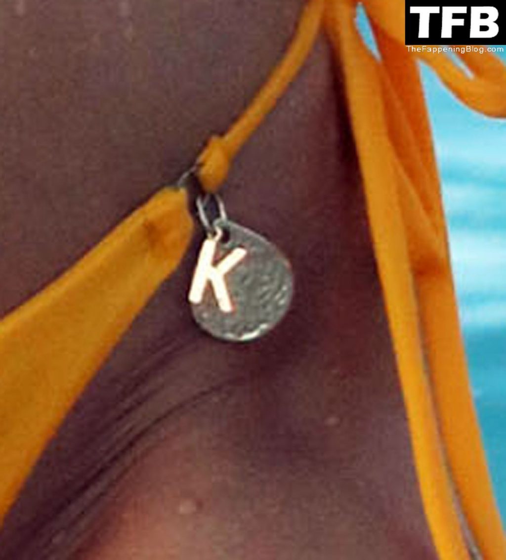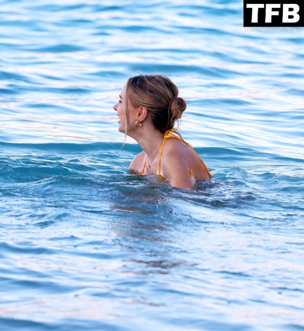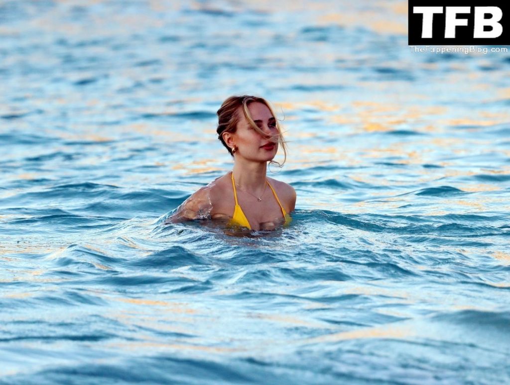Llevando su sexy y atrevido conjunto de bikini amarillo personalizado, Kimberley llamó la atención mientras la estrella sexy llegaba a la playa, mostrando sus curvas voluptuosas y sensuales mientras se refrescaba del calor excesivo con un baño en el mar.