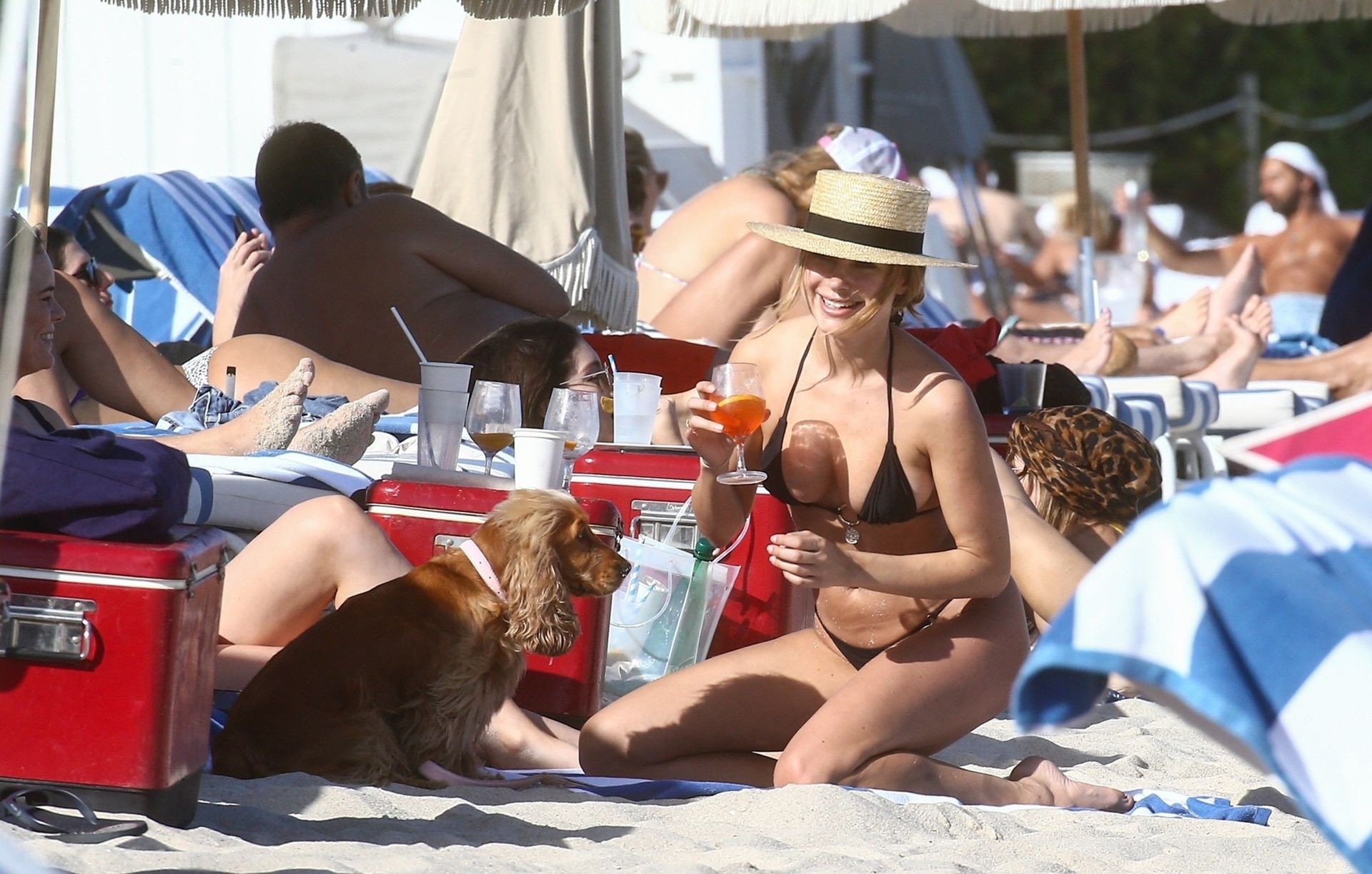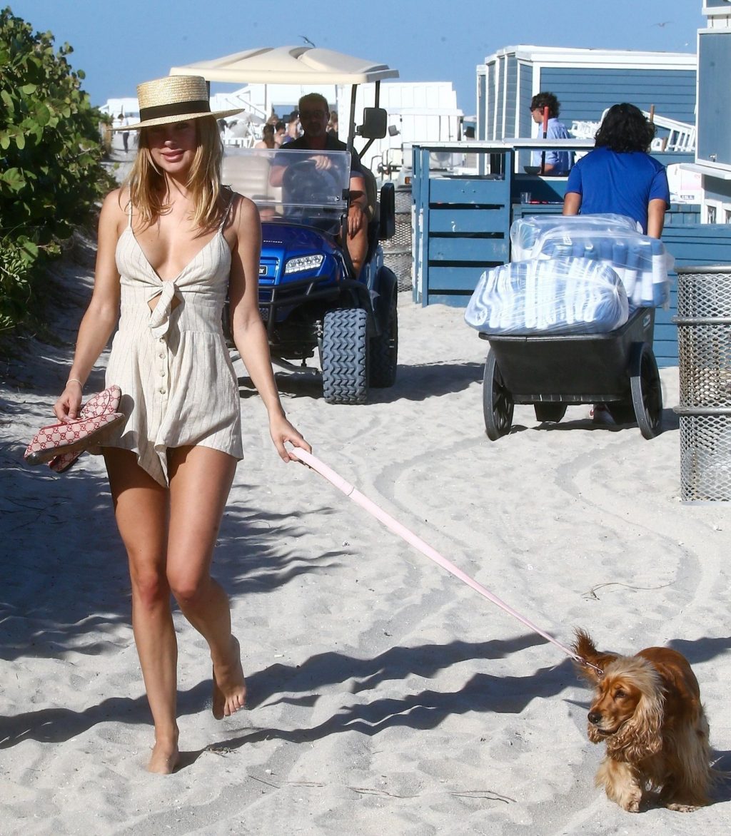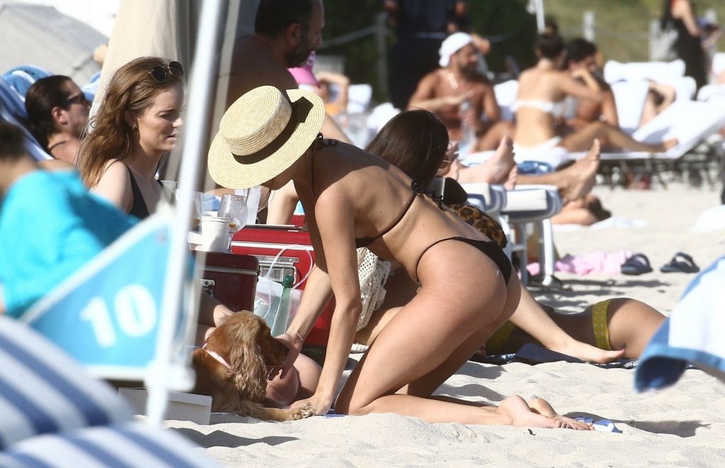 La diseñadora de trajes de baño Kimberley Garner, muestra su figura extremadamente tonificada mientras descansa en la arena en la soleada Miami Beach, 13/01/2020. La influencer británica de moda luego se dirige a la ducha al aire libre para limpiarse el trasero arenoso.