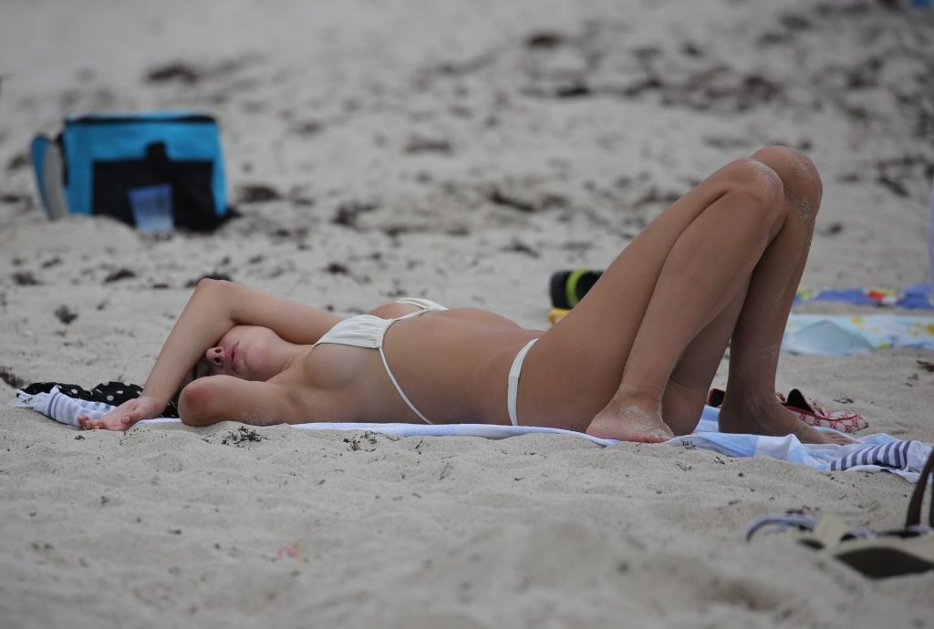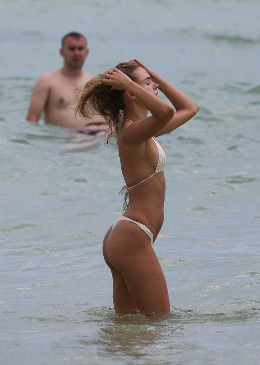 British hottie Kimberley Garner wears a white bikini from her own line as she relaxes on the beach in Miami, 04/02/2019.