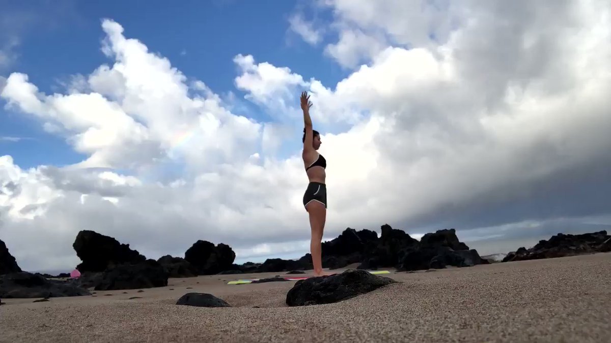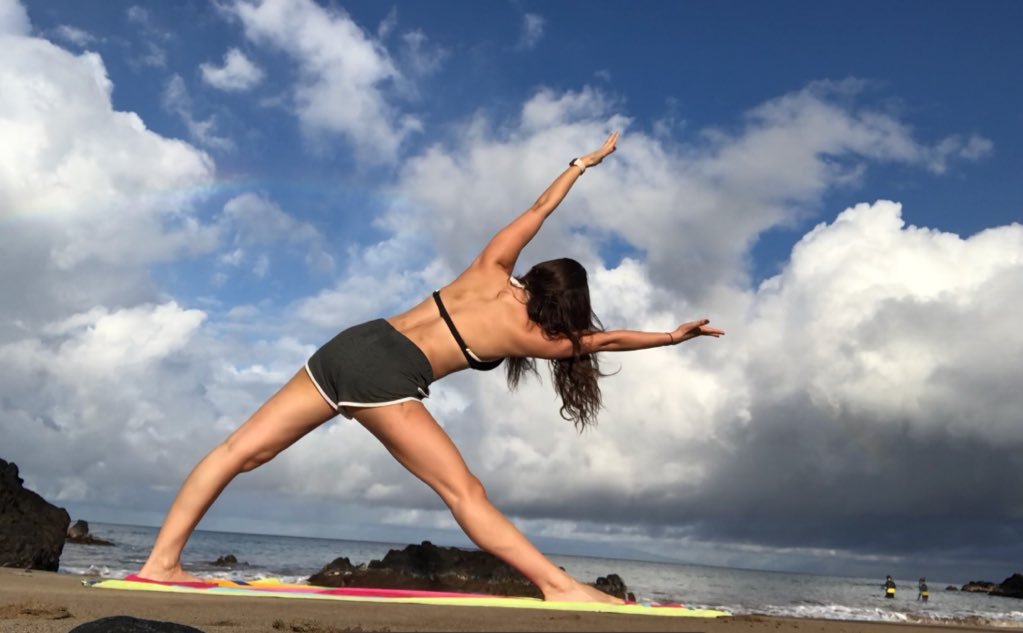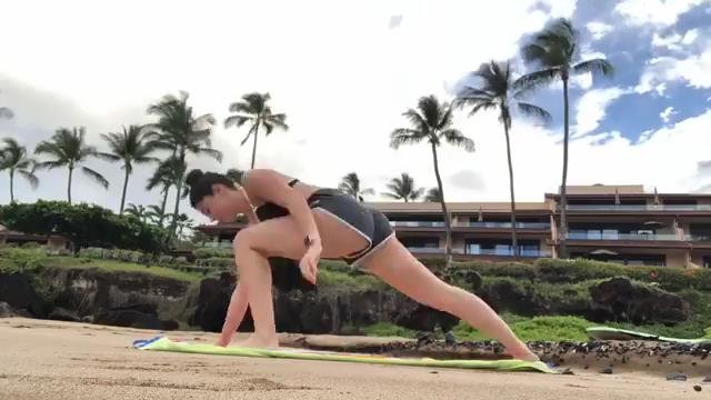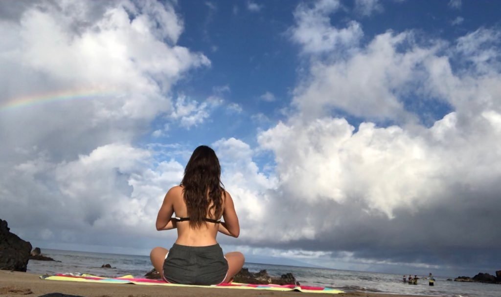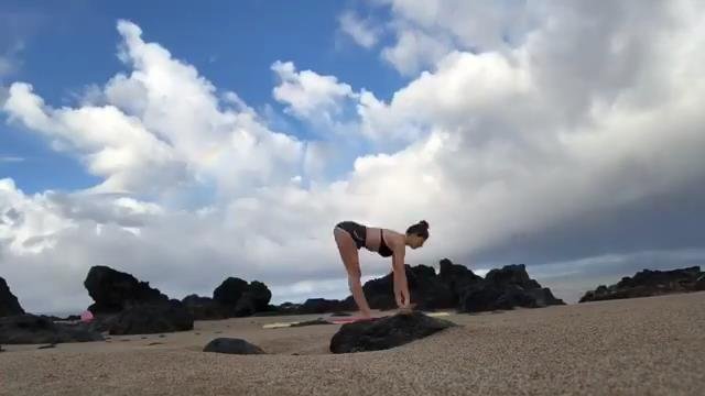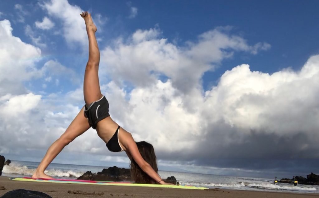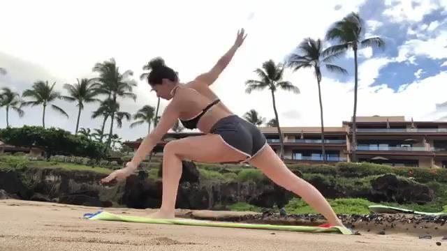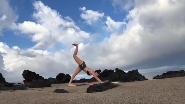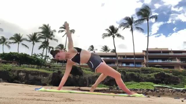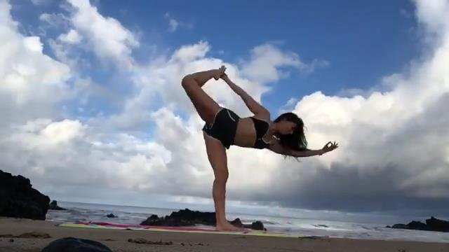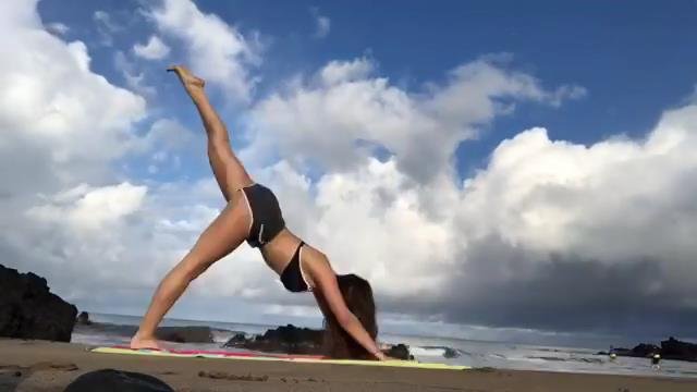 Un pequeño fragmento de la práctica de yoga de Kira Kosarin en la playa esta mañana. Kira Kosarin es una actriz de televisión (The Thundermans) de Boca Raton, Florida. Edad – 20.