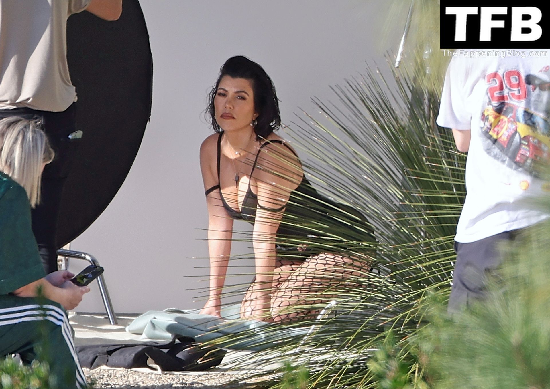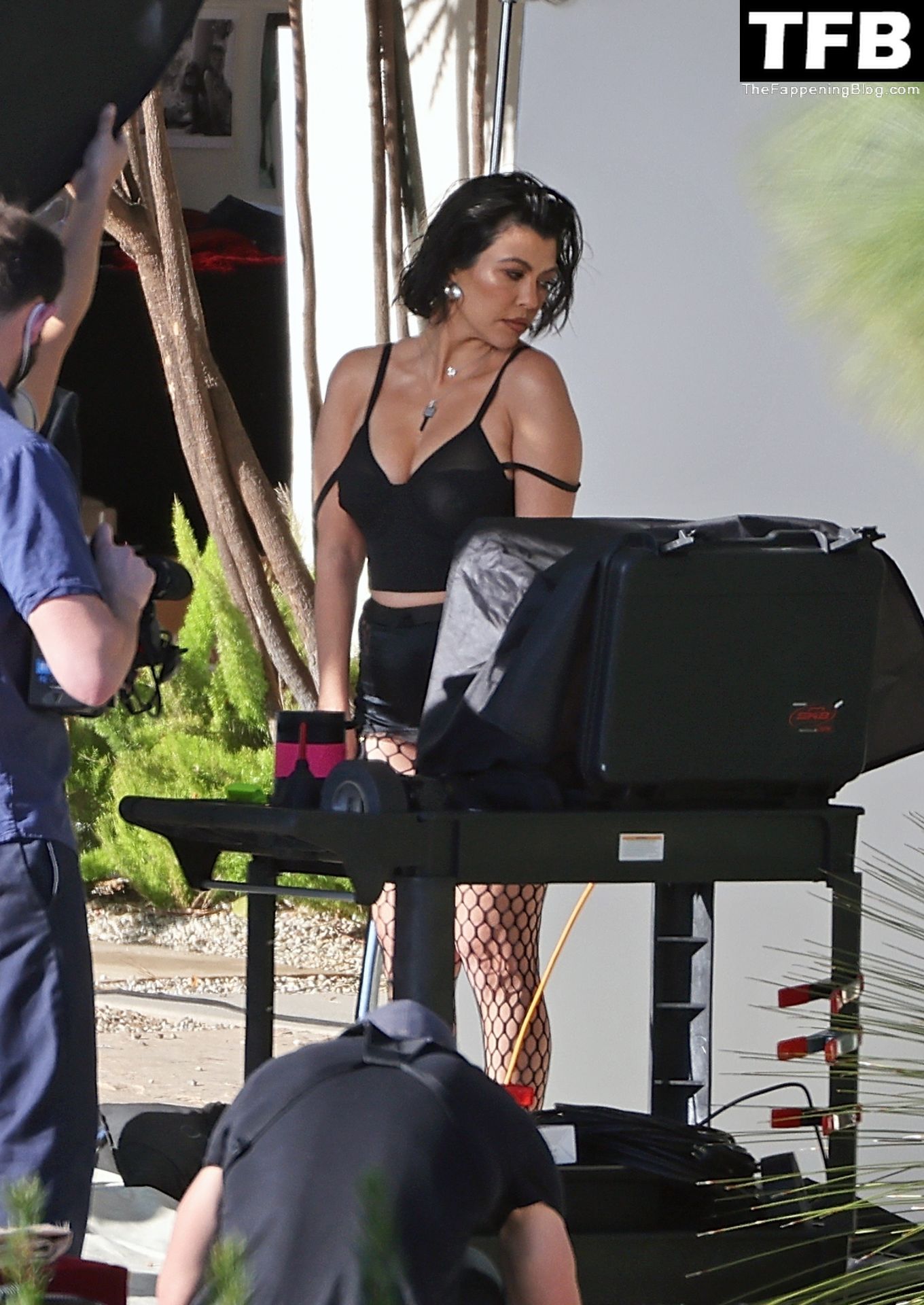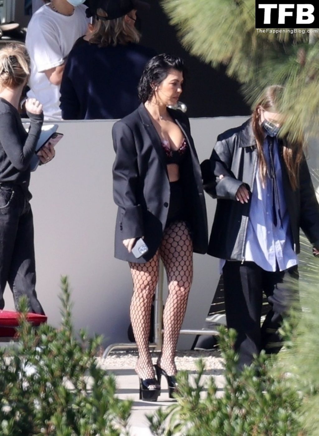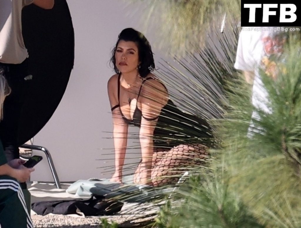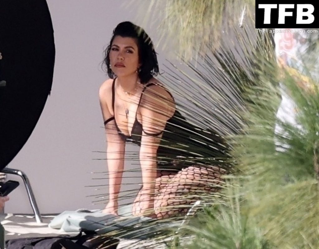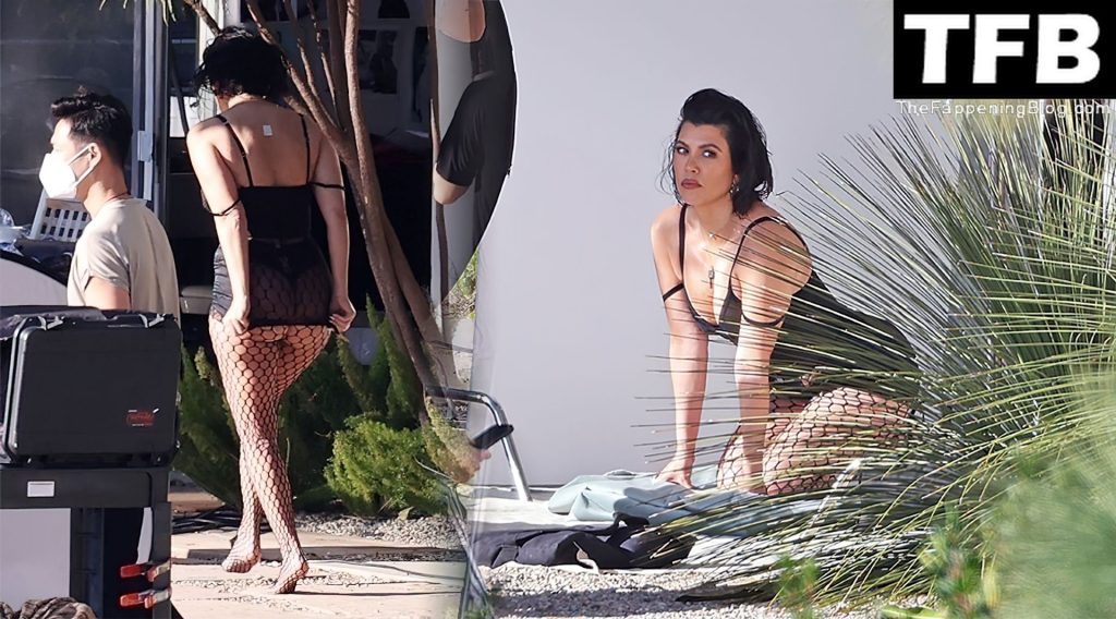 La estrella de reality posó con varios looks atrevidos de lencería el martes, incluyendo uno con un accesorio de aro en el pezón. Kourtney fue vista con un bustier negro y tanga con liguero sobre medias de red ancha y tacones de aguja de charol altísimos. En otro look, el sujetador negro y la blusa de malla de Kourtney mostraban un aro en el pezón adherido al exterior.