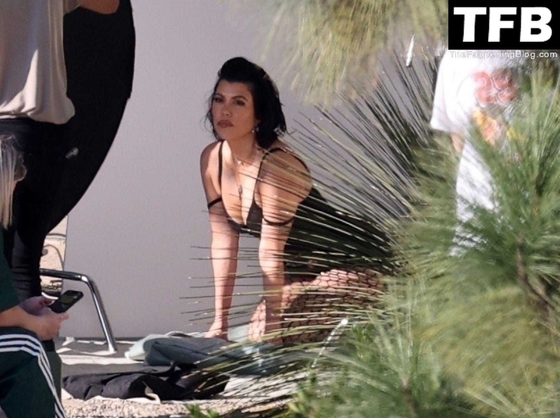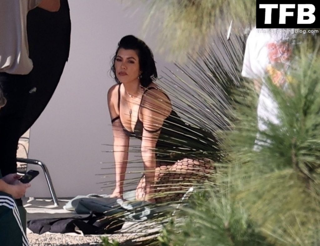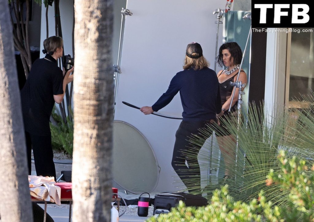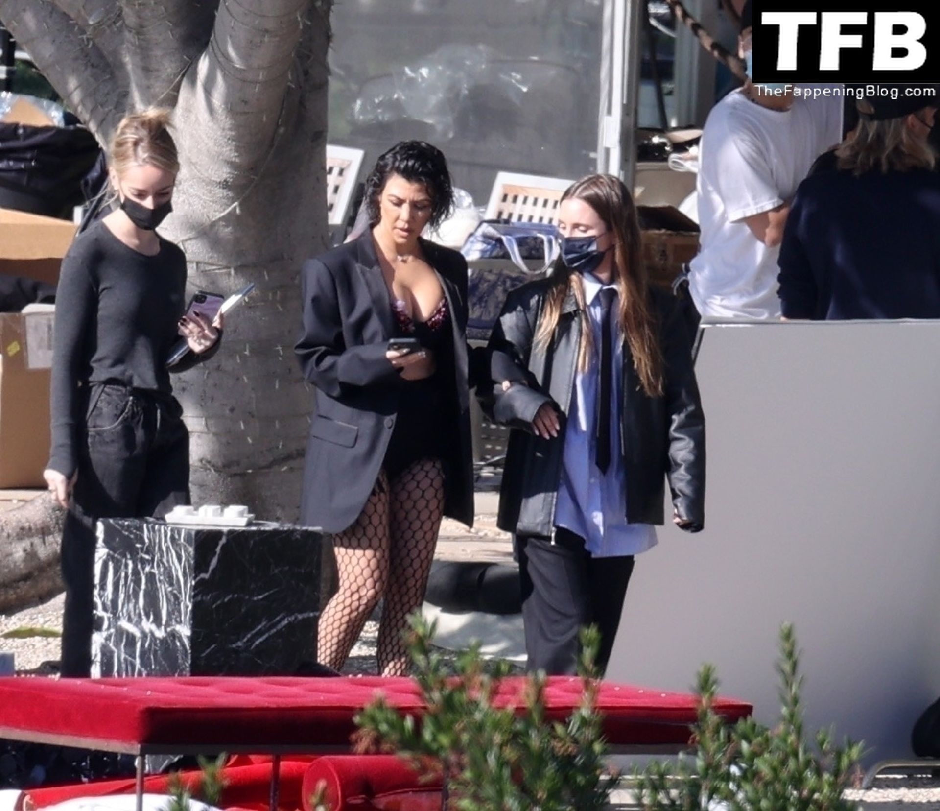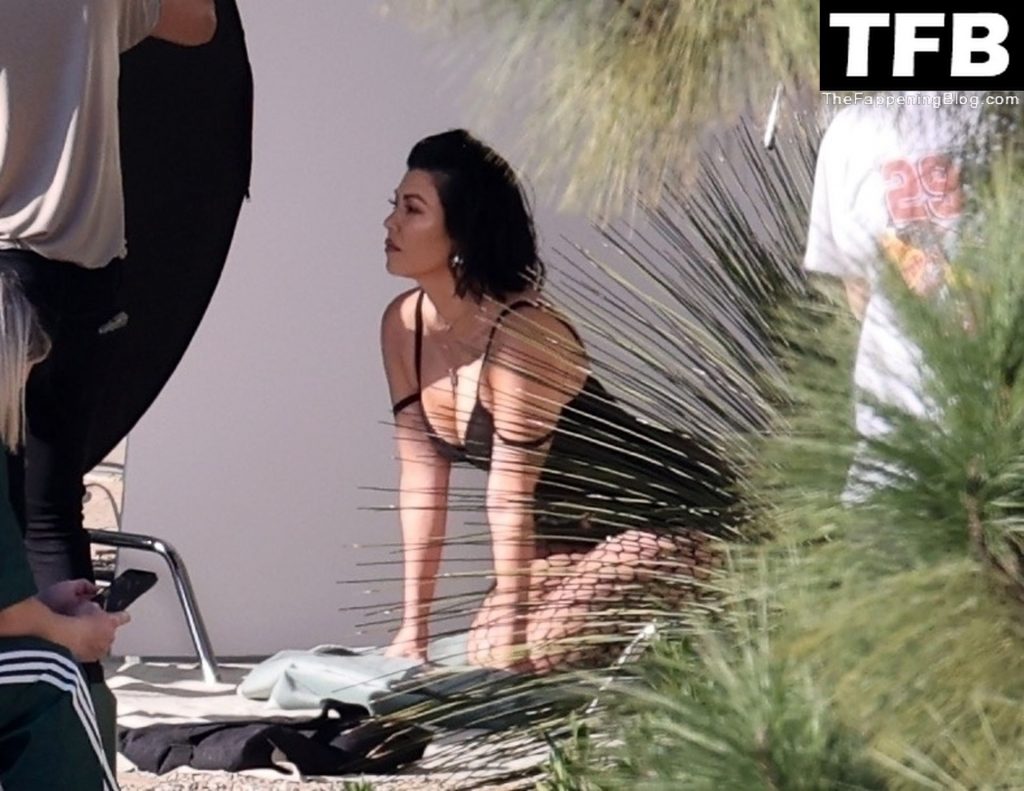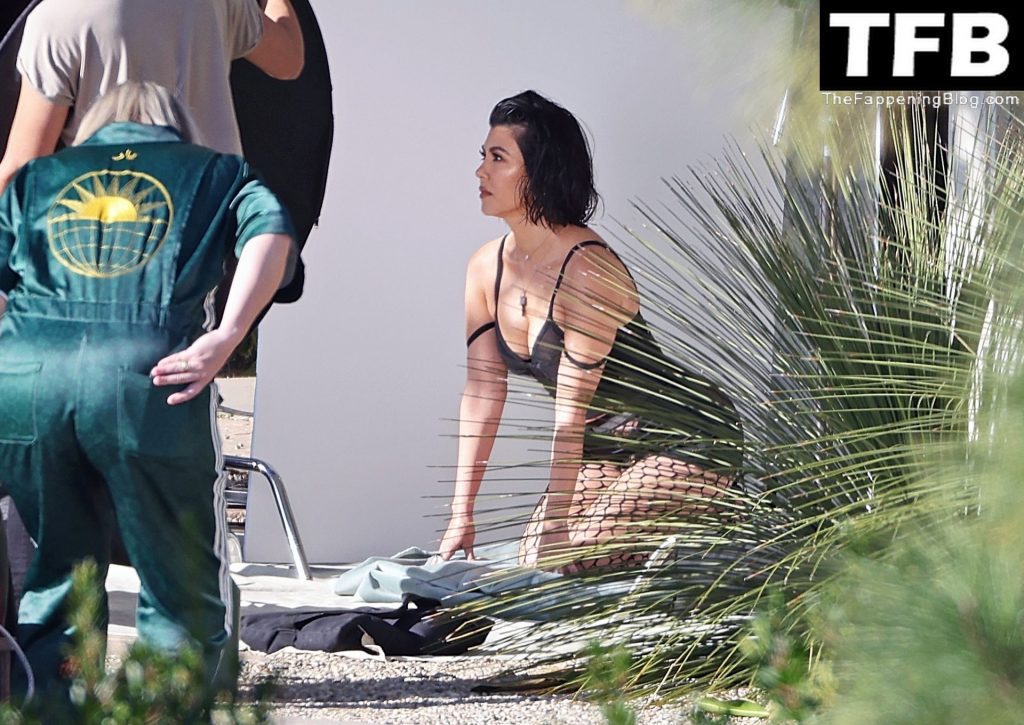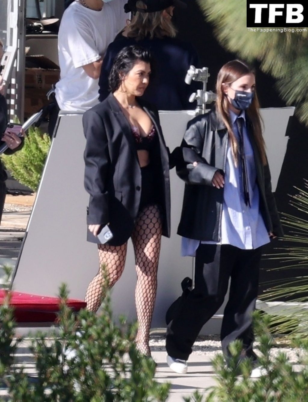 La estrella de reality posó con varios looks atrevidos de lencería el martes, incluyendo uno con un accesorio de aro en el pezón. Kourtney fue vista con un bustier negro y tanga con liguero sobre medias de red ancha y tacones de aguja de charol altísimos. En otro look, el sujetador negro y la blusa de malla de Kourtney mostraban un aro en el pezón adherido al exterior.
