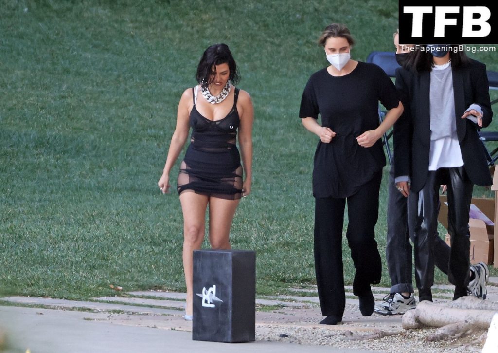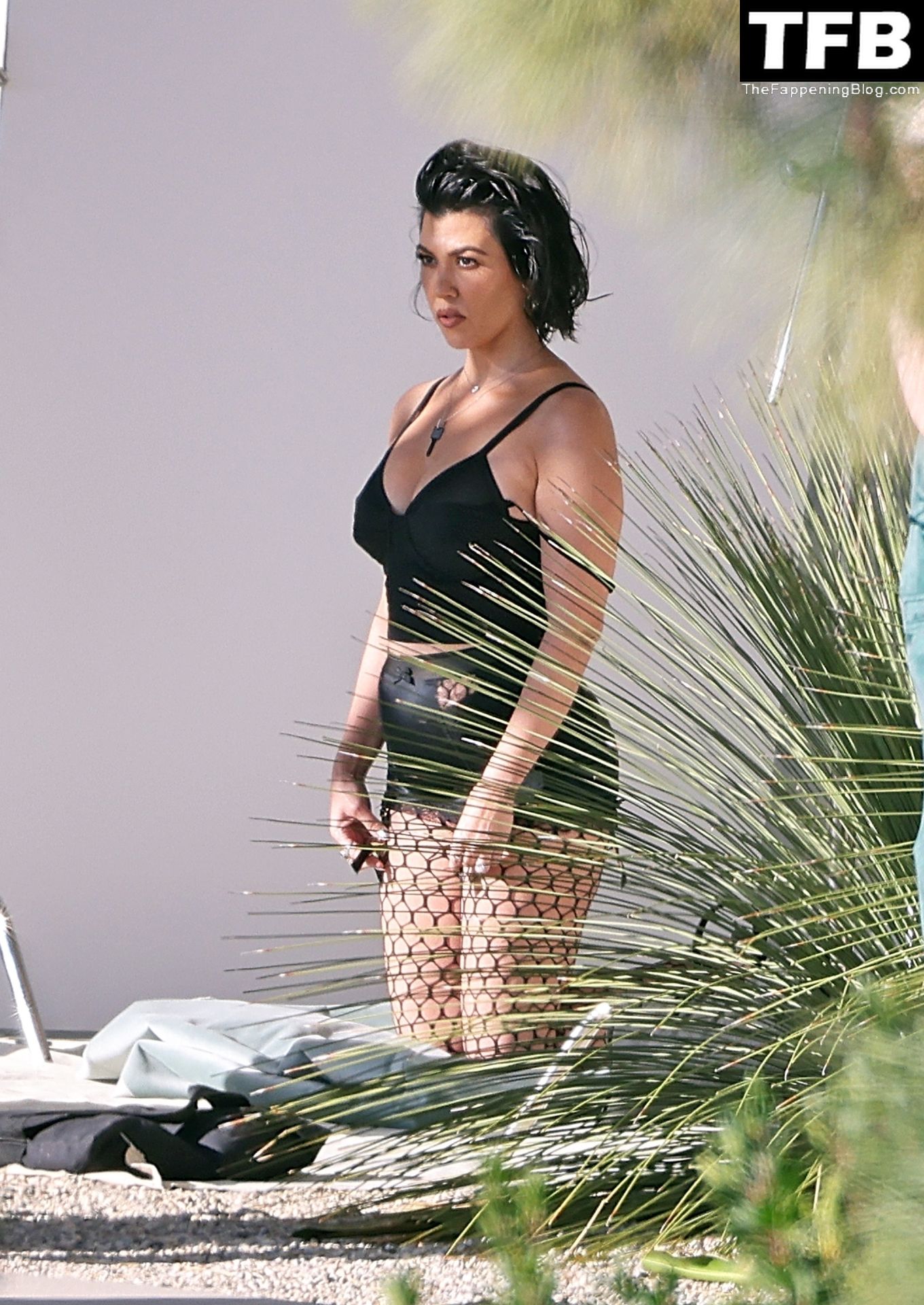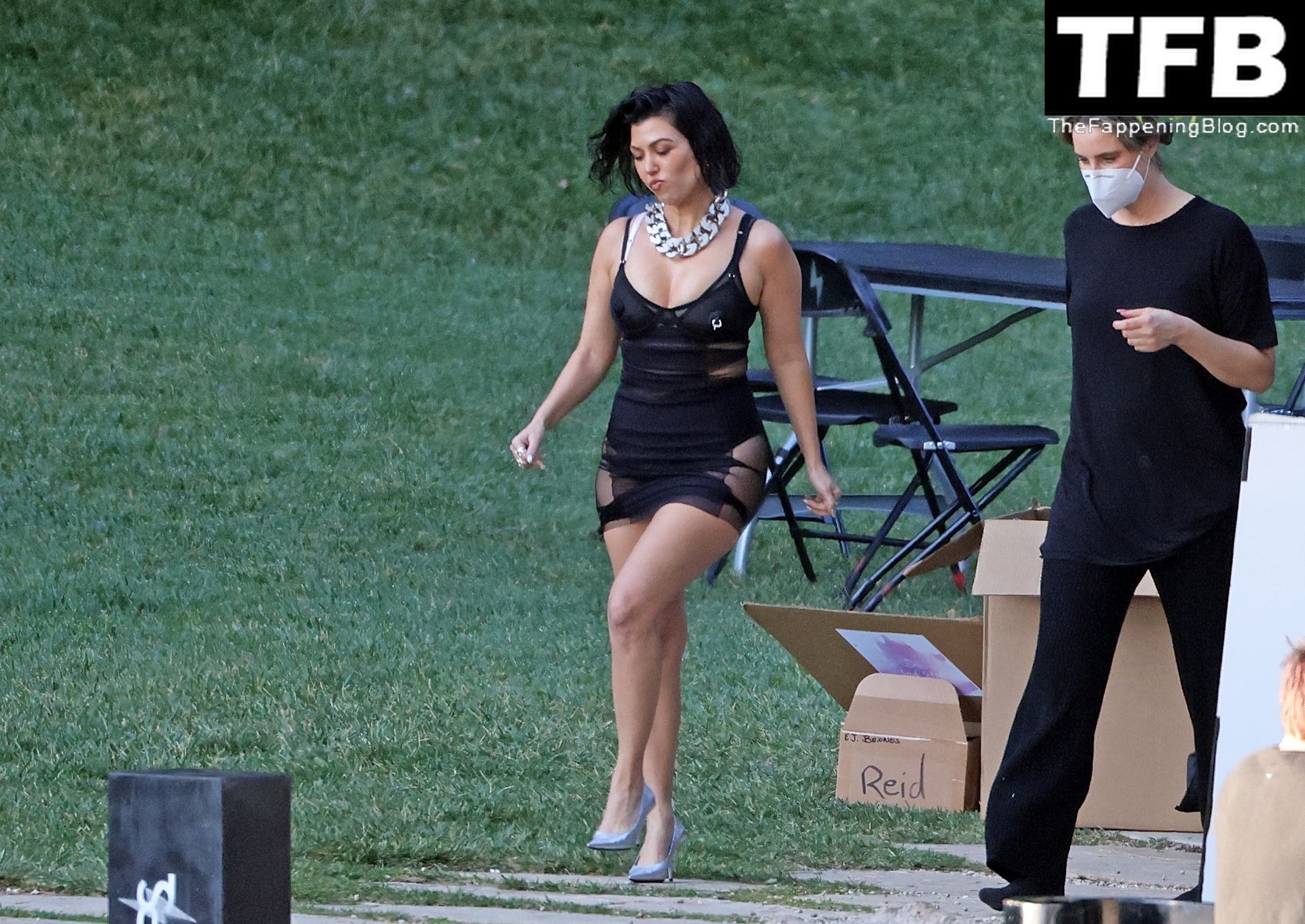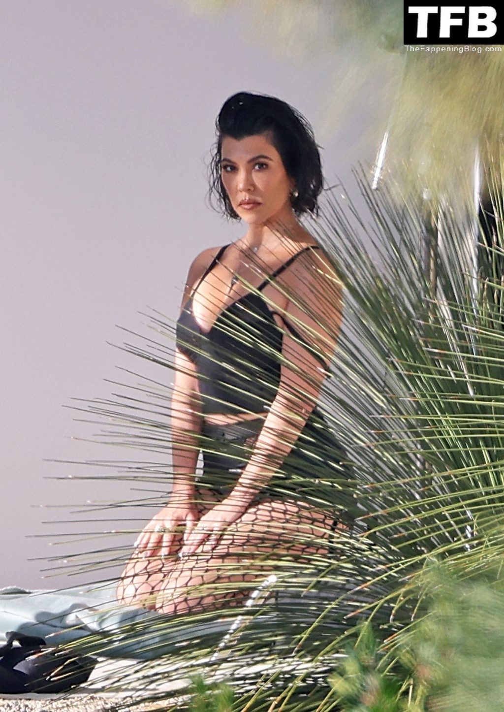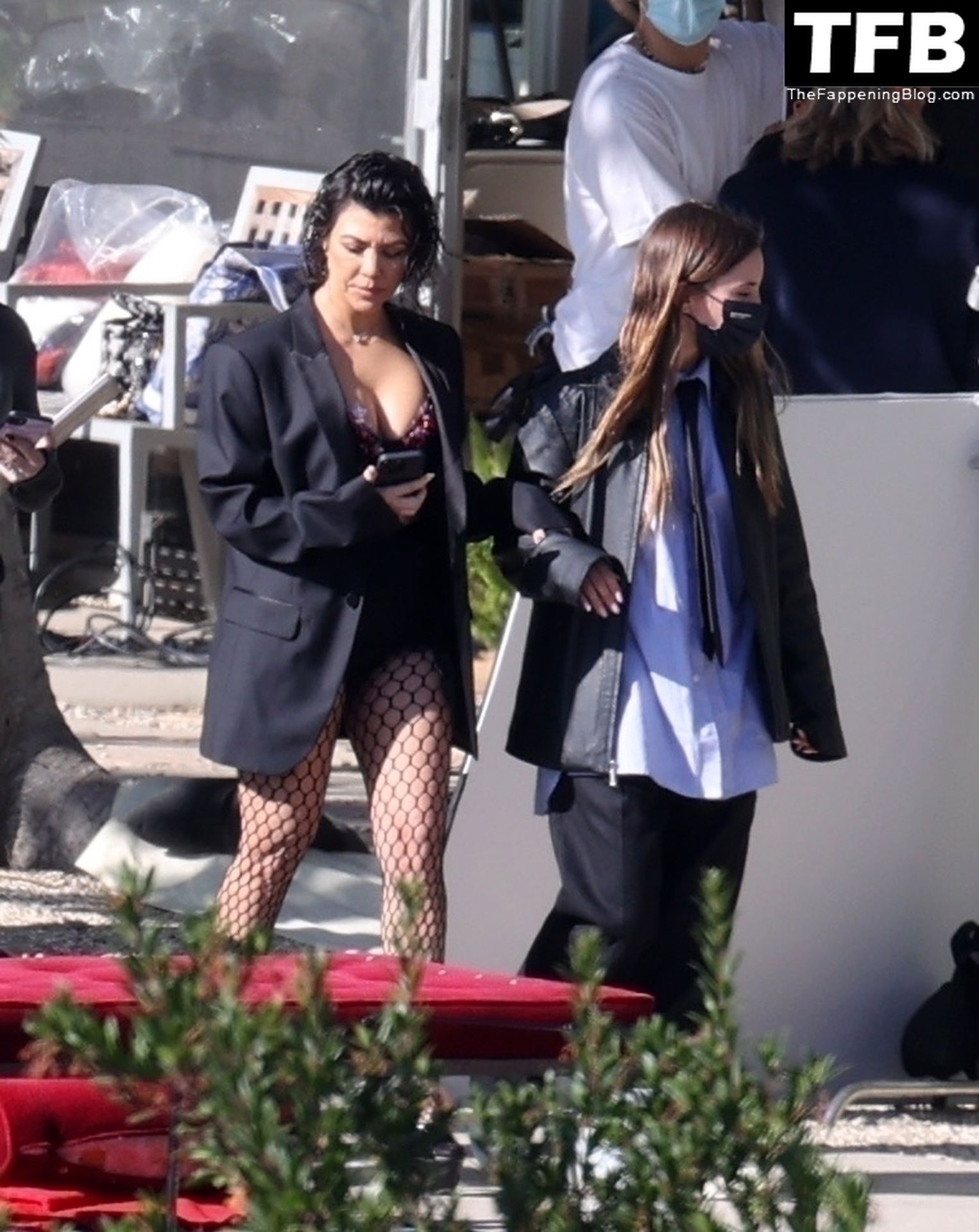 La estrella de reality posó con varios looks atrevidos de lencería el martes, incluyendo uno con un accesorio de aro en el pezón. Kourtney fue vista con un bustier negro y tanga con liguero sobre medias de red ancha y tacones de aguja de charol altísimos. En otro look, el sujetador negro y la blusa de malla de Kourtney mostraban un aro en el pezón adherido al exterior.