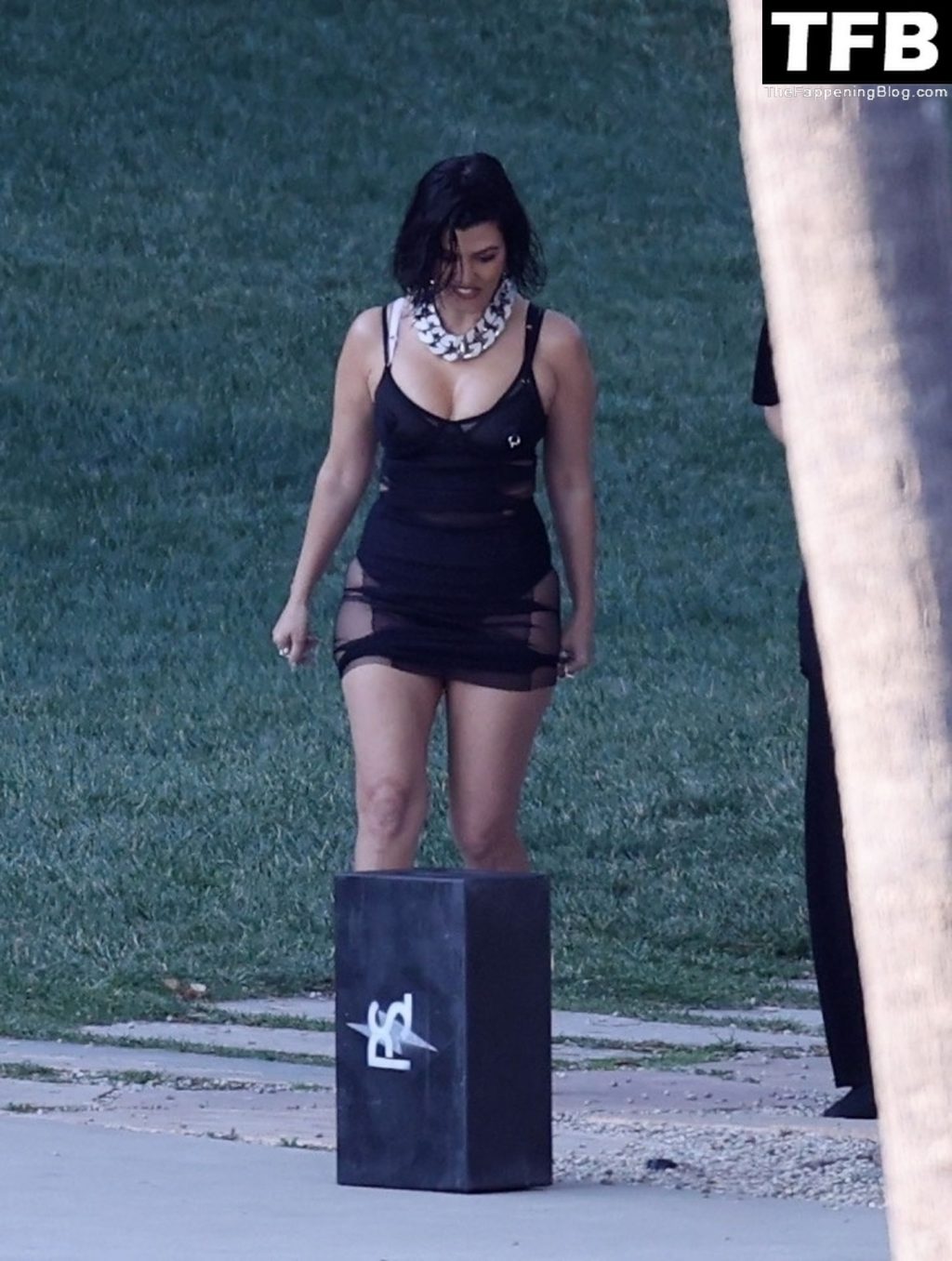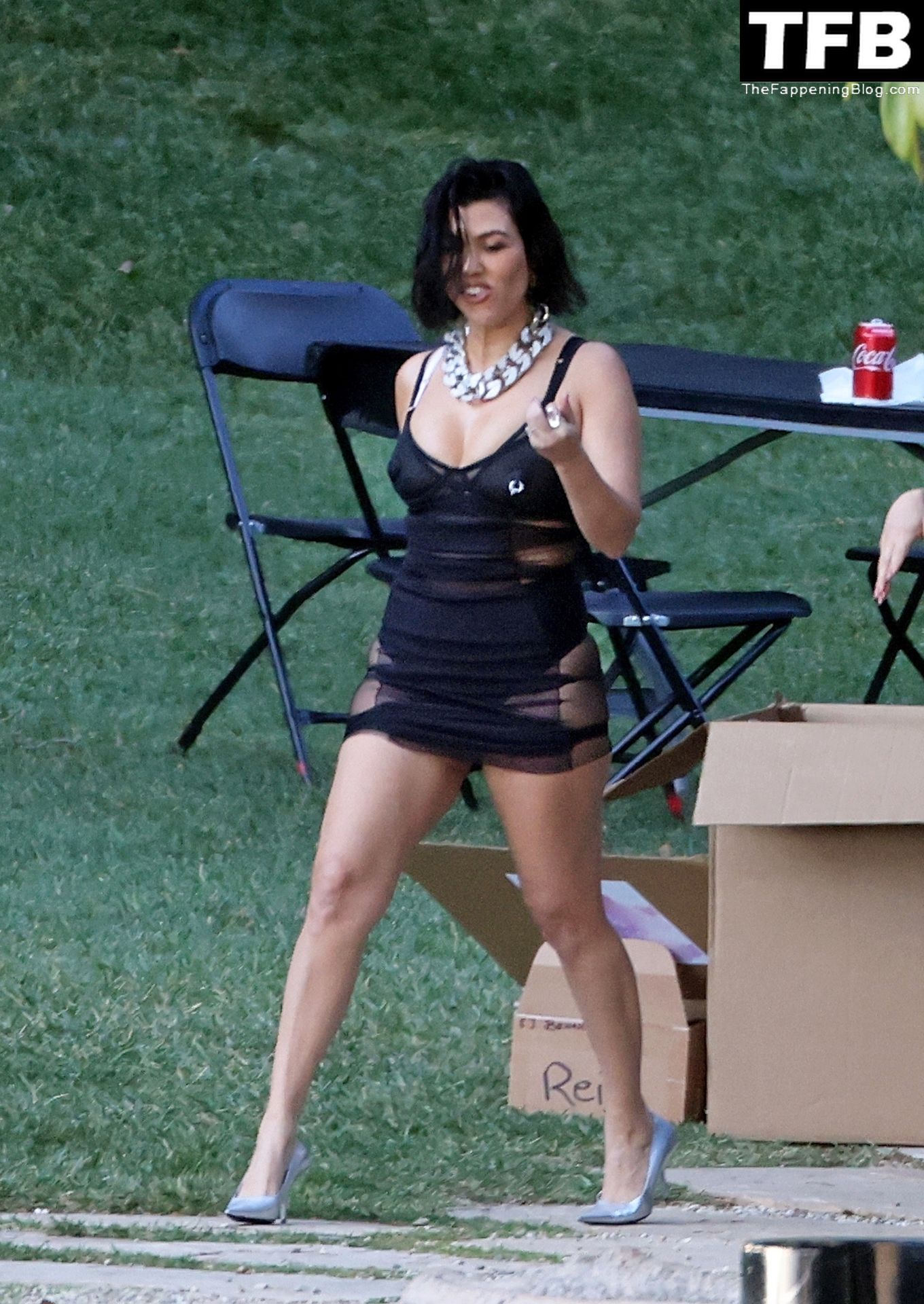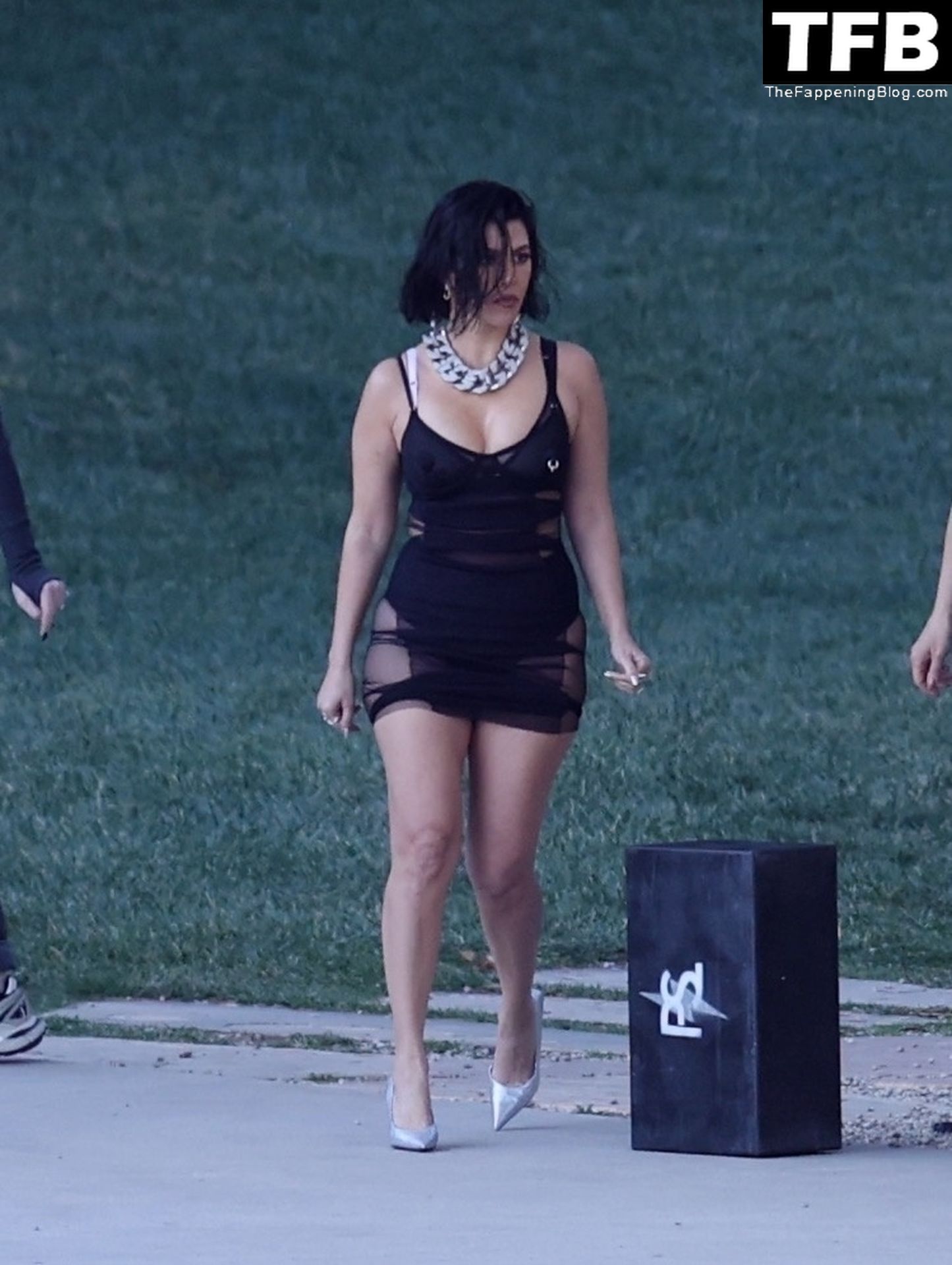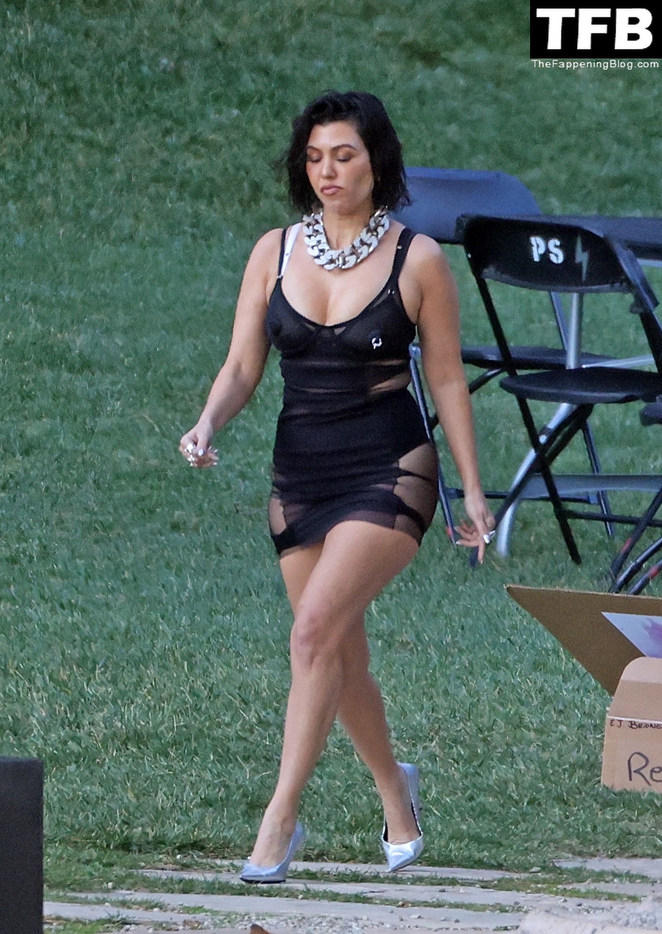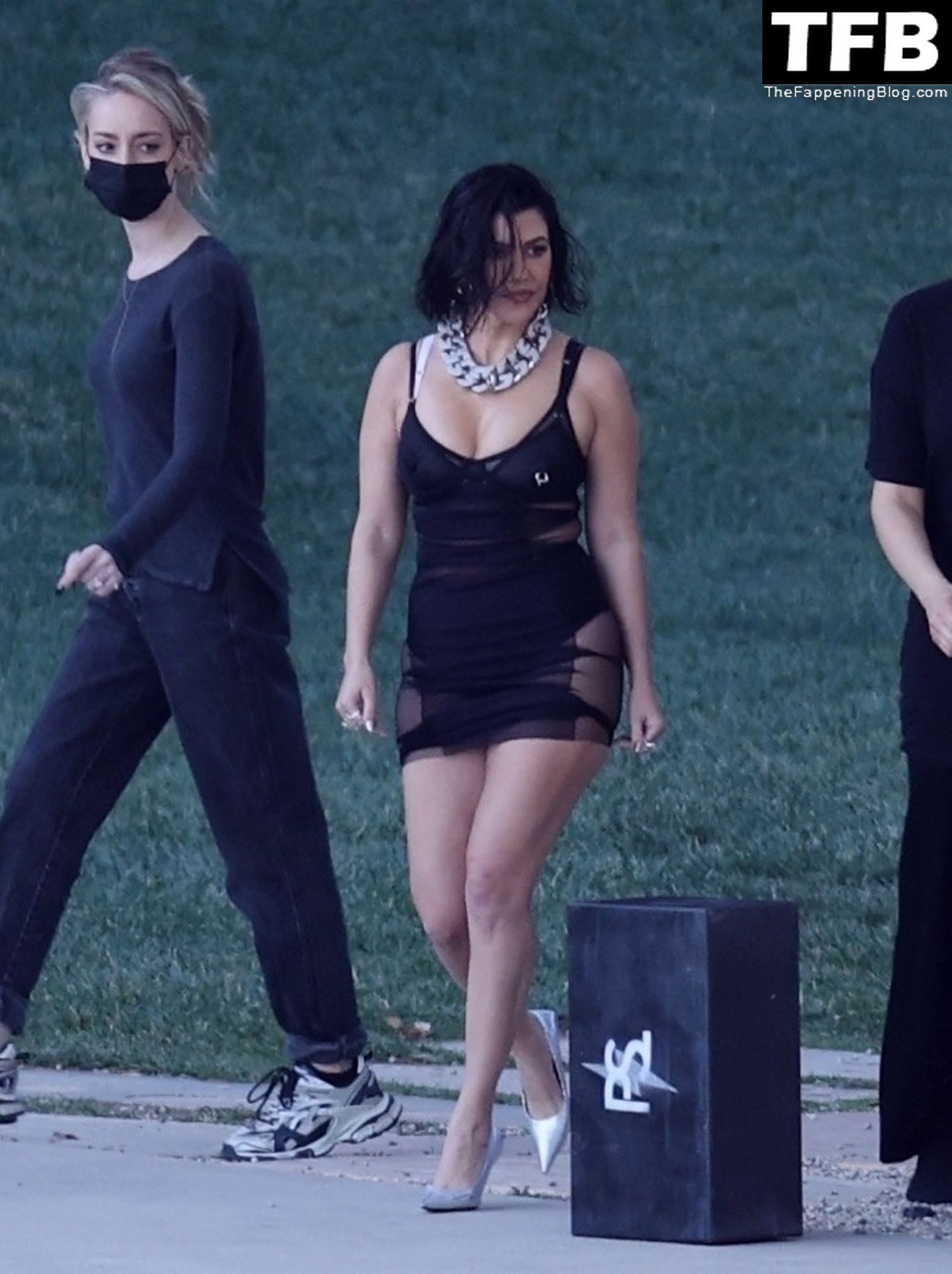 La estrella de reality posó con varios looks atrevidos de lencería el martes, incluyendo uno con un accesorio de aro en el pezón. Kourtney fue vista con un bustier negro y tanga con liguero sobre medias de red ancha y tacones de aguja de charol altísimos. En otro look, el sujetador negro y la blusa de malla de Kourtney mostraban un aro en el pezón adherido al exterior.