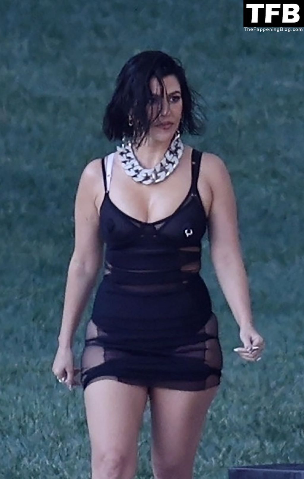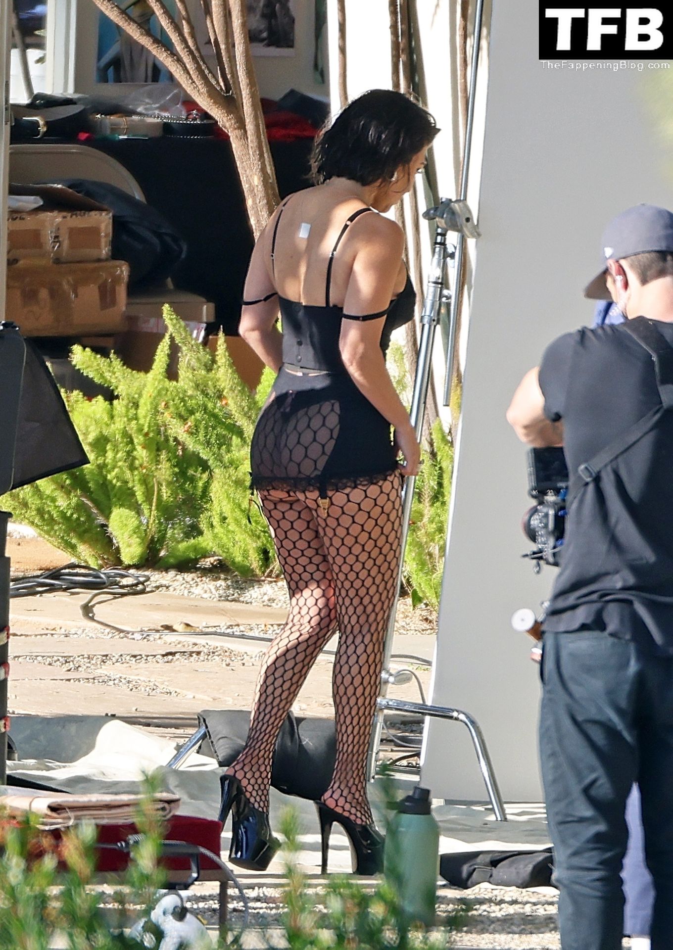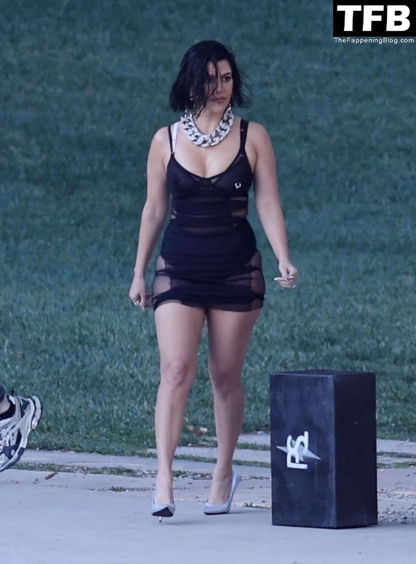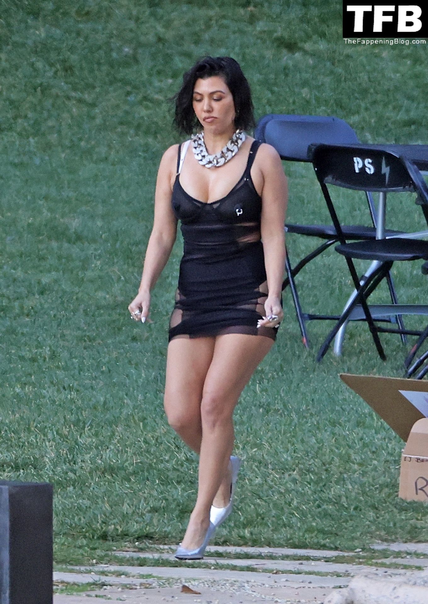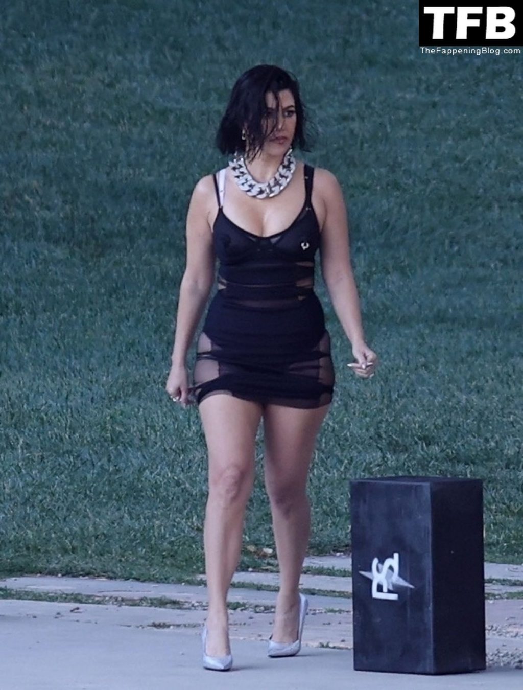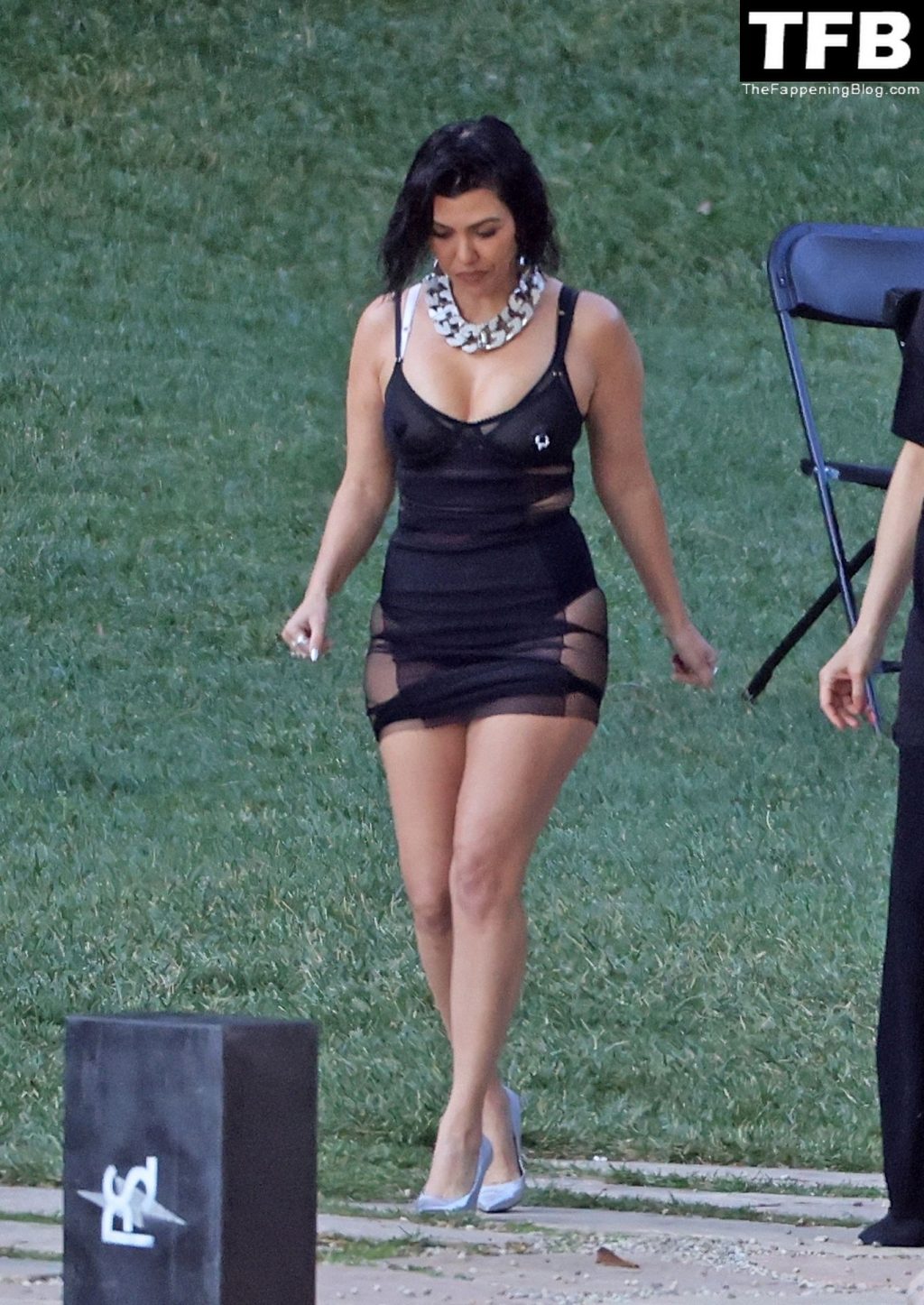 La estrella de reality posó con varios looks atrevidos de lencería el martes, incluyendo uno con un accesorio de aro en el pezón. Kourtney fue vista con un bustier negro y tanga con liguero sobre medias de red ancha y tacones de aguja de charol altísimos. En otro look, el sujetador negro y la blusa de malla de Kourtney mostraban un aro en el pezón adherido al exterior.