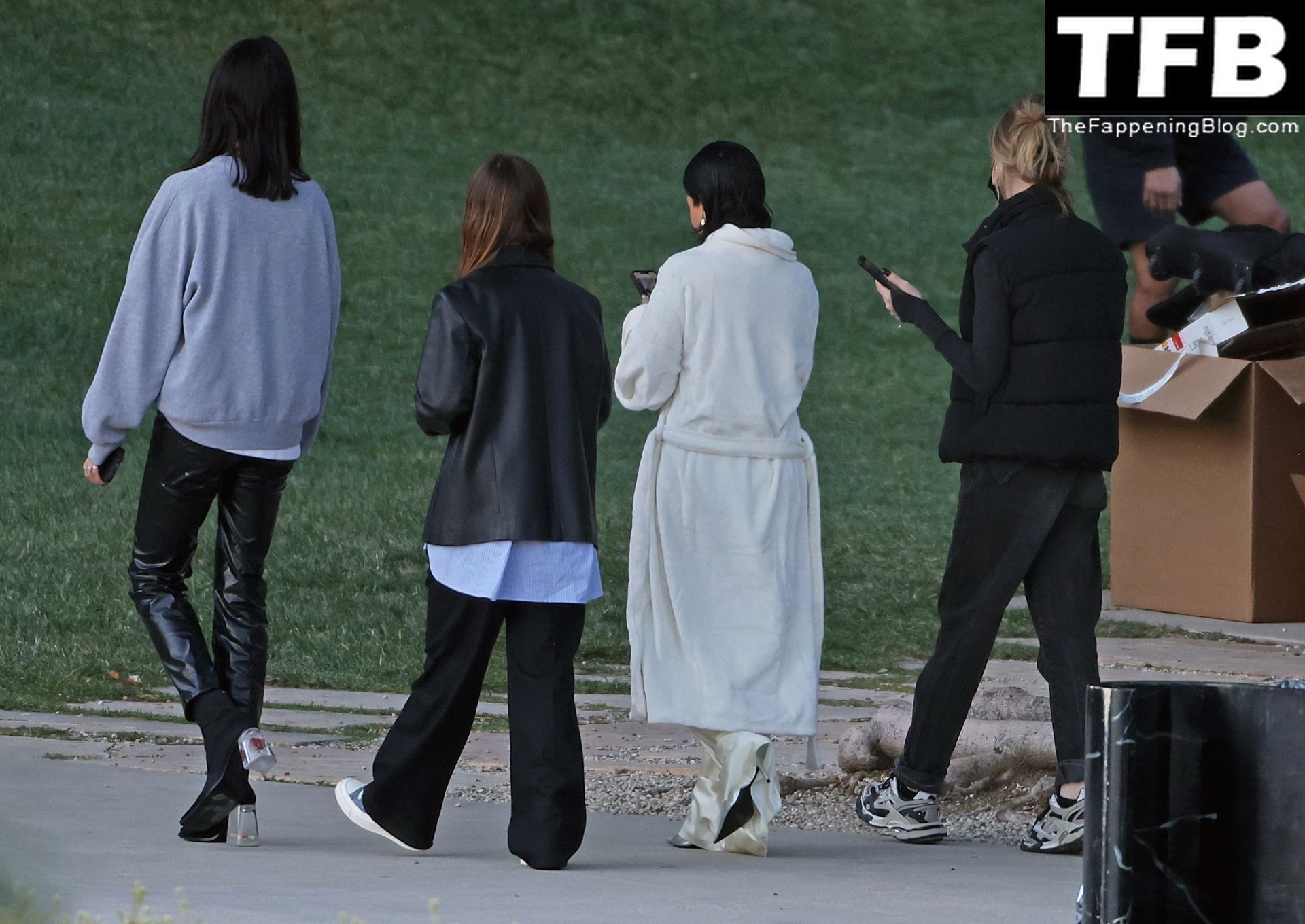 En otro momento del día, la mamá de tres recientemente comprometida se apoyó en su asistente Elizabeth mientras se equilibraba con otro par de tacones plataforma blancos, vistiendo una larga bata de seda y un albornoz blanco encima.