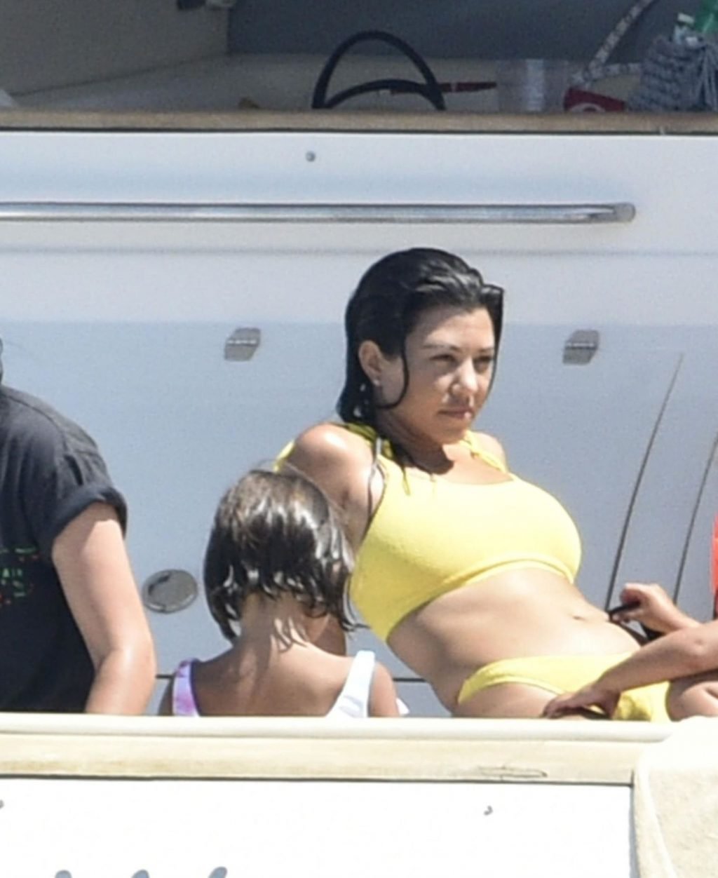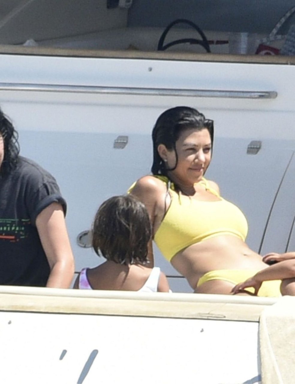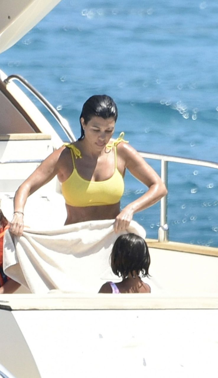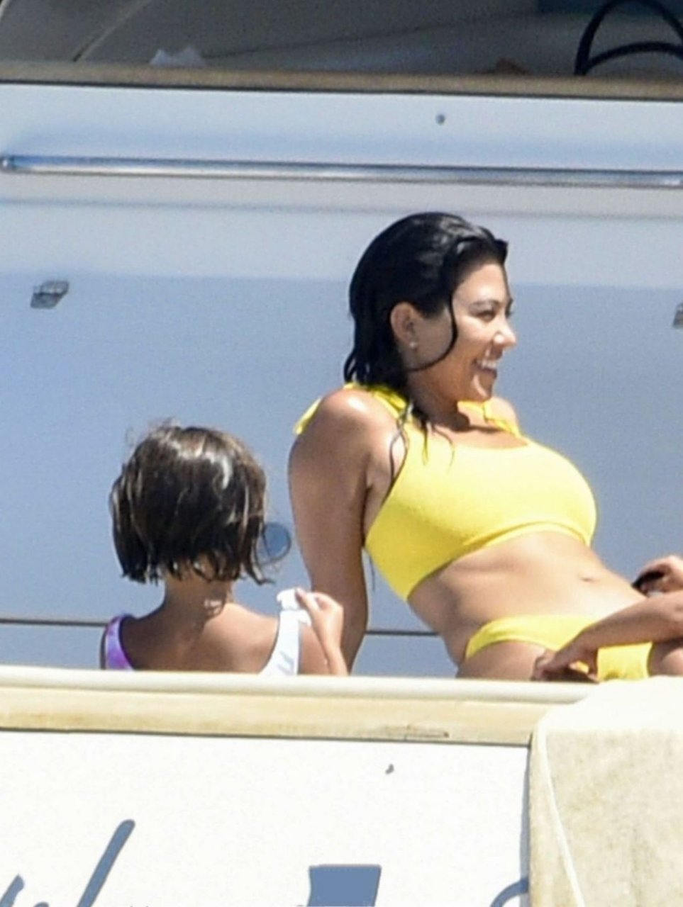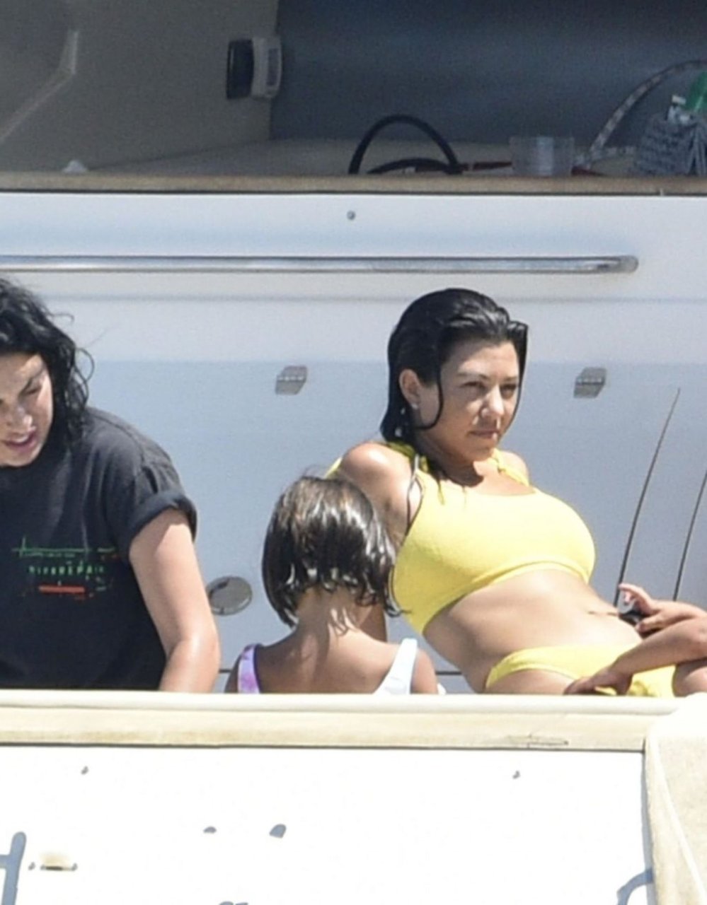 Kourtney Kardashian con sus hijos y su amigo Simon Huck fueron vistos en un yate en Córcega disfrutando del buen clima, 26/07/2019. Kourtney Kardashian muestra sus atributos con un bikini amarillo mientras se refresca en el océano.