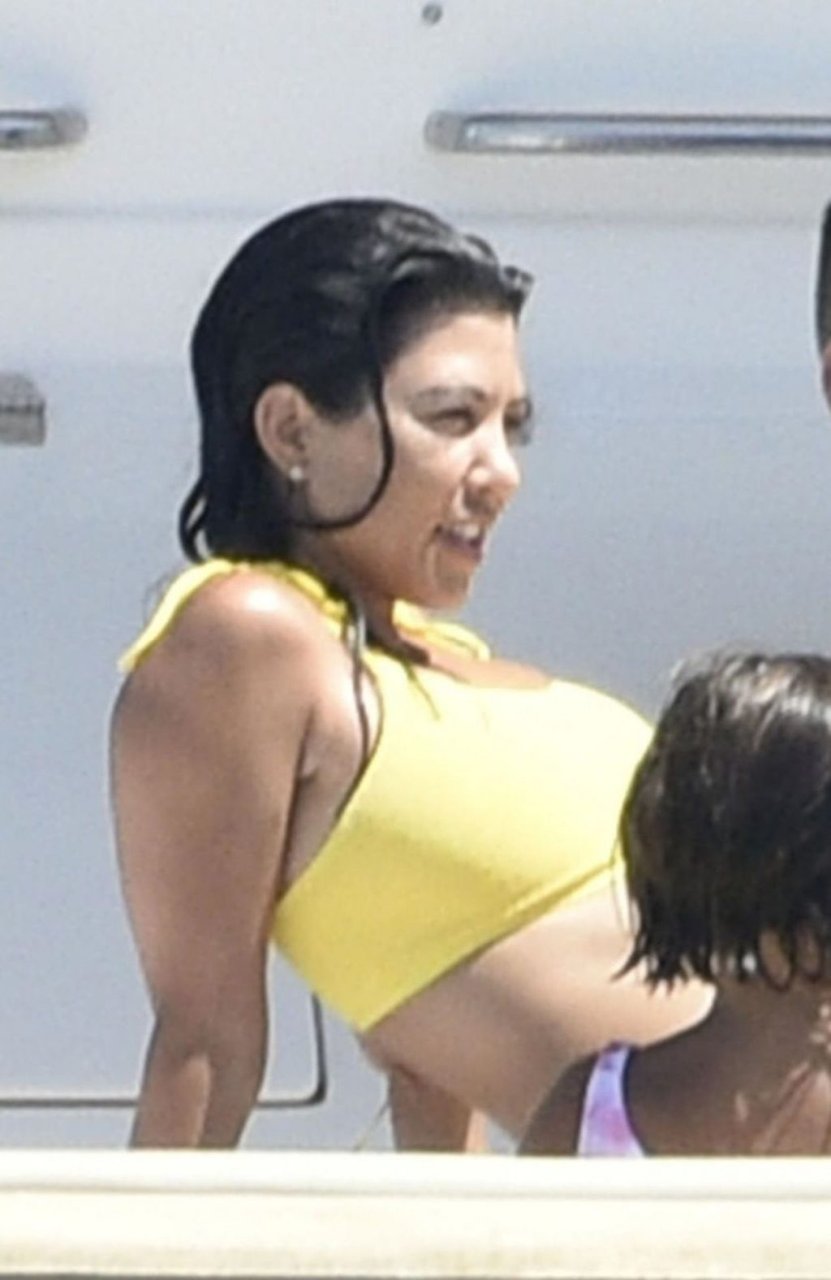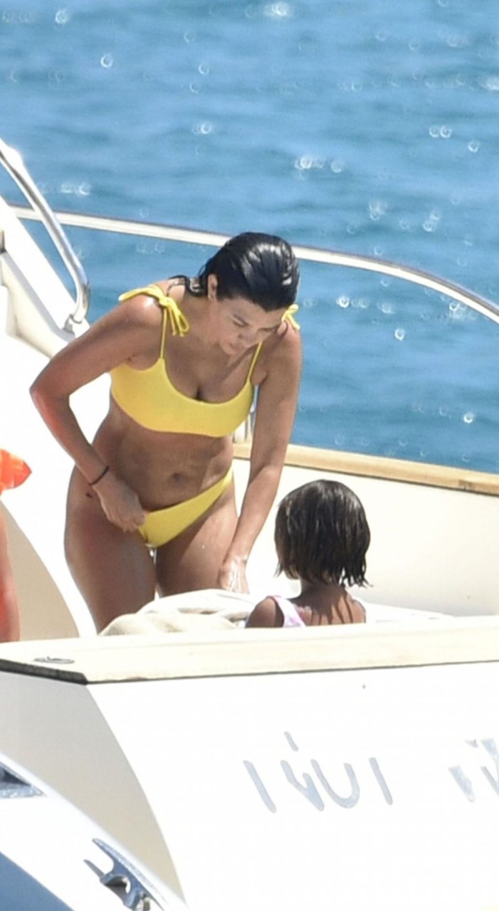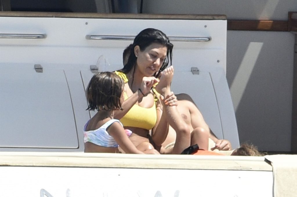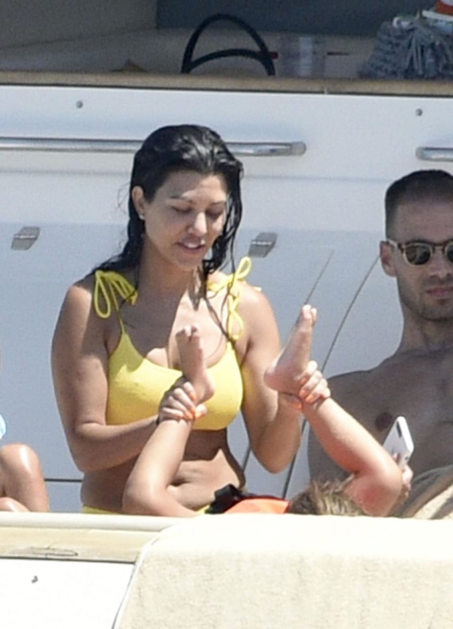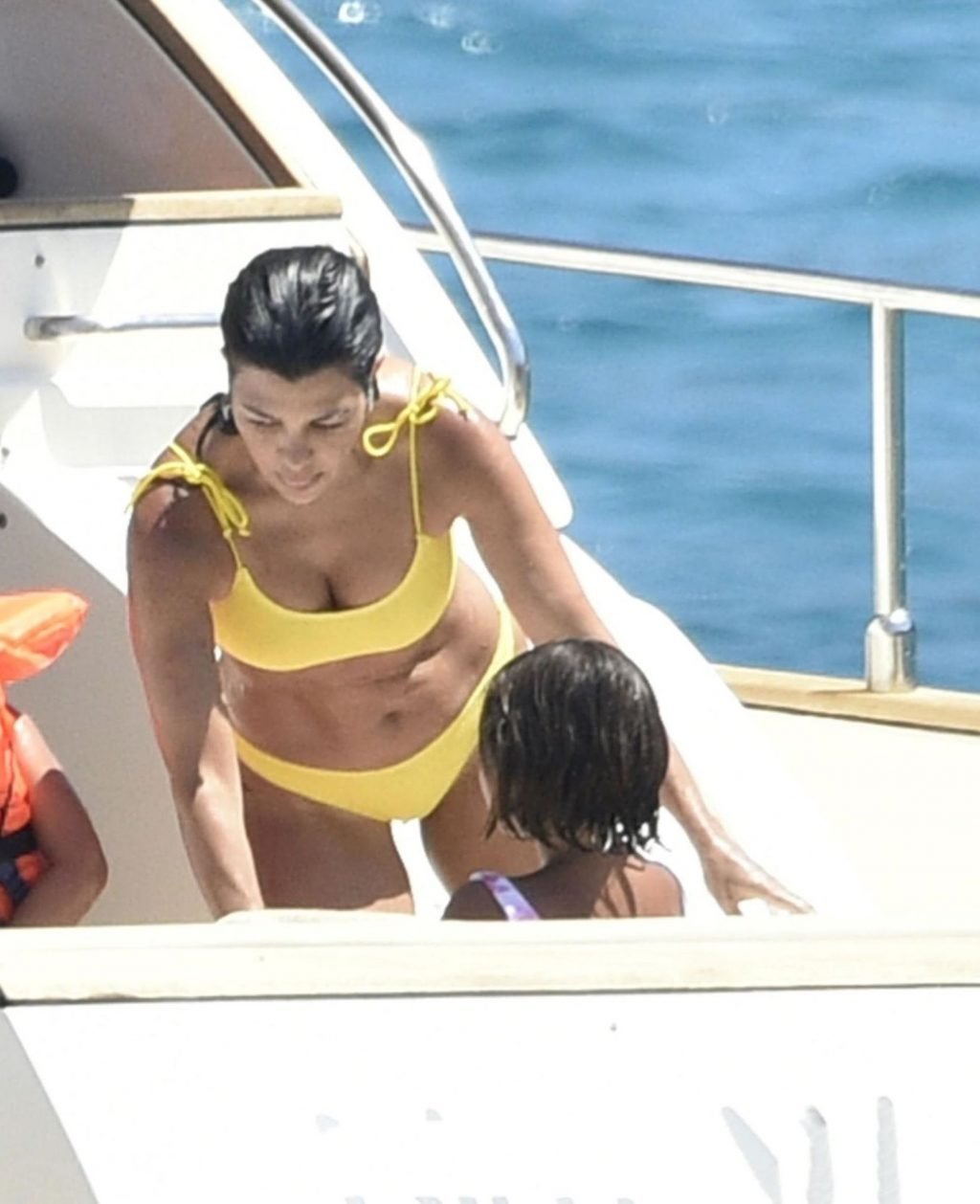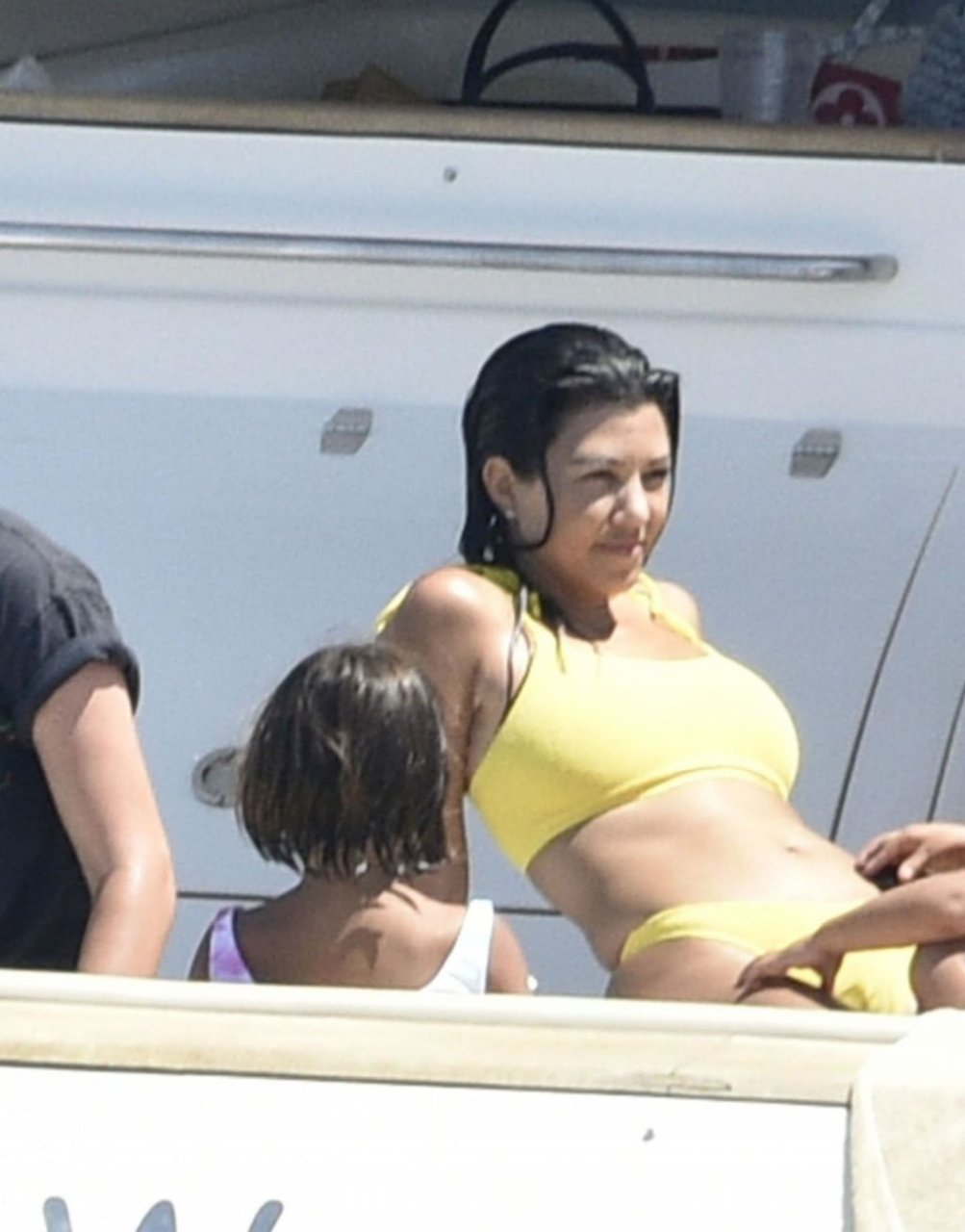 Kourtney Kardashian con sus hijos y su amigo Simon Huck fueron vistos en un yate en Córcega disfrutando del buen clima, 26/07/2019. Kourtney Kardashian muestra sus atributos con un bikini amarillo mientras se refresca en el océano.