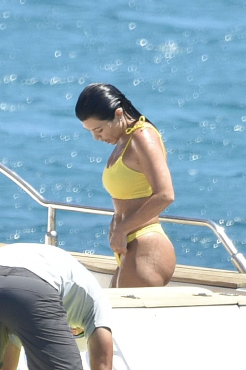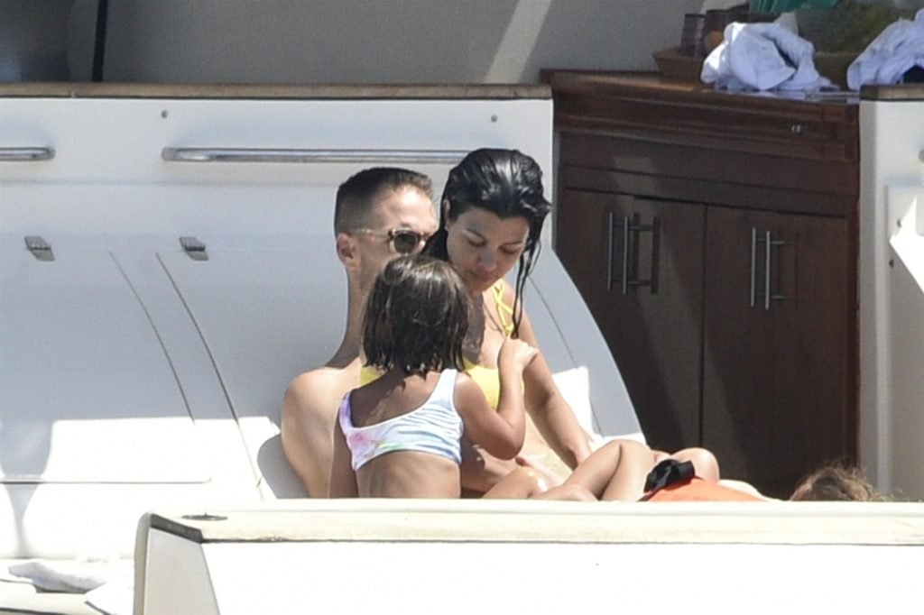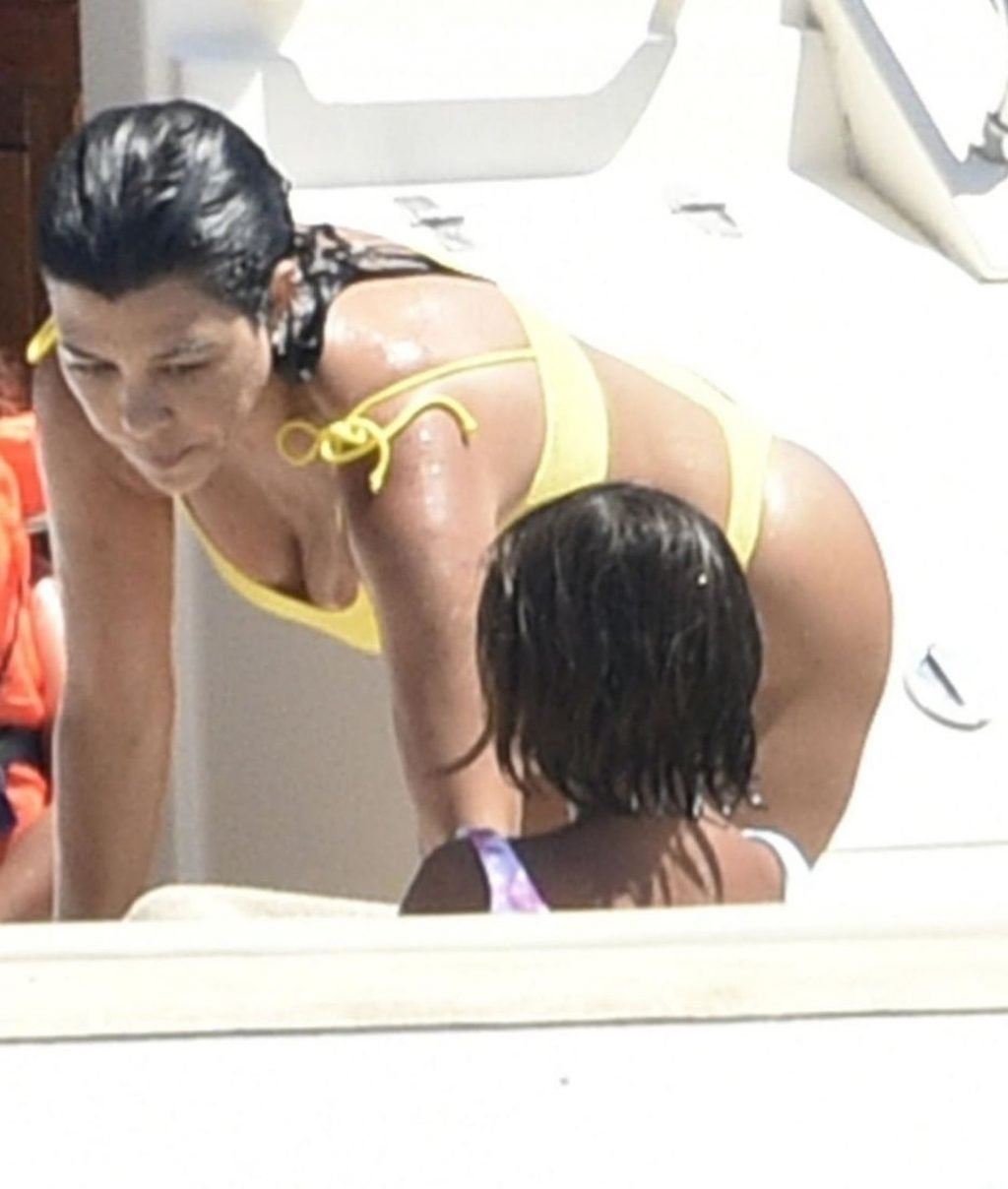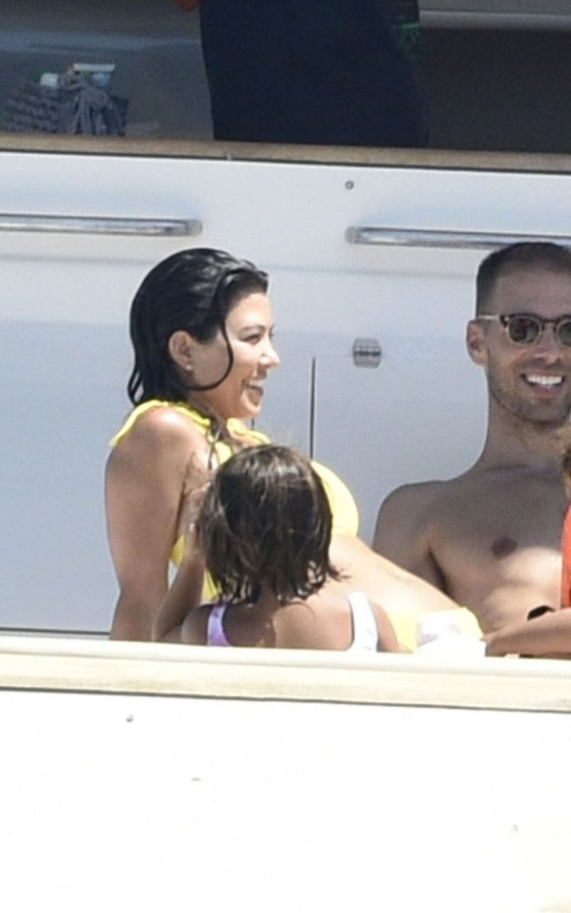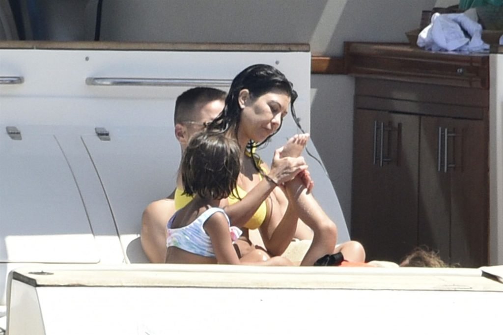 Kourtney Kardashian con sus hijos y su amigo Simon Huck fueron vistos en un yate en Córcega disfrutando del buen clima, 26/07/2019. Kourtney Kardashian muestra sus atributos con un bikini amarillo mientras se refresca en el océano.