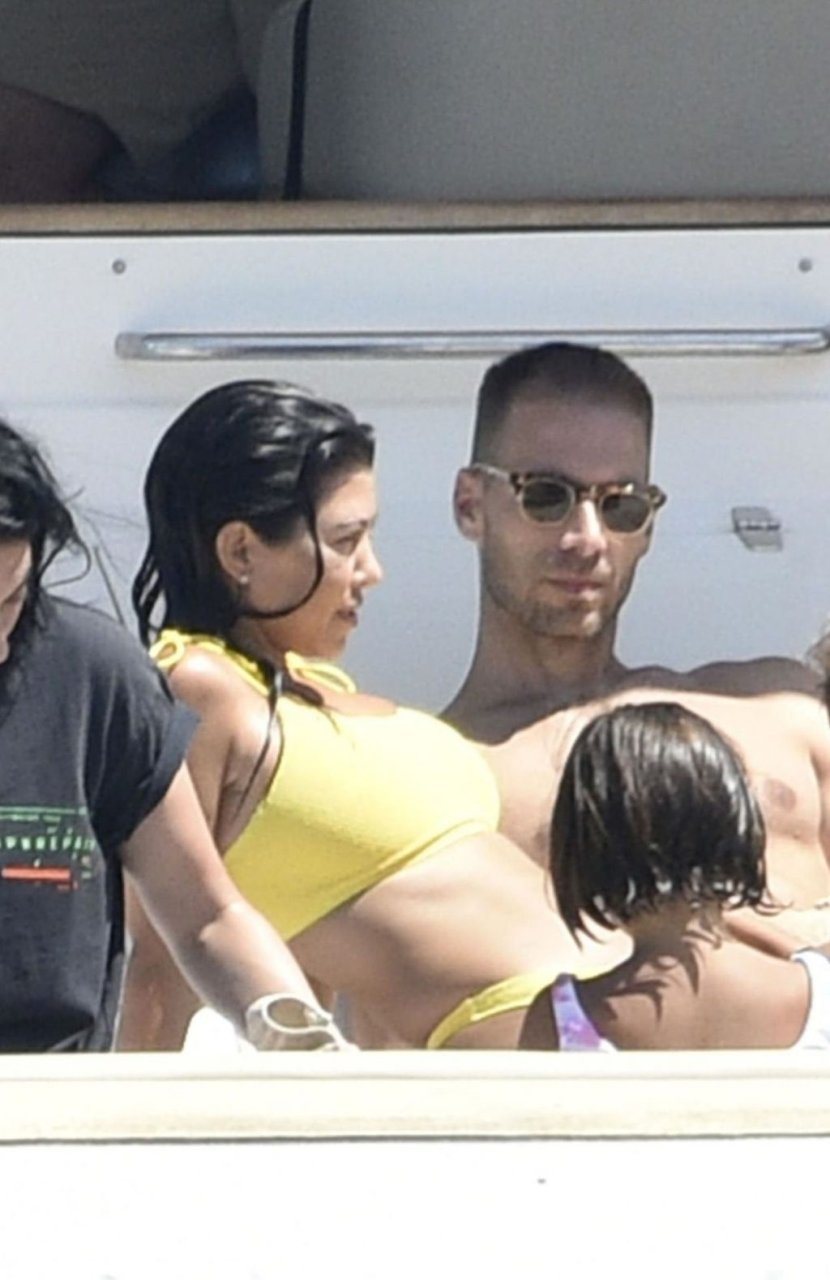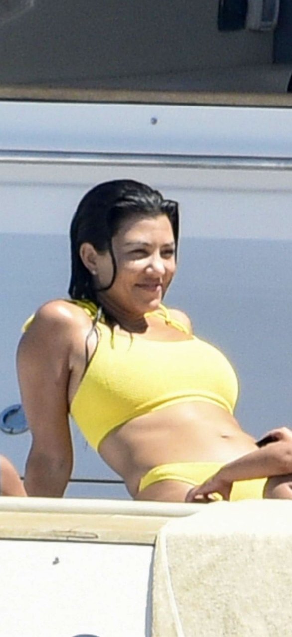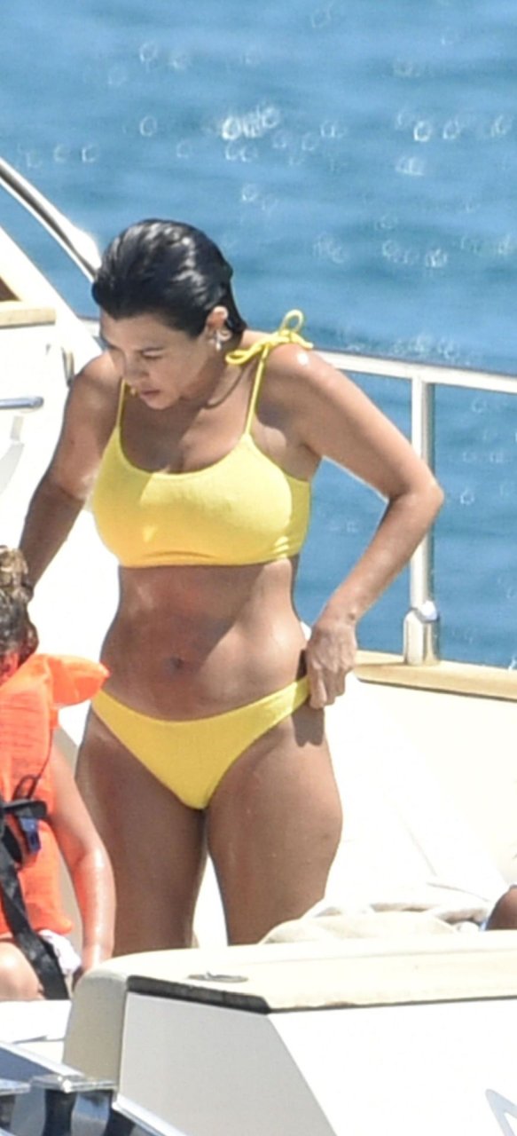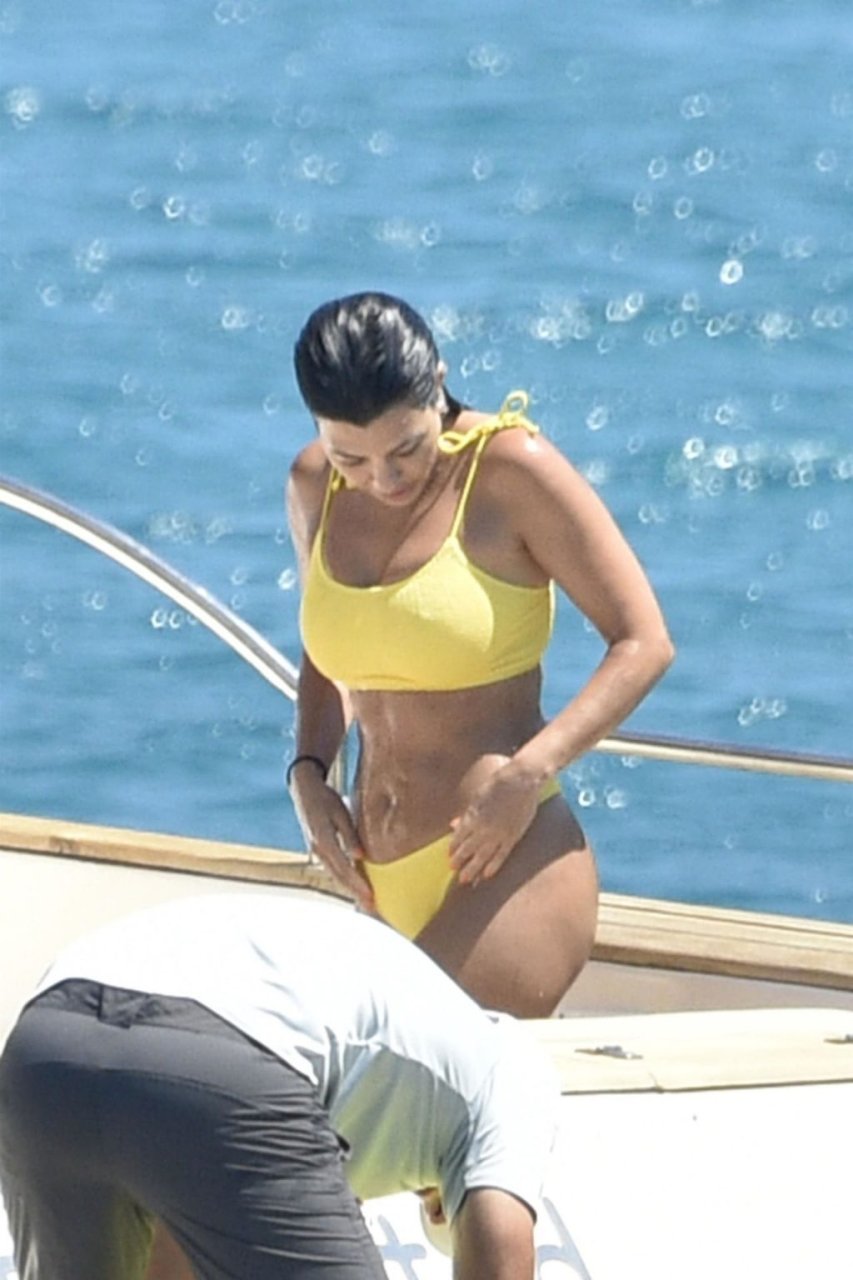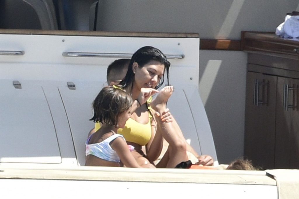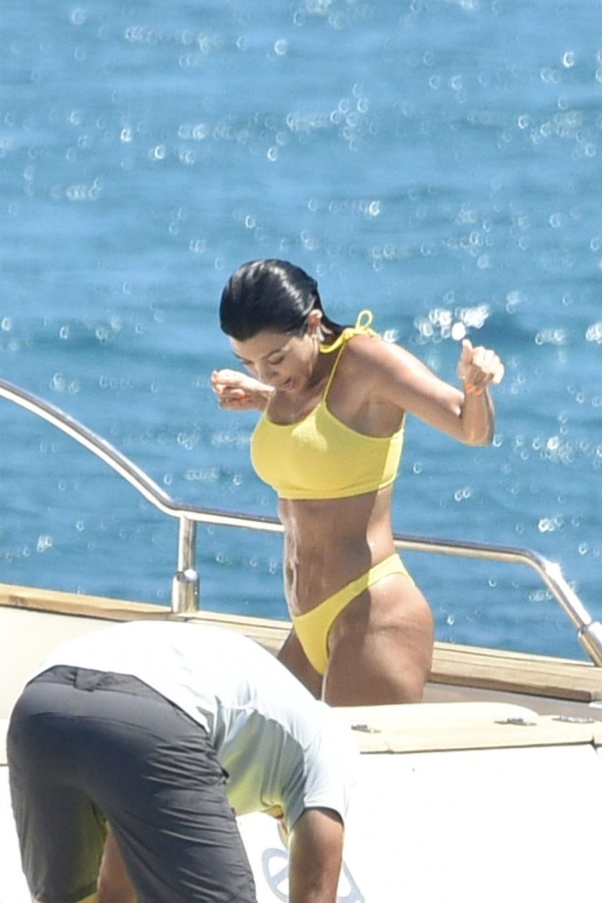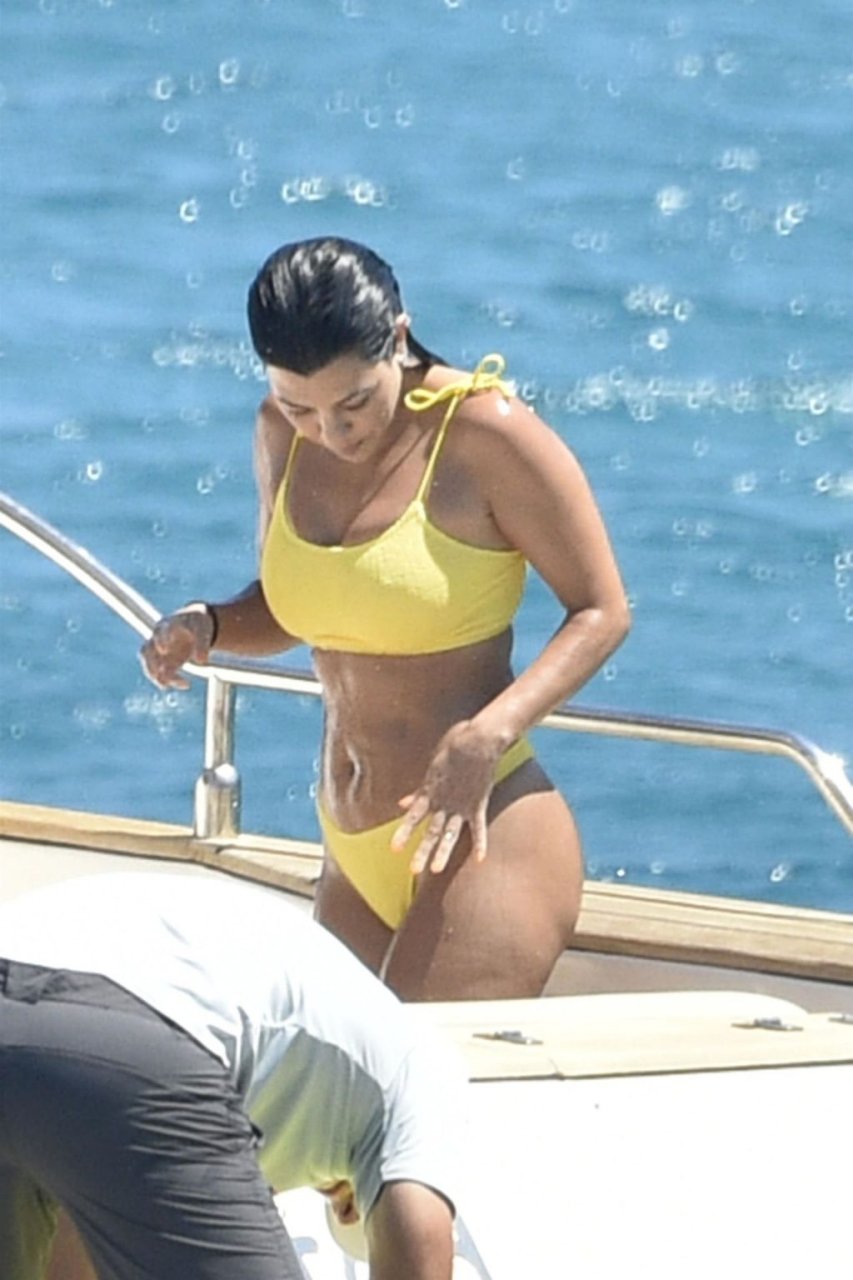 Kourtney Kardashian con sus hijos y su amigo Simon Huck fueron vistos en un yate en Córcega disfrutando del buen clima, 26/07/2019. Kourtney Kardashian muestra sus atributos con un bikini amarillo mientras se refresca en el océano.