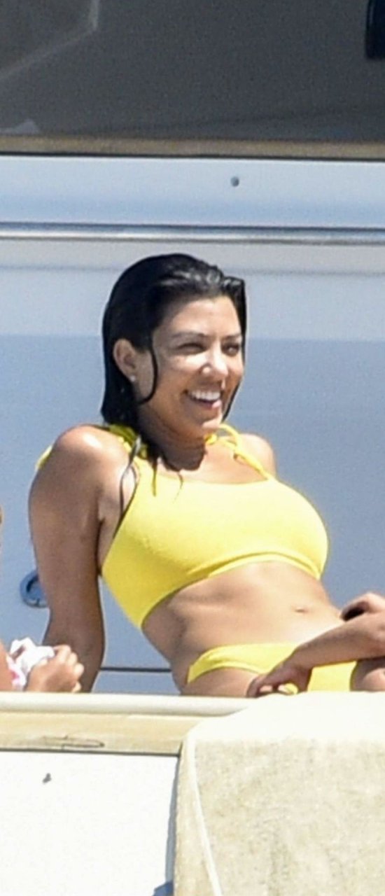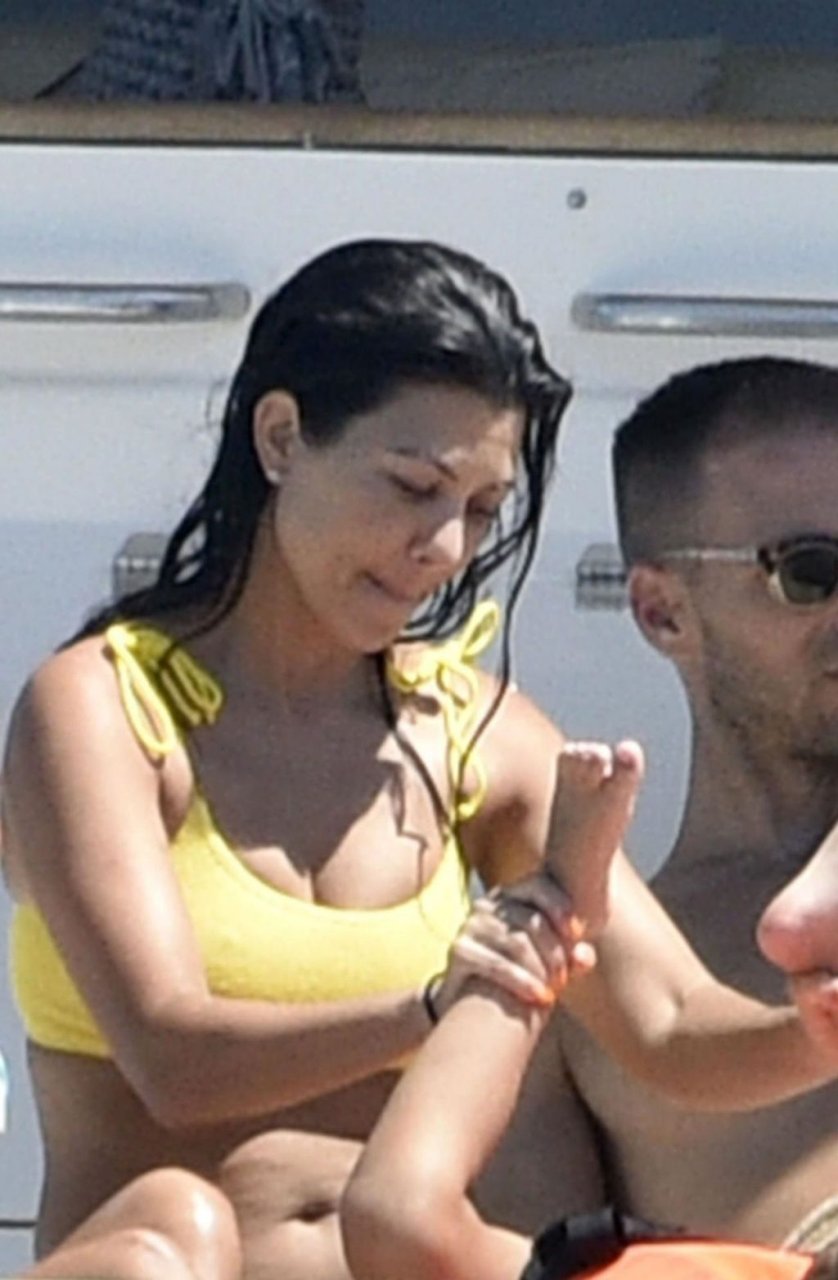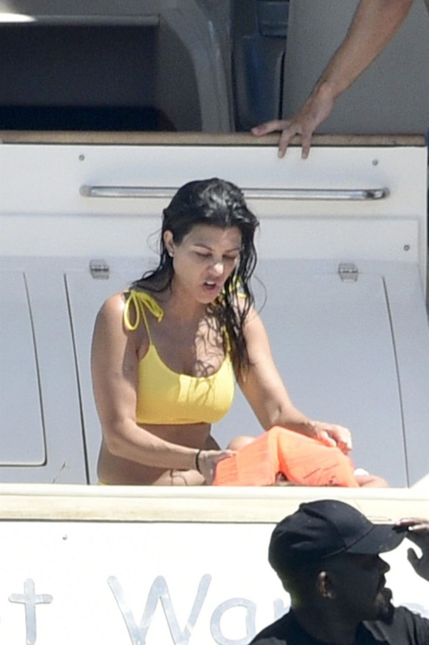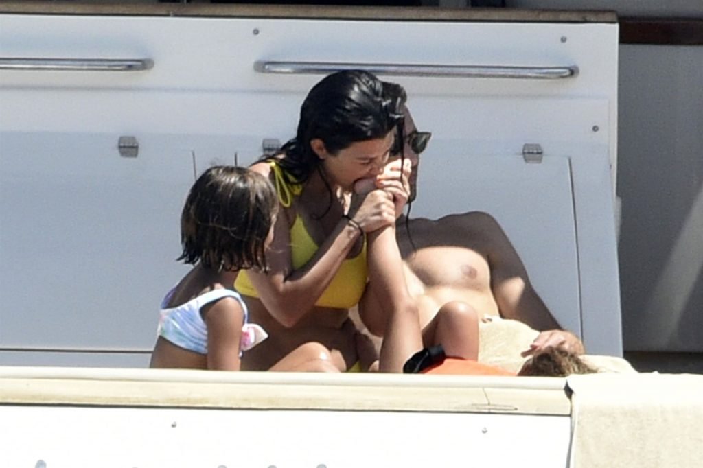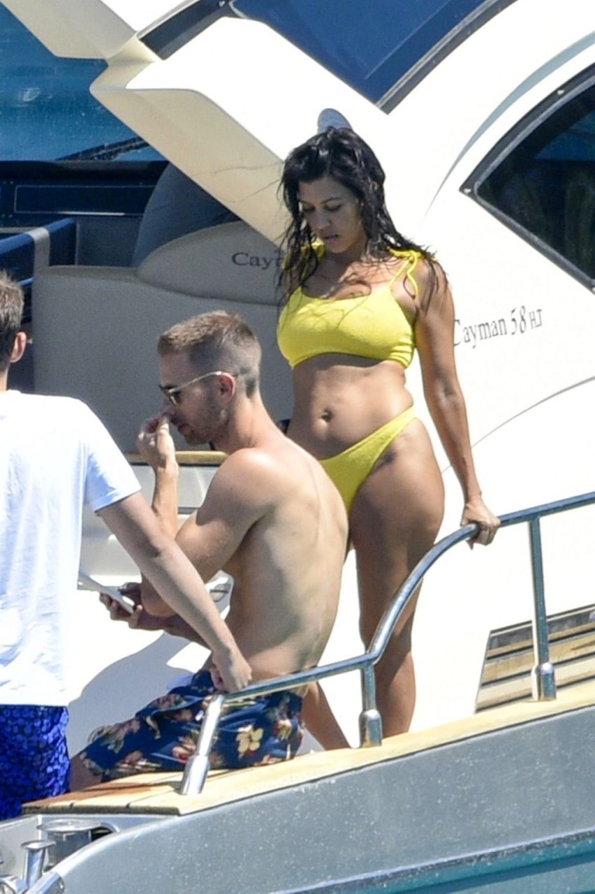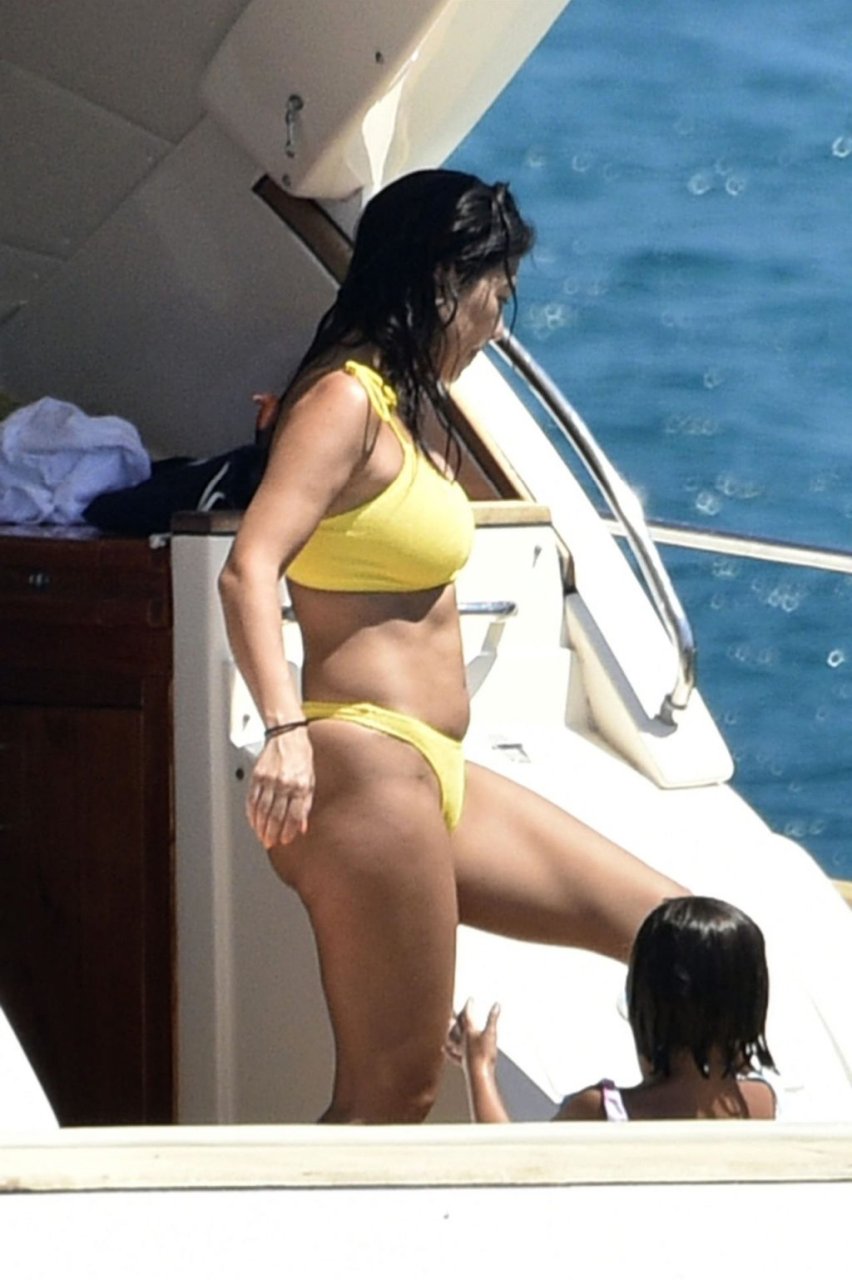 Kourtney Kardashian con sus hijos y su amigo Simon Huck fueron vistos en un yate en Córcega disfrutando del buen clima, 26/07/2019. Kourtney Kardashian muestra sus atributos con un bikini amarillo mientras se refresca en el océano.