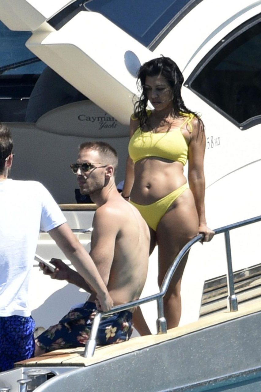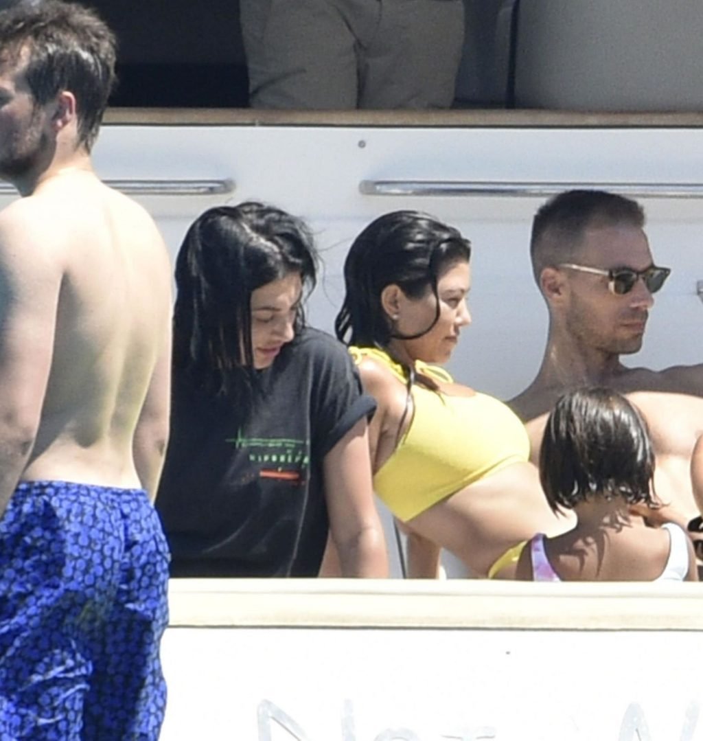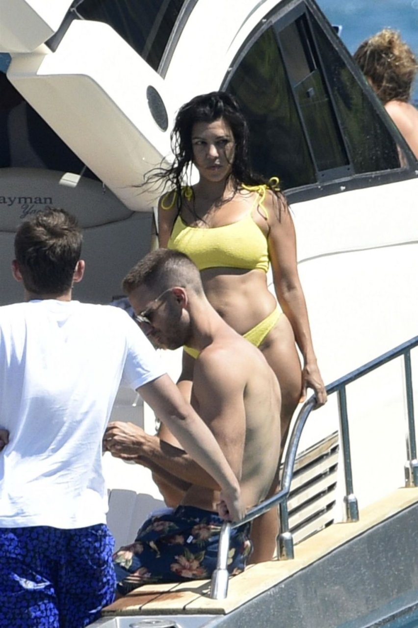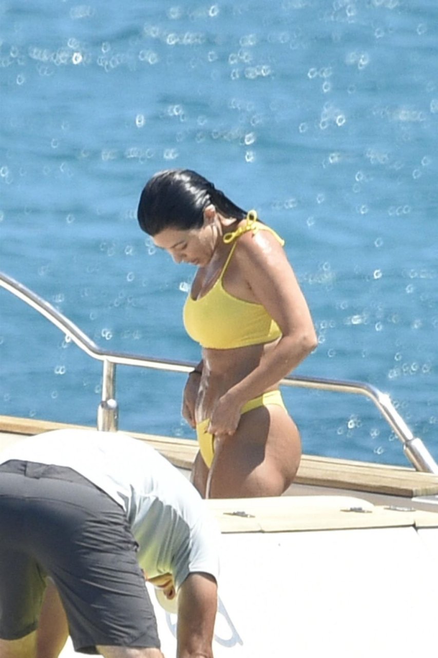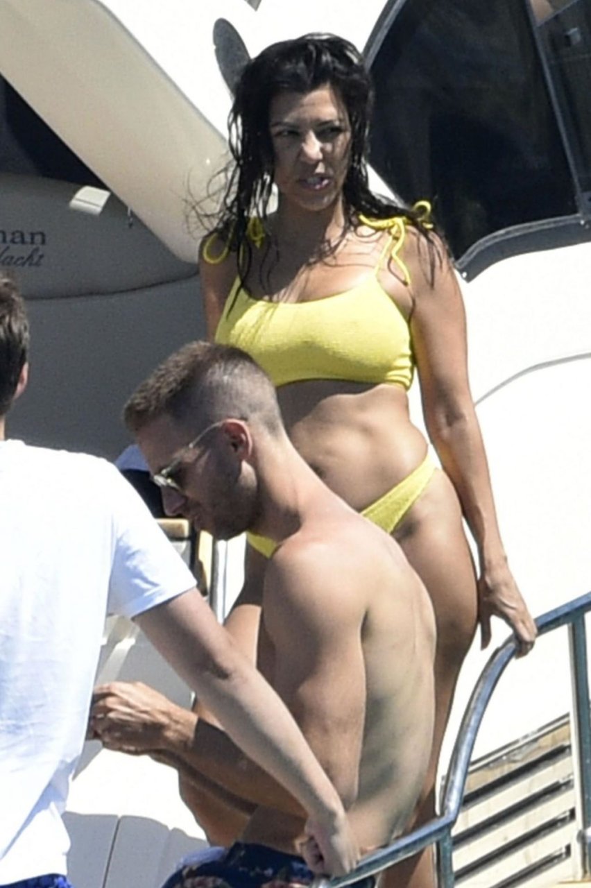 Kourtney Kardashian con sus hijos y su amigo Simon Huck fueron vistos en un yate en Córcega disfrutando del buen clima, 26/07/2019. Kourtney Kardashian muestra sus atributos con un bikini amarillo mientras se refresca en el océano.