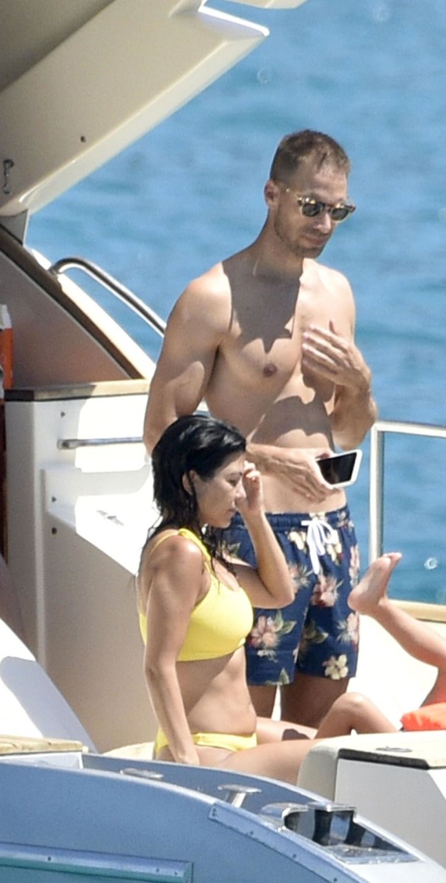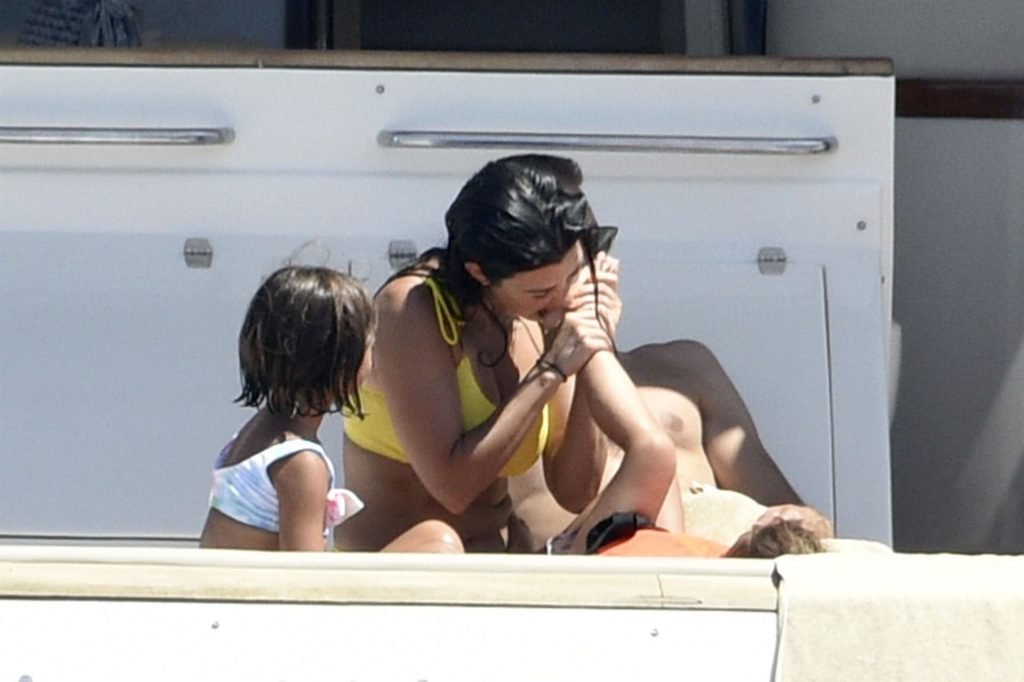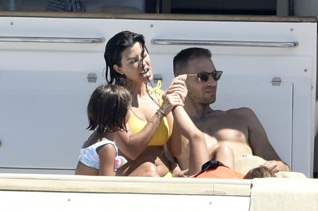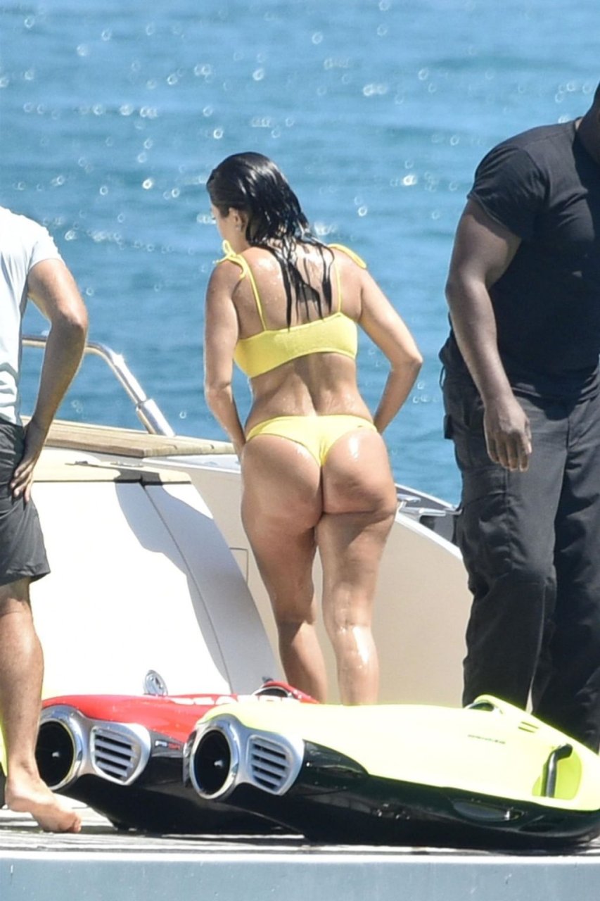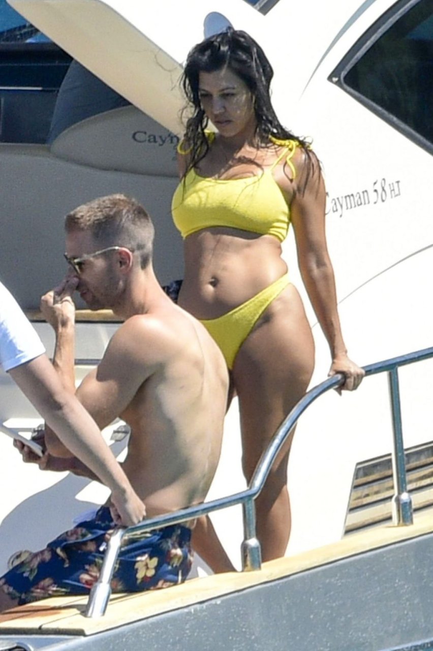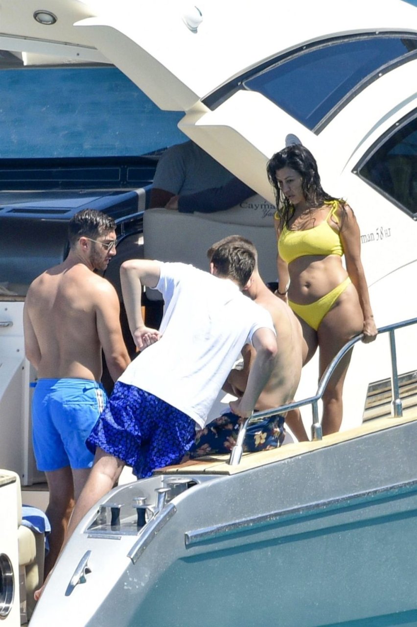 Kourtney Kardashian con sus hijos y su amigo Simon Huck fueron vistos en un yate en Córcega disfrutando del buen clima, 26/07/2019. Kourtney Kardashian muestra sus atributos con un bikini amarillo mientras se refresca en el océano.