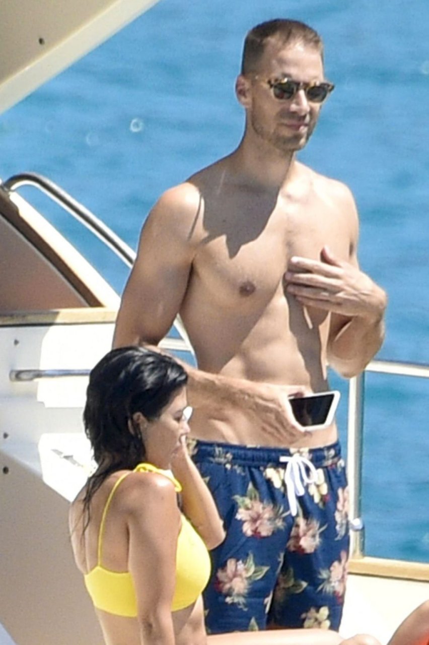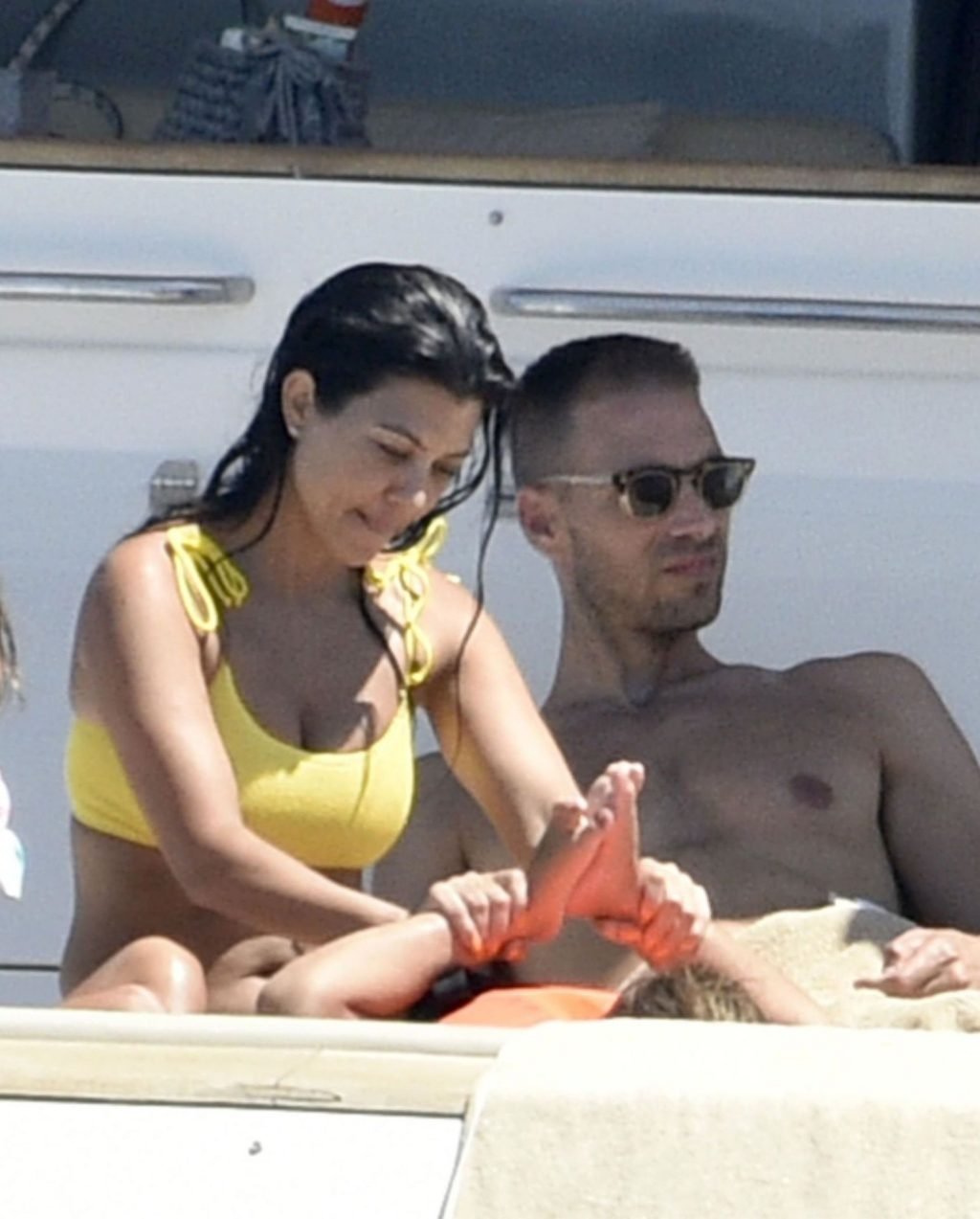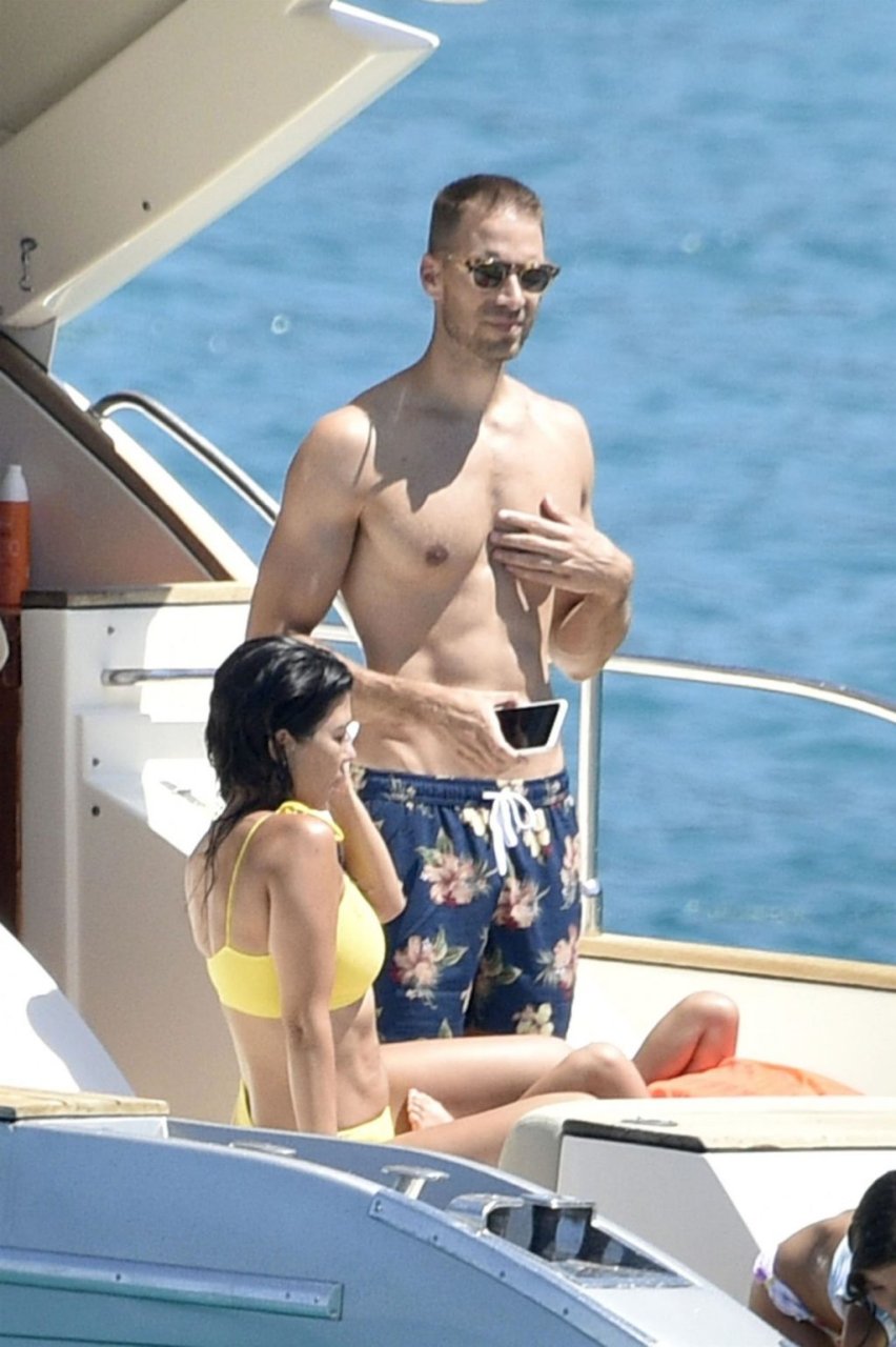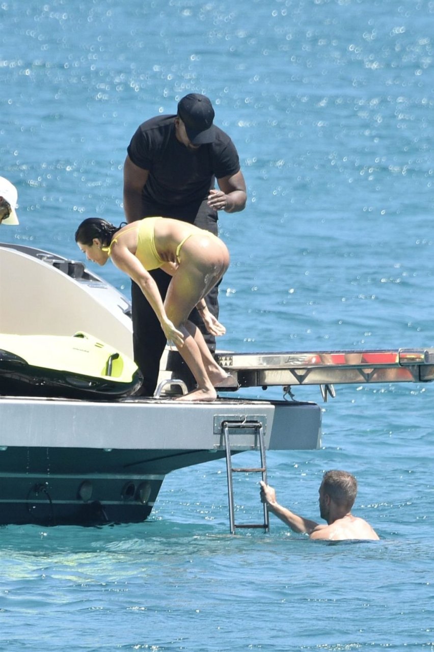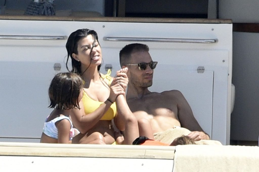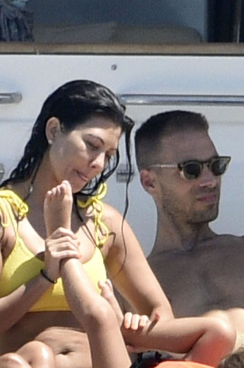 Kourtney Kardashian con sus hijos y su amigo Simon Huck fueron vistos en un yate en Córcega disfrutando del buen clima, 26/07/2019. Kourtney Kardashian muestra sus atributos con un bikini amarillo mientras se refresca en el océano.