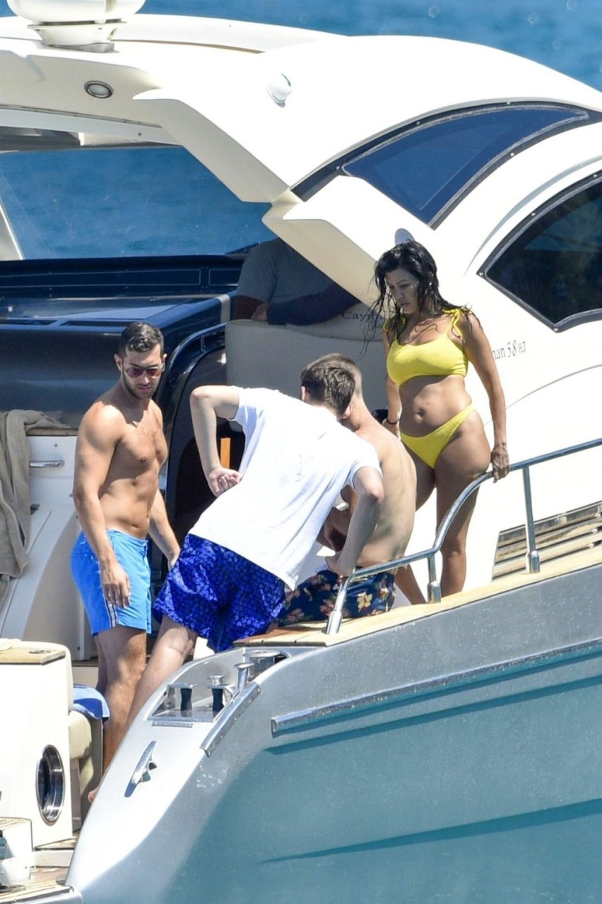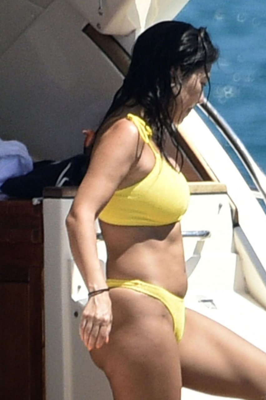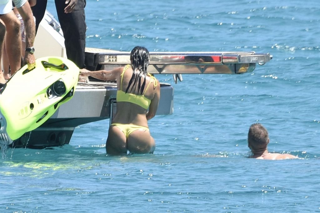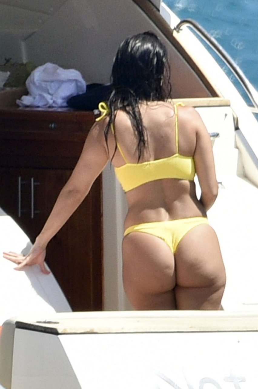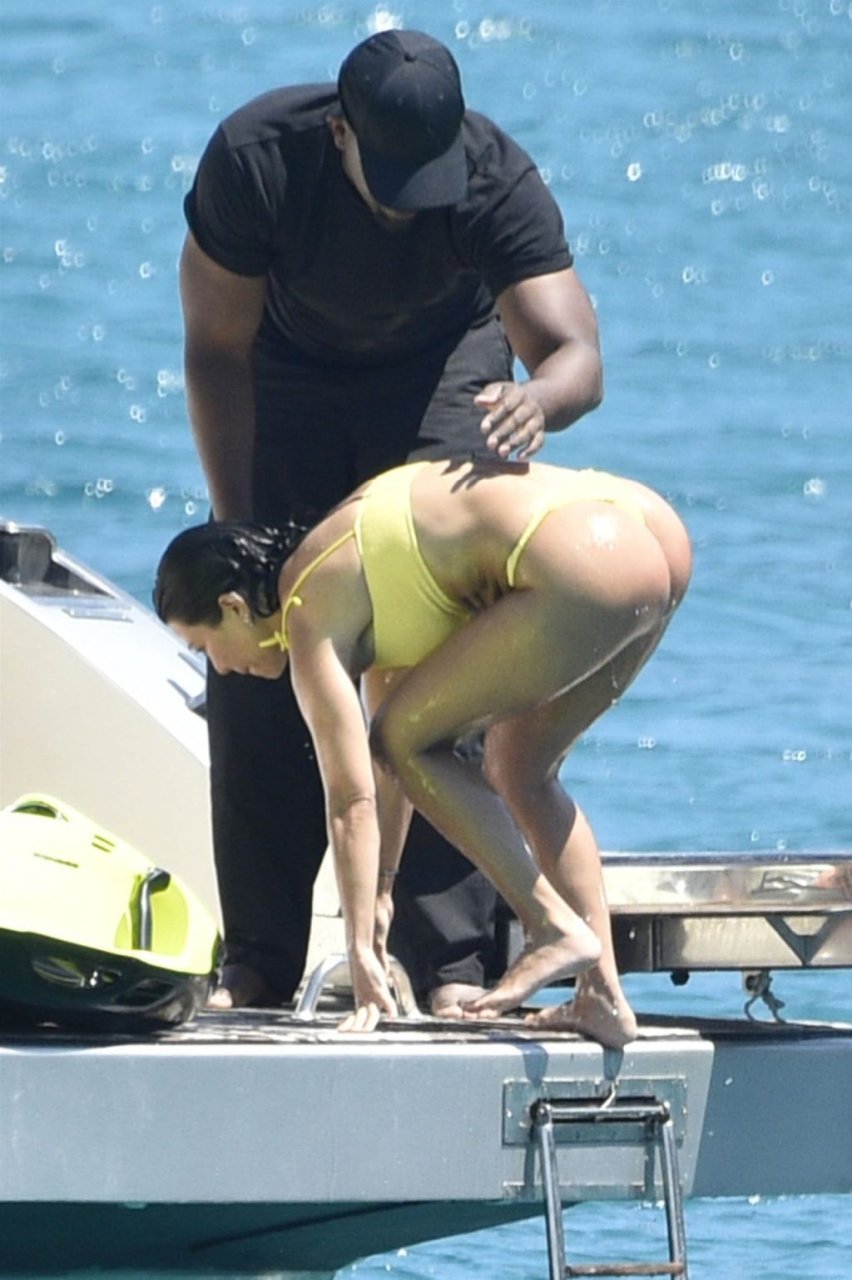 Kourtney Kardashian con sus hijos y su amigo Simon Huck fueron vistos en un yate en Córcega disfrutando del buen clima, 26/07/2019. Kourtney Kardashian muestra sus atributos con un bikini amarillo mientras se refresca en el océano.