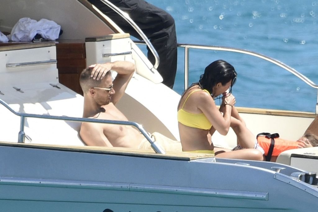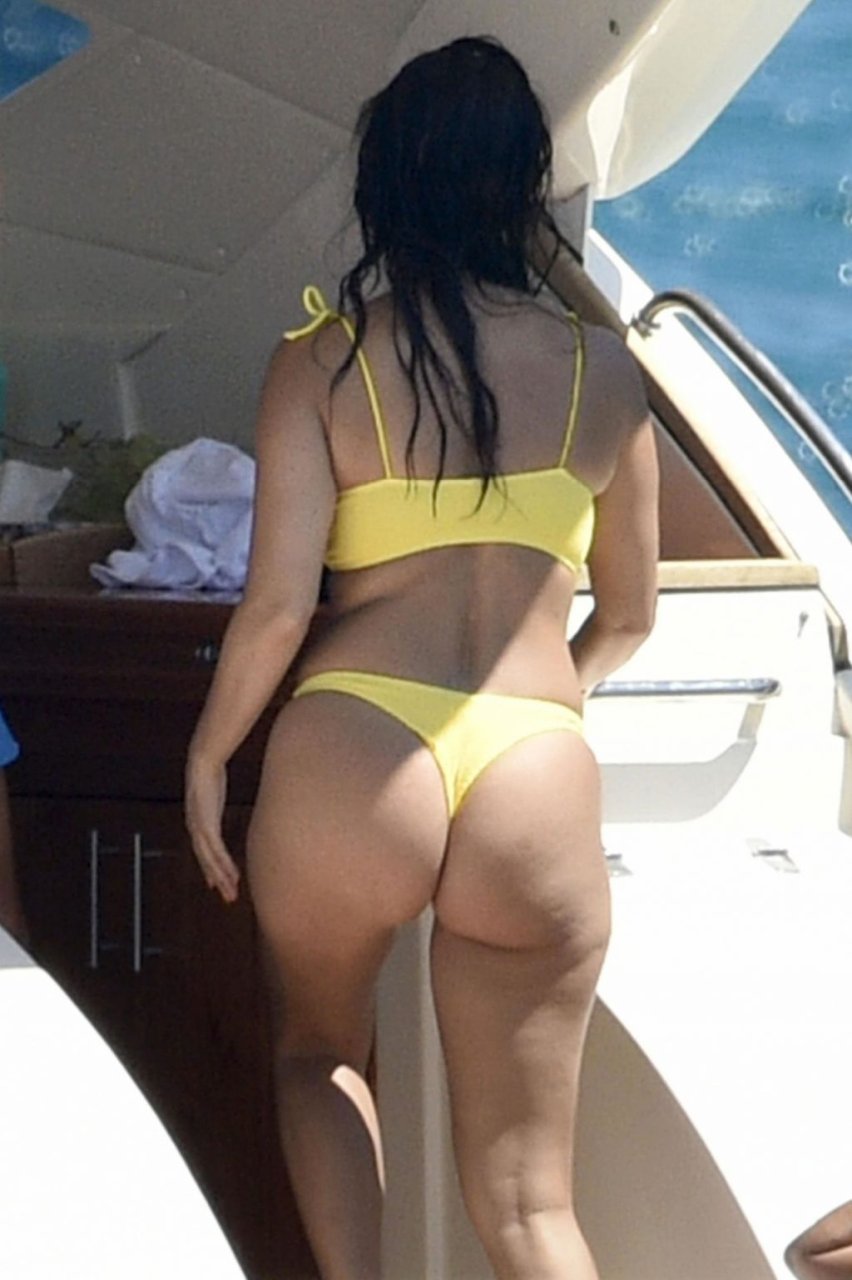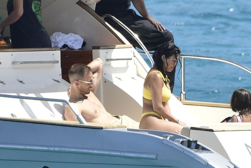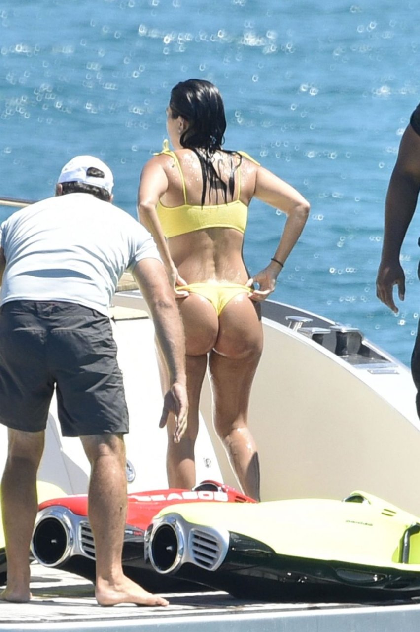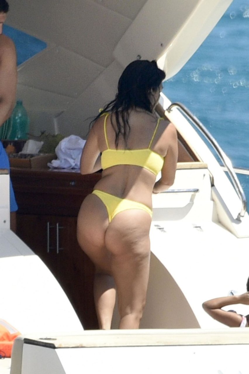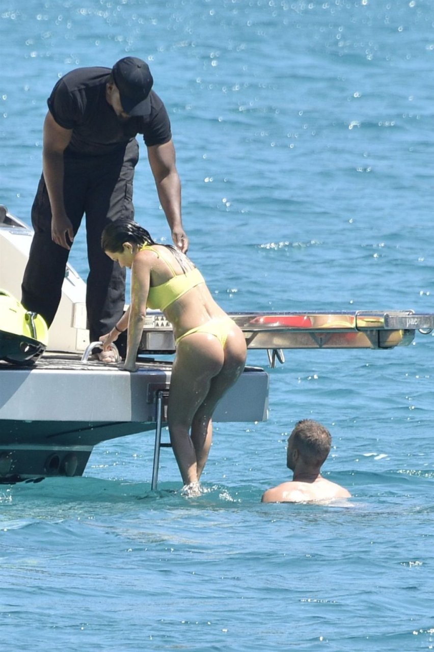 Kourtney Kardashian con sus hijos y su amigo Simon Huck fueron vistos en un yate en Córcega disfrutando del buen clima, 26/07/2019. Kourtney Kardashian muestra sus atributos con un bikini amarillo mientras se refresca en el océano.