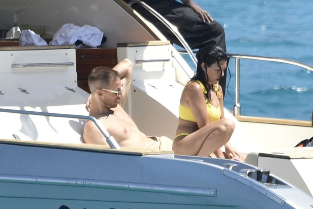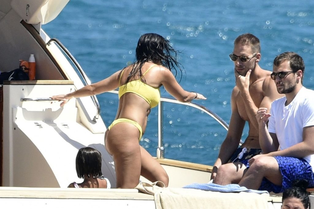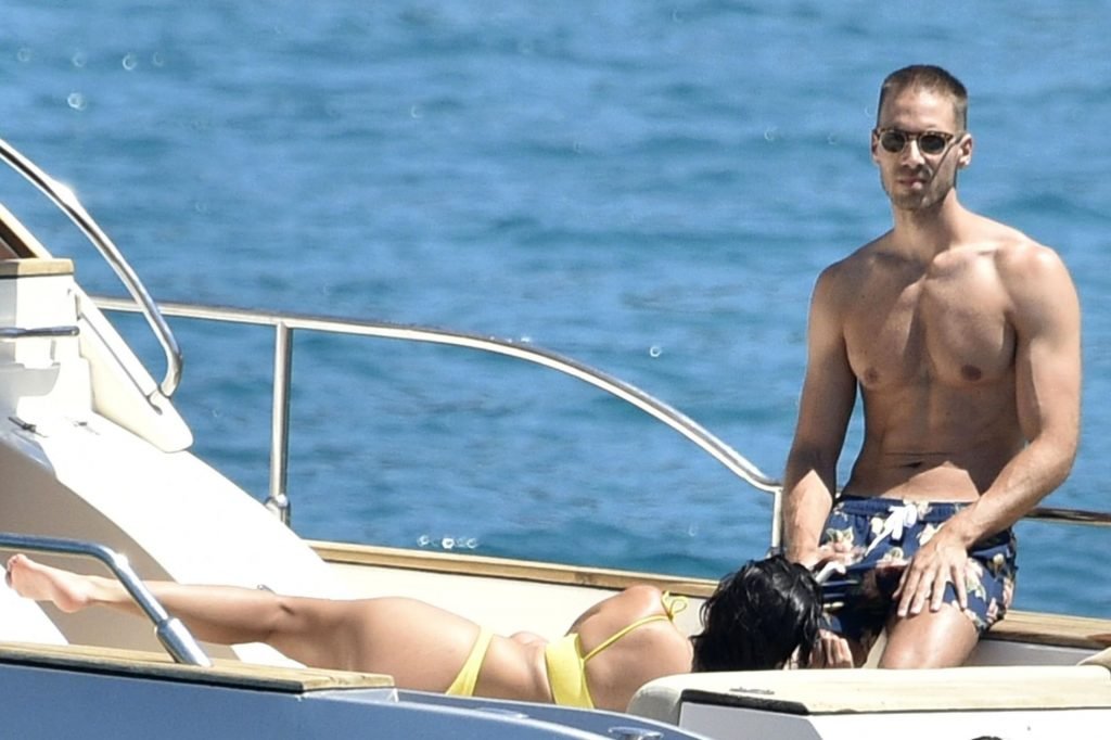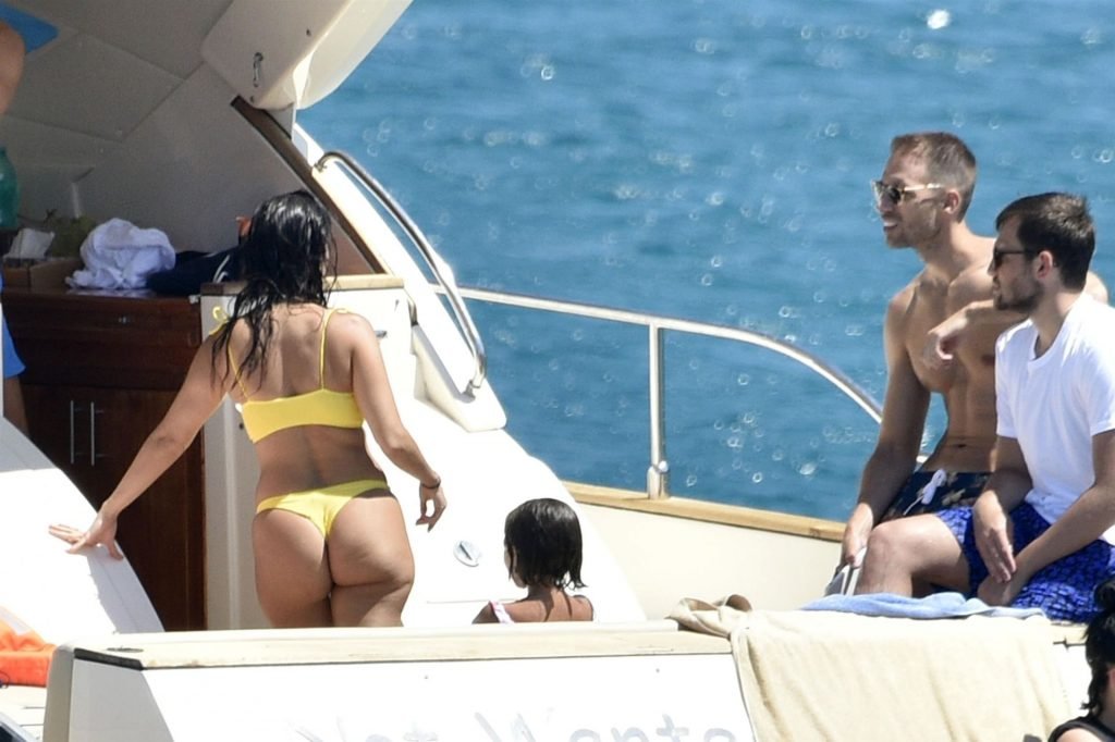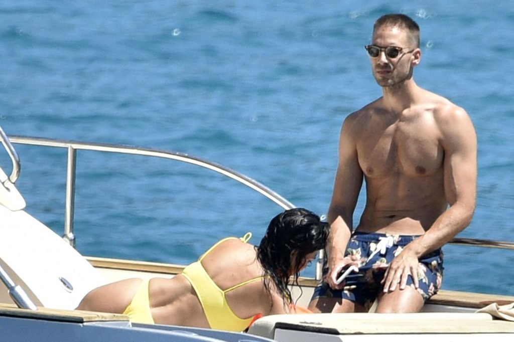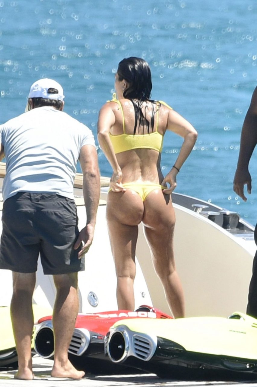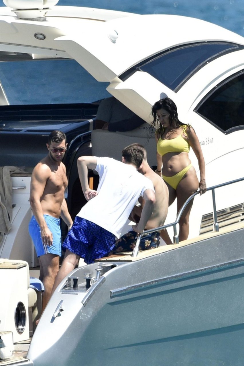 Kourtney Kardashian con sus hijos y su amigo Simon Huck fueron vistos en un yate en Córcega disfrutando del buen clima, 26/07/2019. Kourtney Kardashian muestra sus atributos con un bikini amarillo mientras se refresca en el océano.