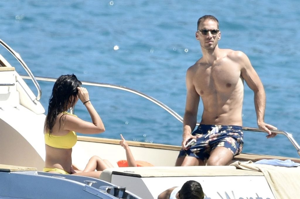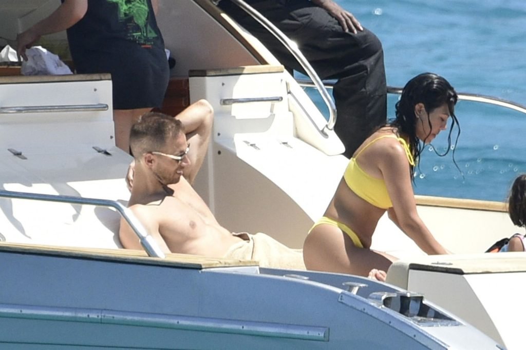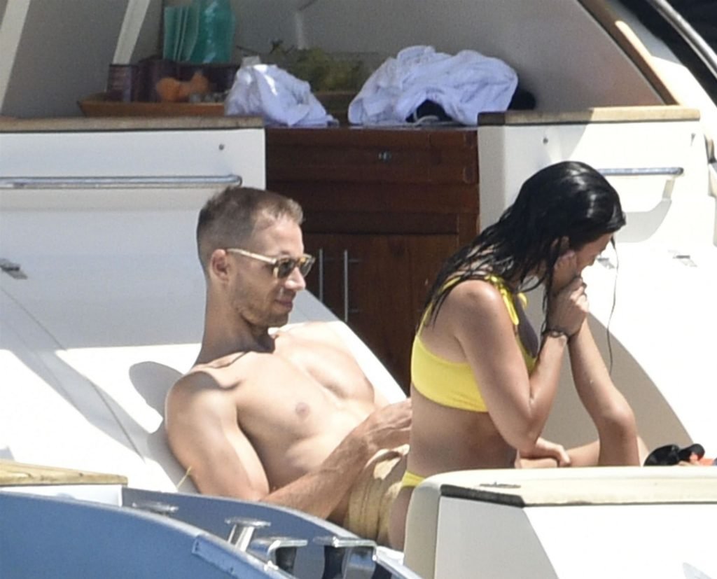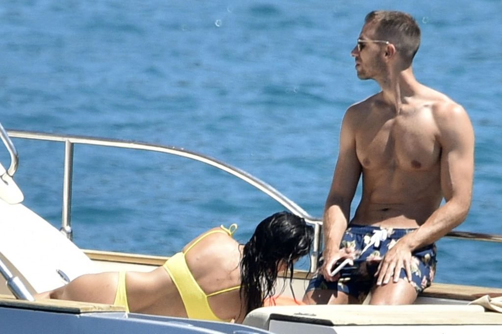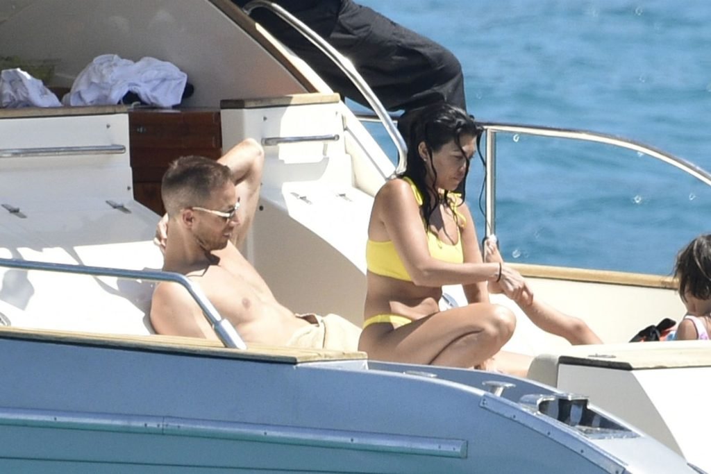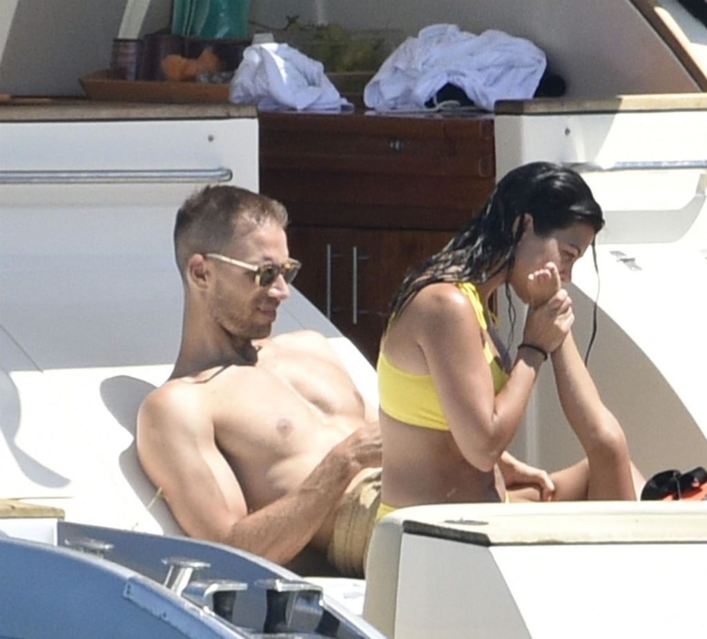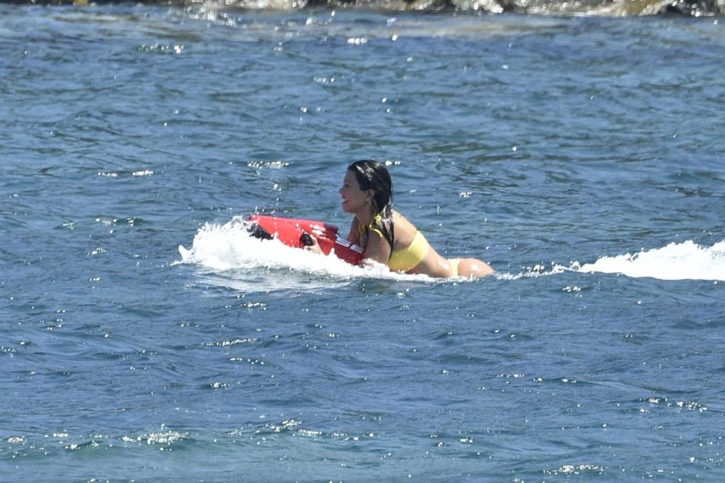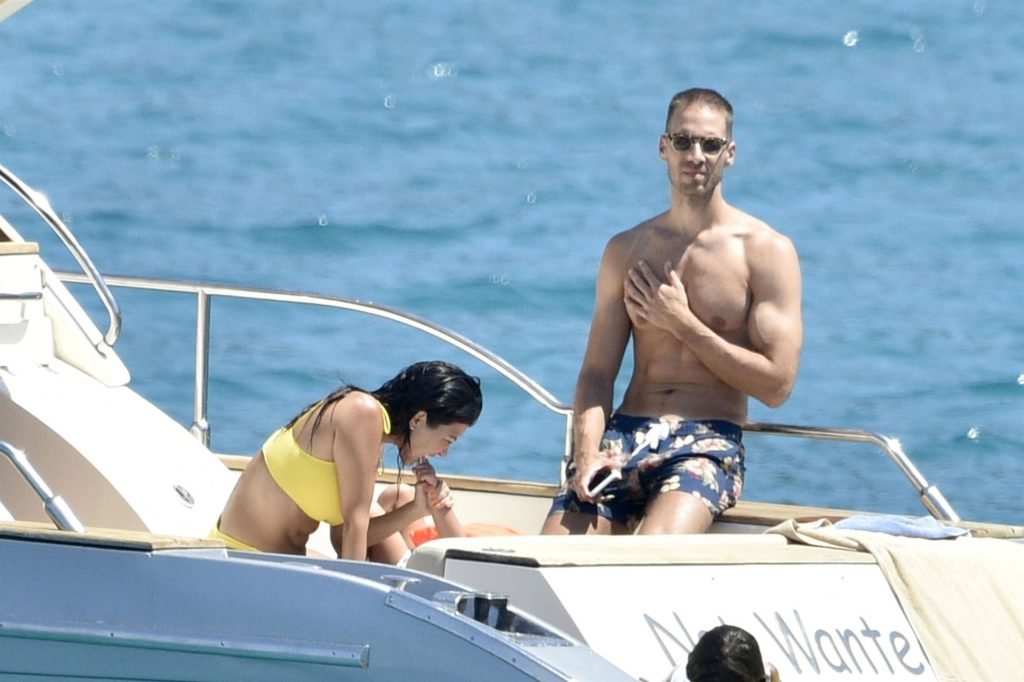 Kourtney Kardashian con sus hijos y su amigo Simon Huck fueron vistos en un yate en Córcega disfrutando del buen clima, 26/07/2019. Kourtney Kardashian muestra sus atributos con un bikini amarillo mientras se refresca en el océano.