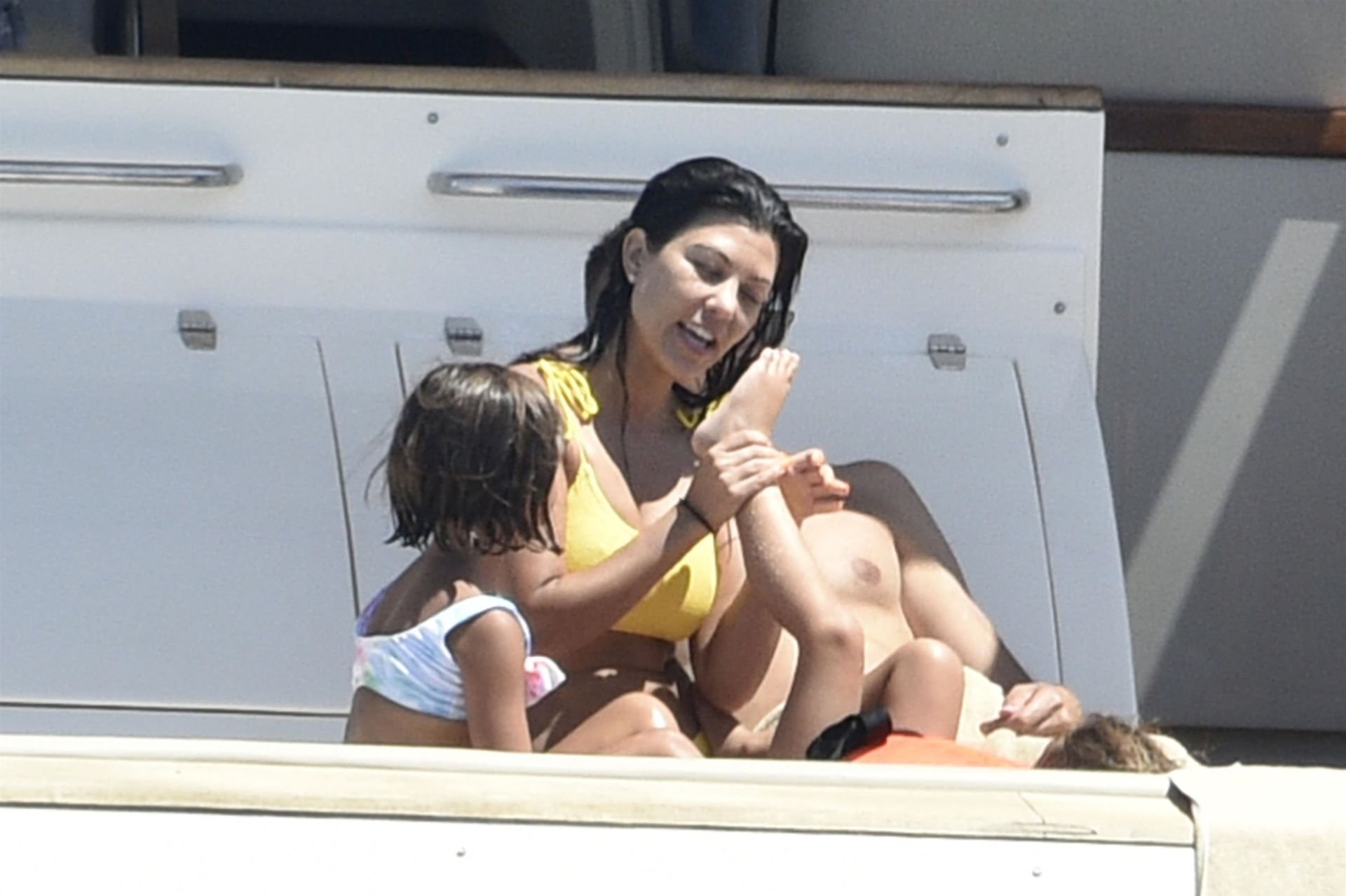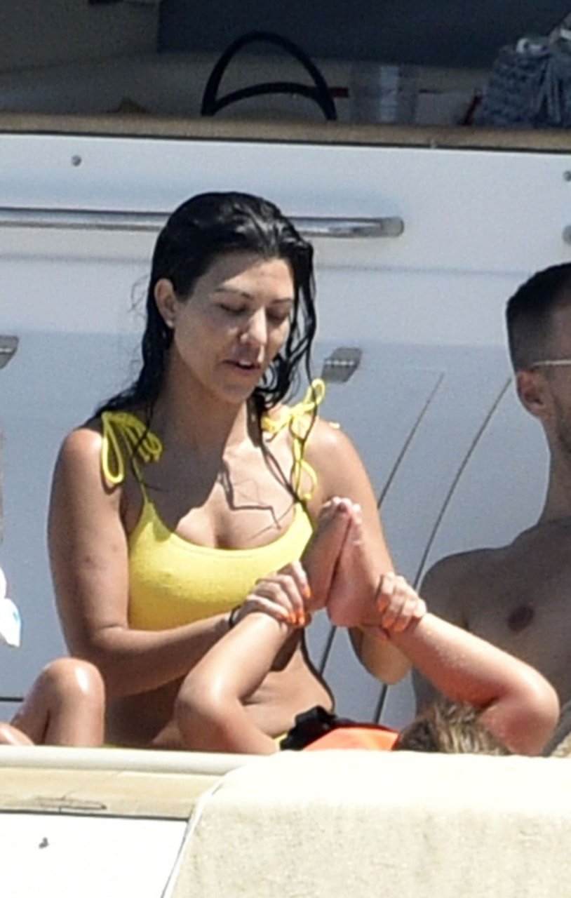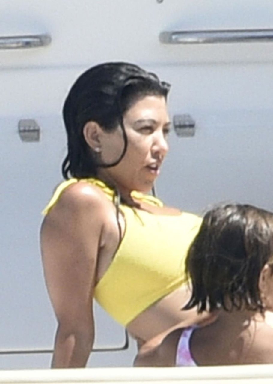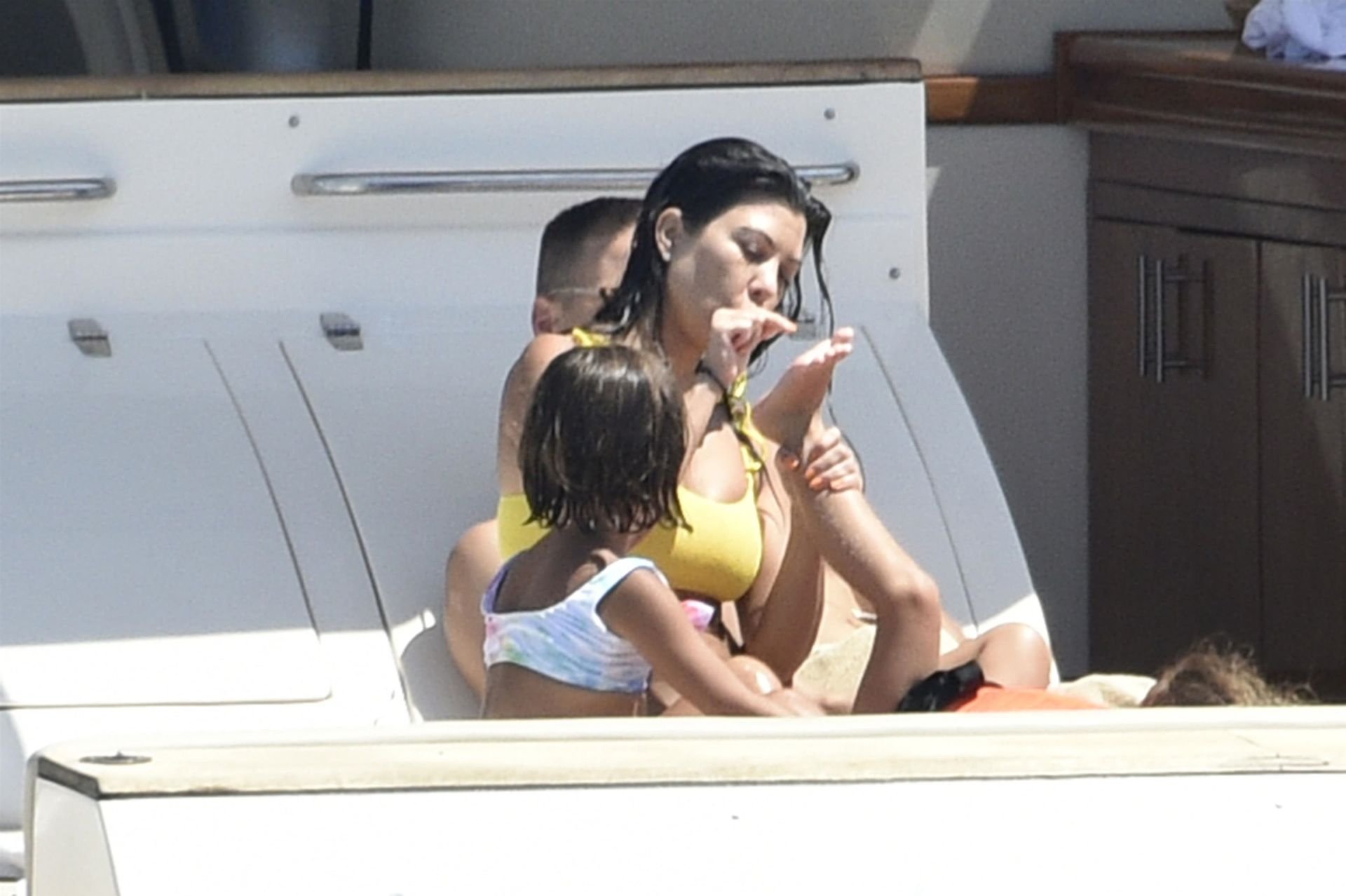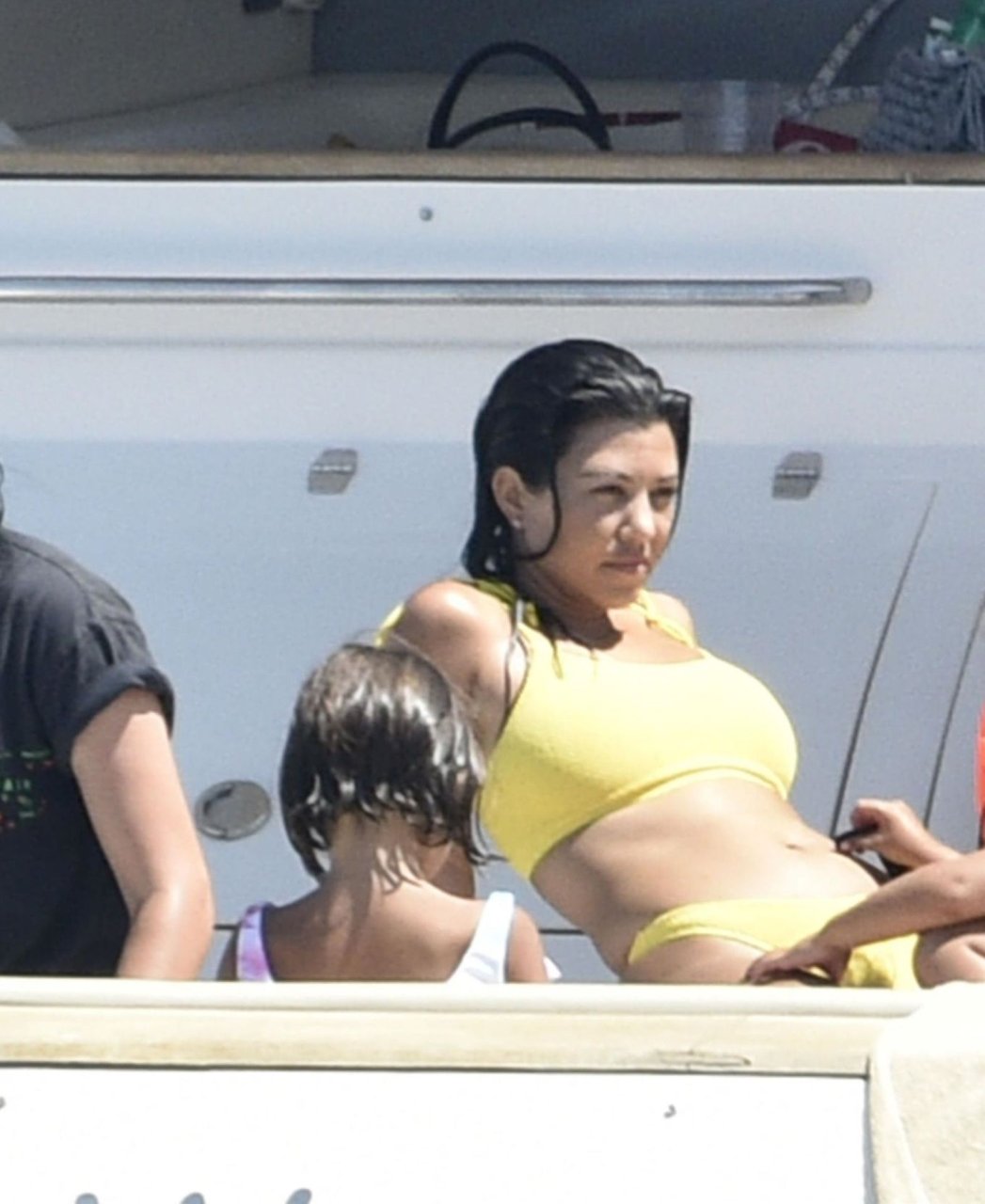 Kourtney Kardashian con sus hijos y su amigo Simon Huck fueron vistos en un yate en Córcega disfrutando del buen clima, 26/07/2019. Kourtney Kardashian muestra sus atributos con un bikini amarillo mientras se refresca en el océano.