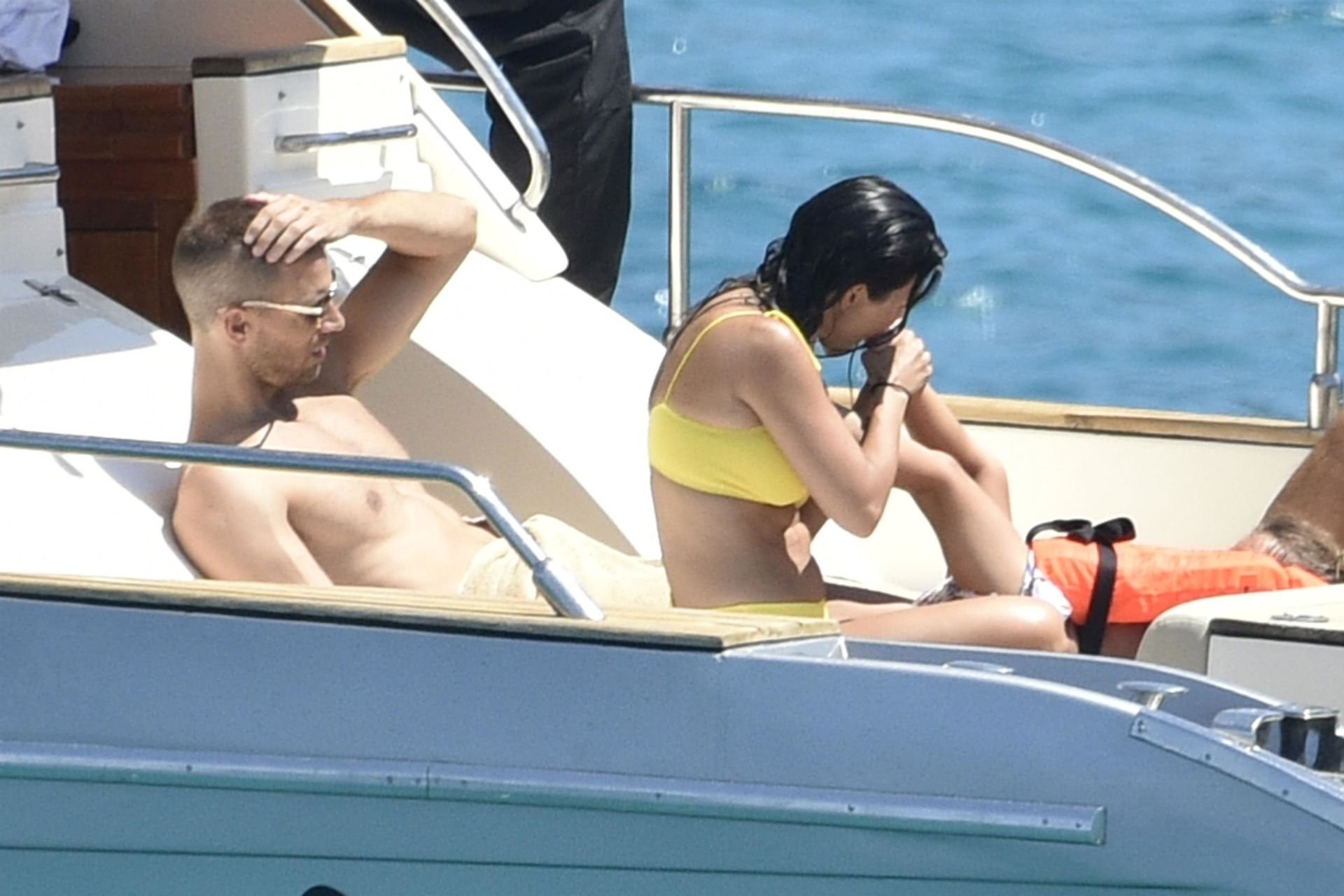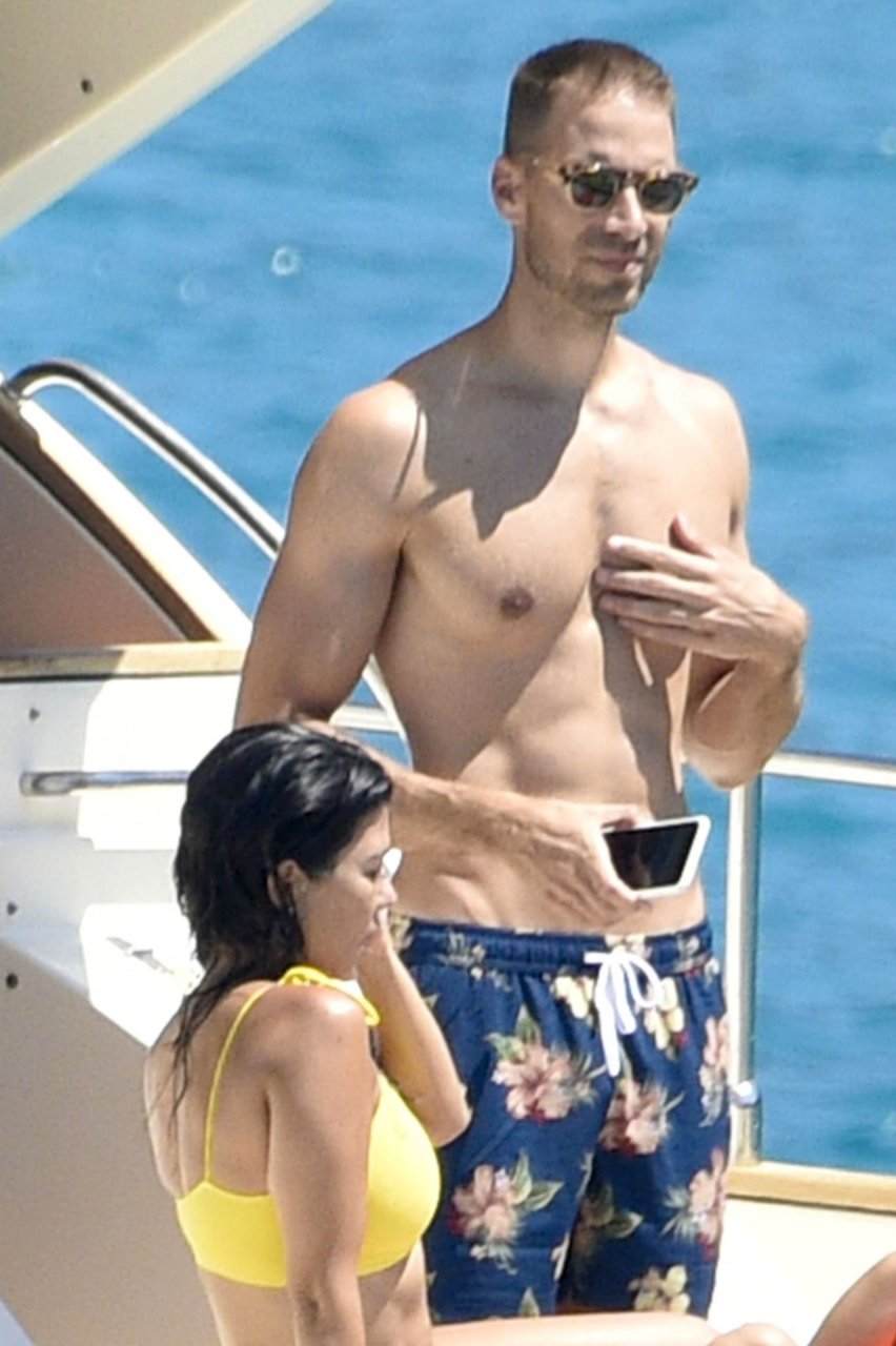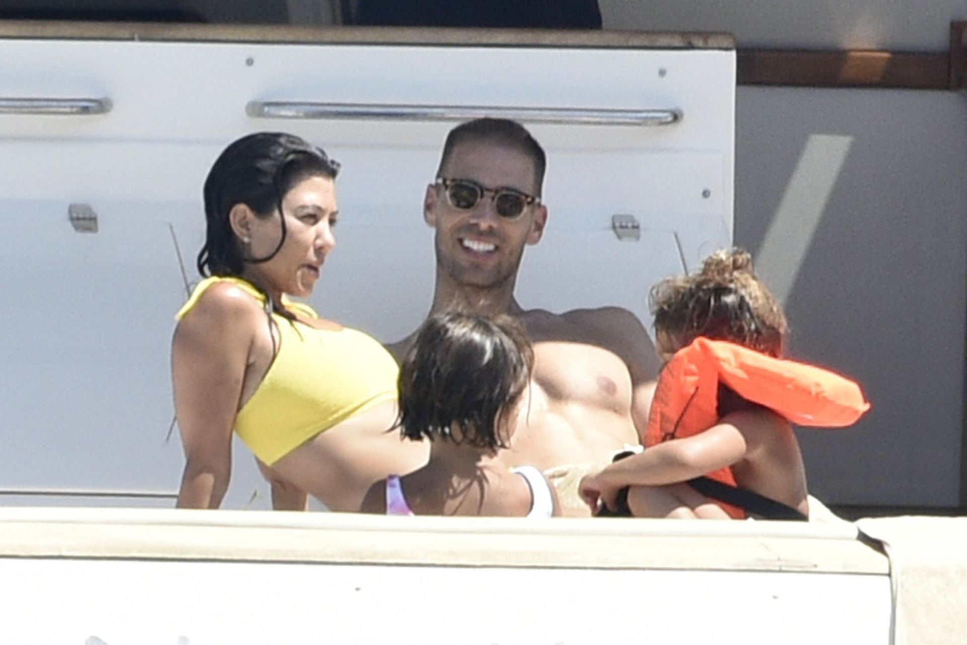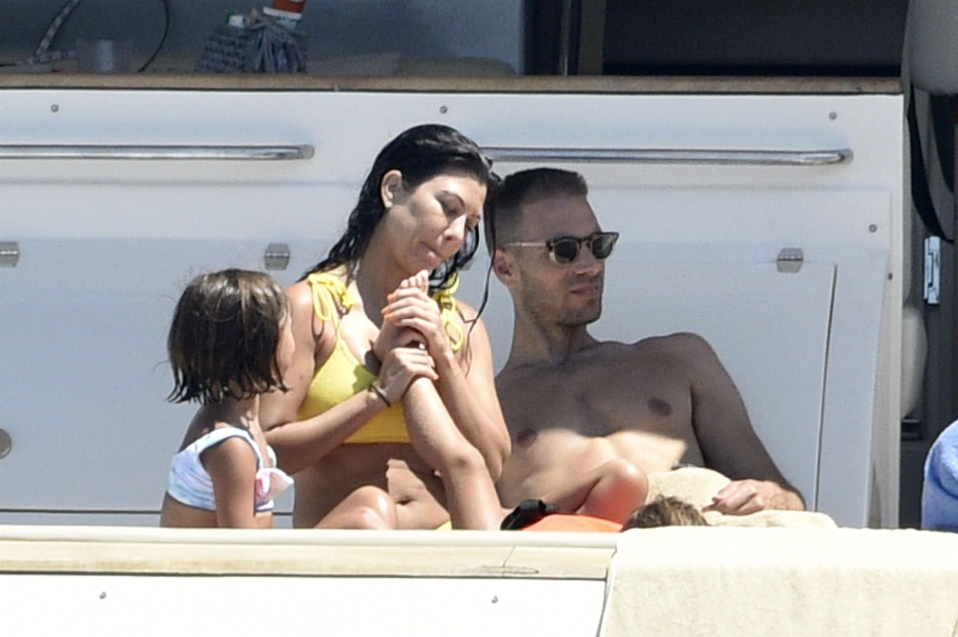 Kourtney Kardashian con sus hijos y su amigo Simon Huck fueron vistos en un yate en Córcega disfrutando del buen clima, 26/07/2019. Kourtney Kardashian muestra sus atributos con un bikini amarillo mientras se refresca en el océano.