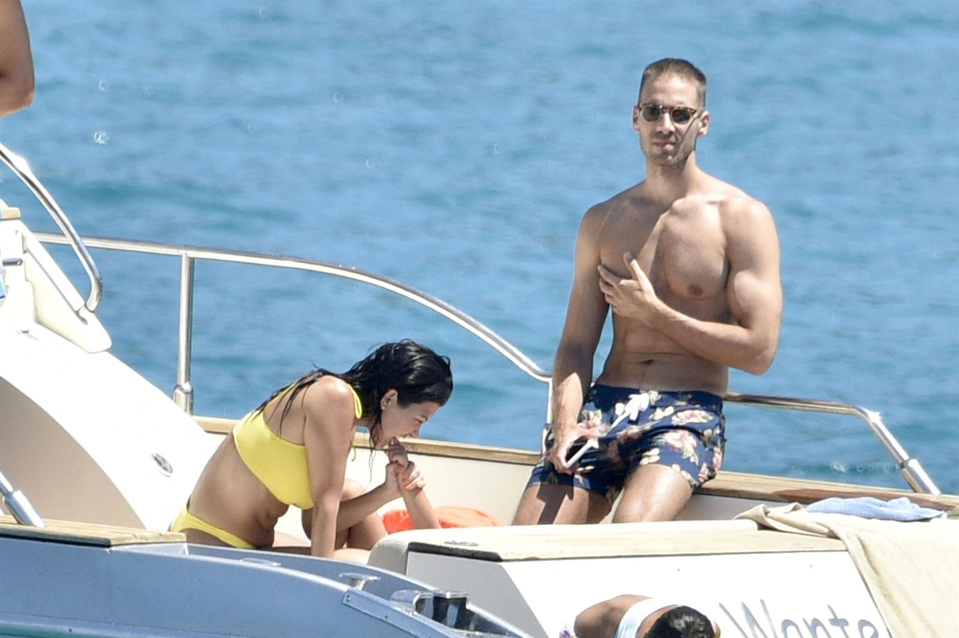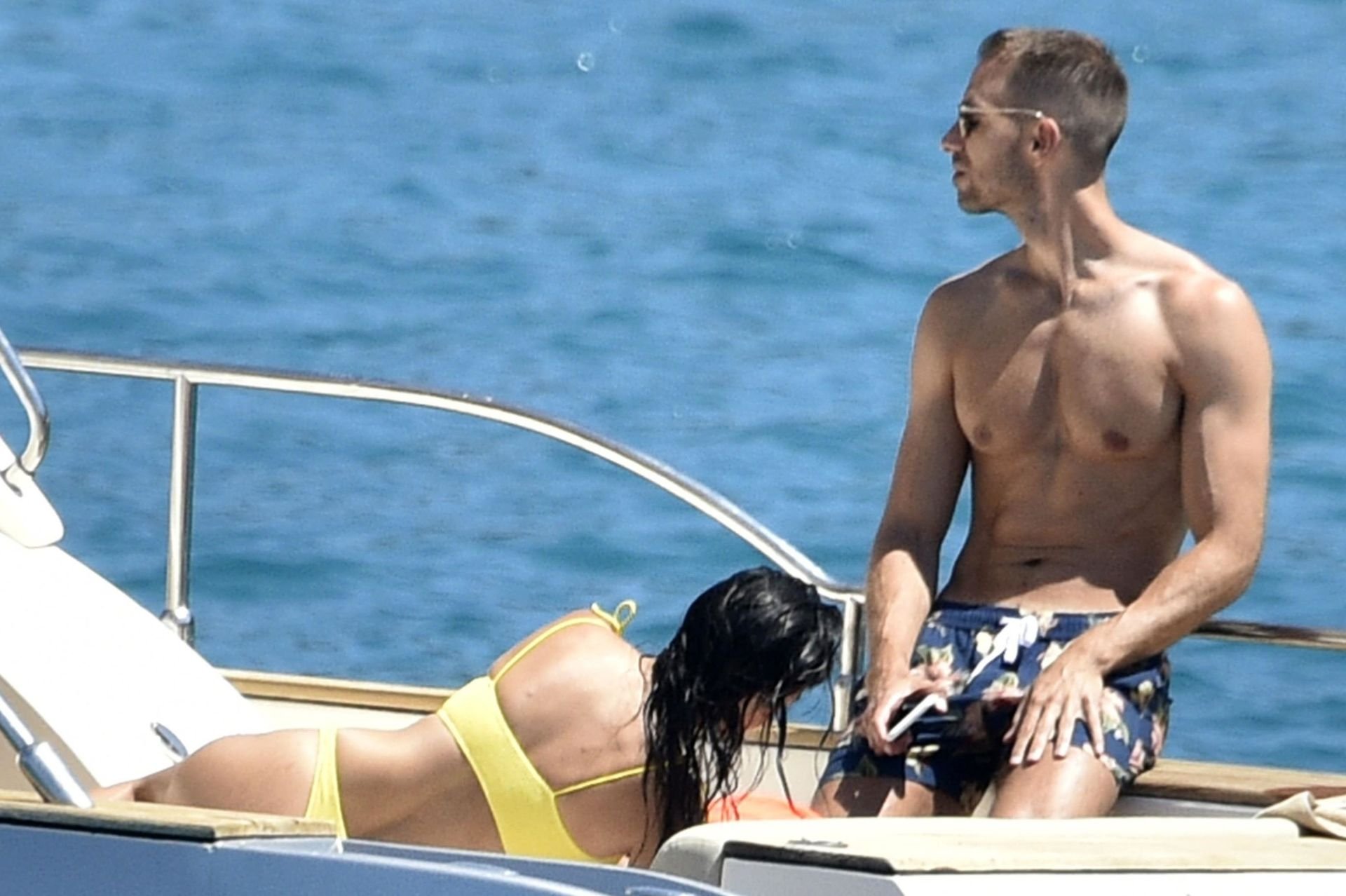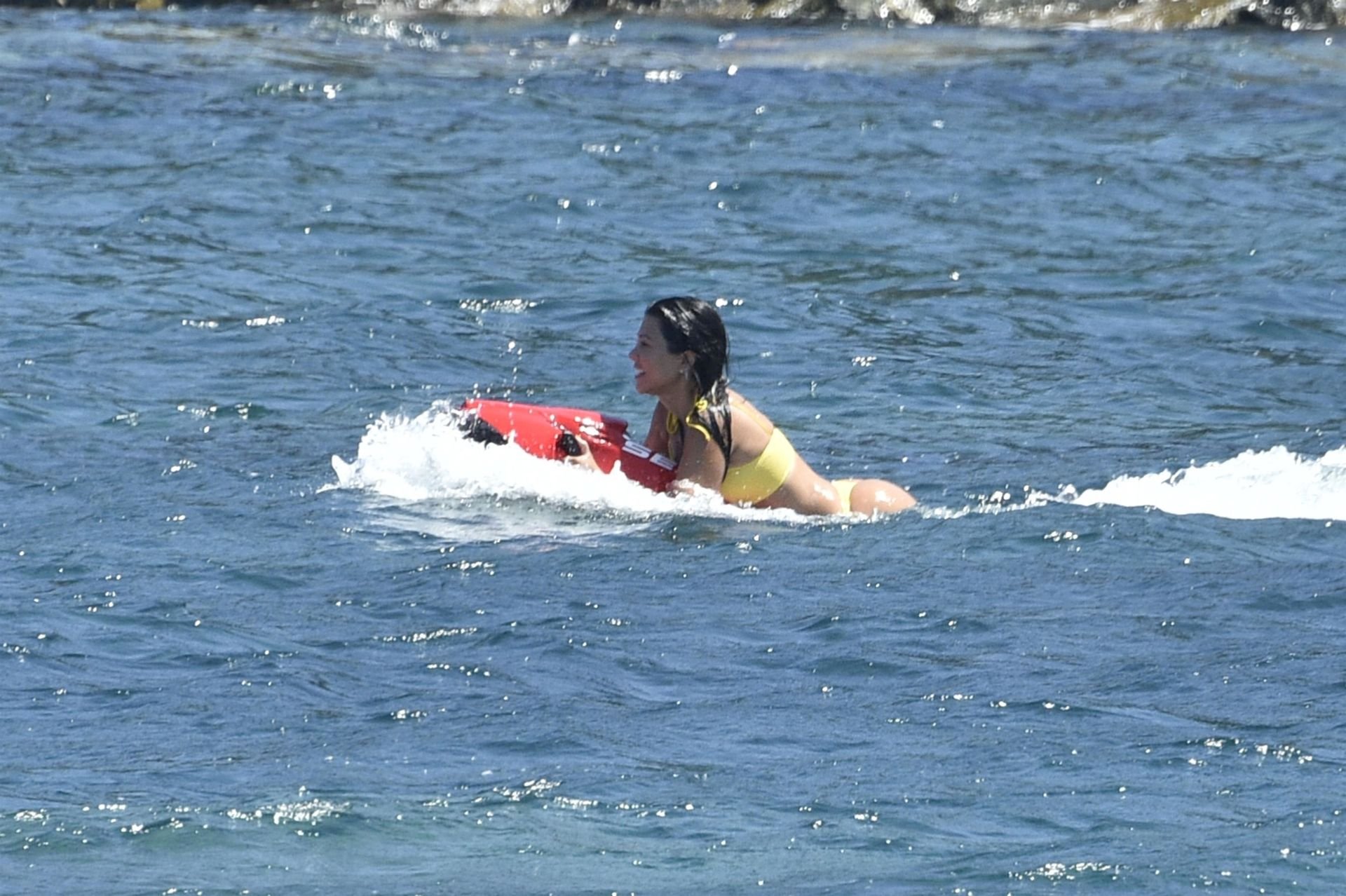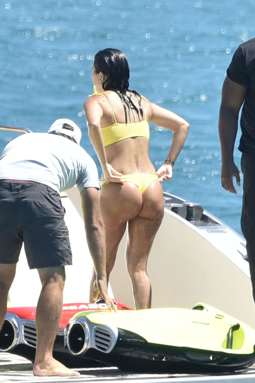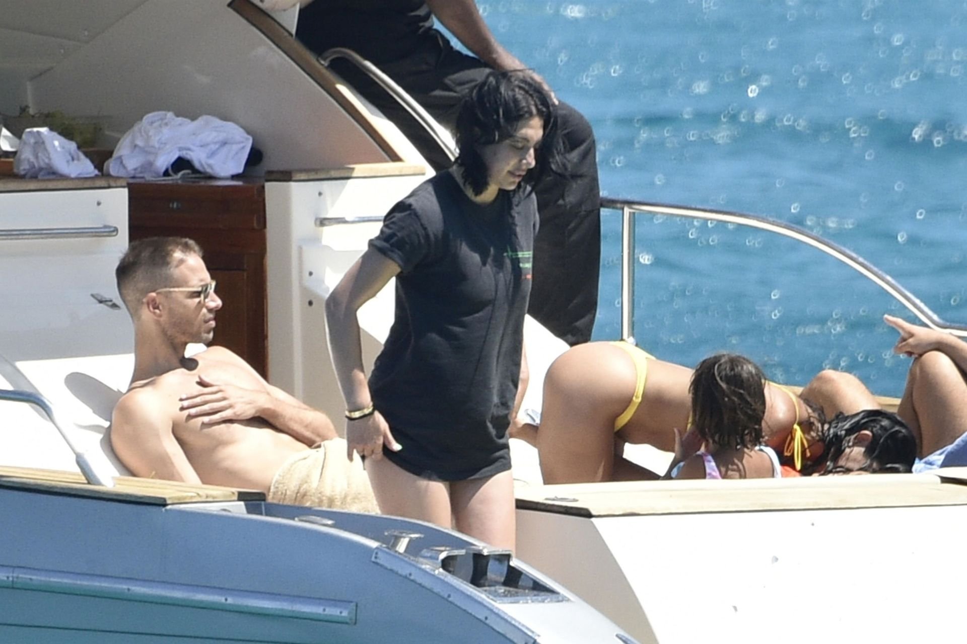 Kourtney Kardashian con sus hijos y su amigo Simon Huck fueron vistos en un yate en Córcega disfrutando del buen clima, 26/07/2019. Kourtney Kardashian muestra sus atributos con un bikini amarillo mientras se refresca en el océano.