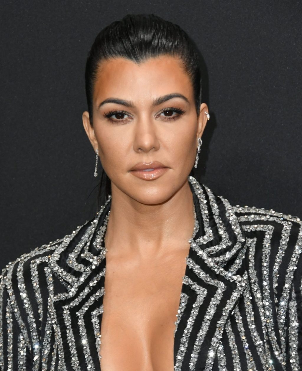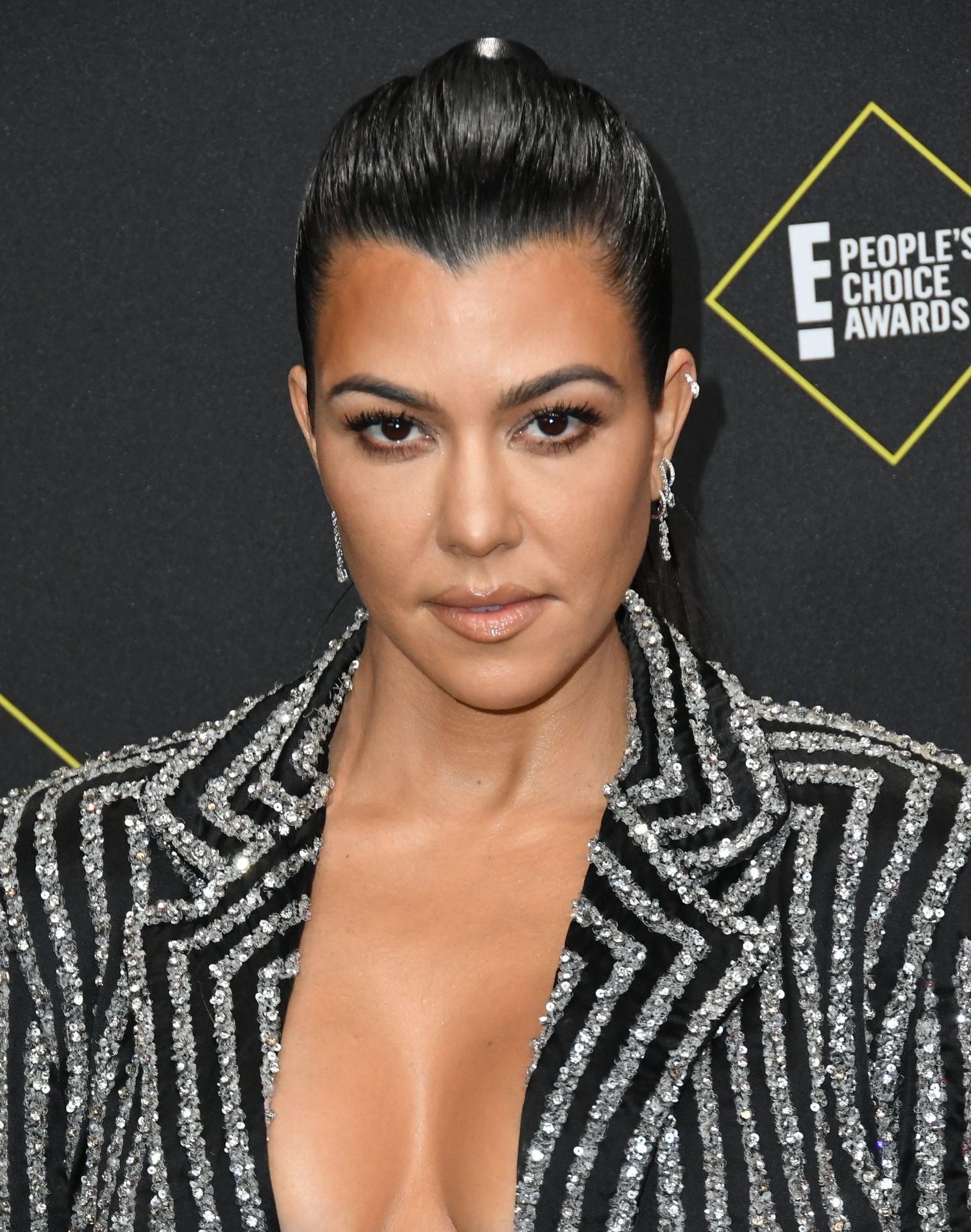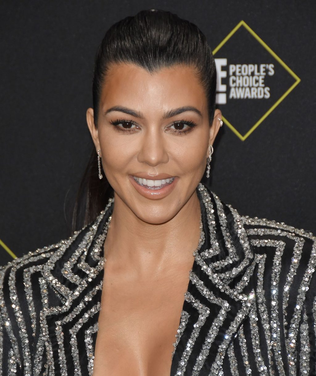 Kourtney Kardashian llega a los Premios People’s Choice 2019 de E! celebrados en el Barker Hangar en Santa Mónica, 10/11/2019. La estrella de la televisión reality mostró su escote, vistiendo un sostén negro.