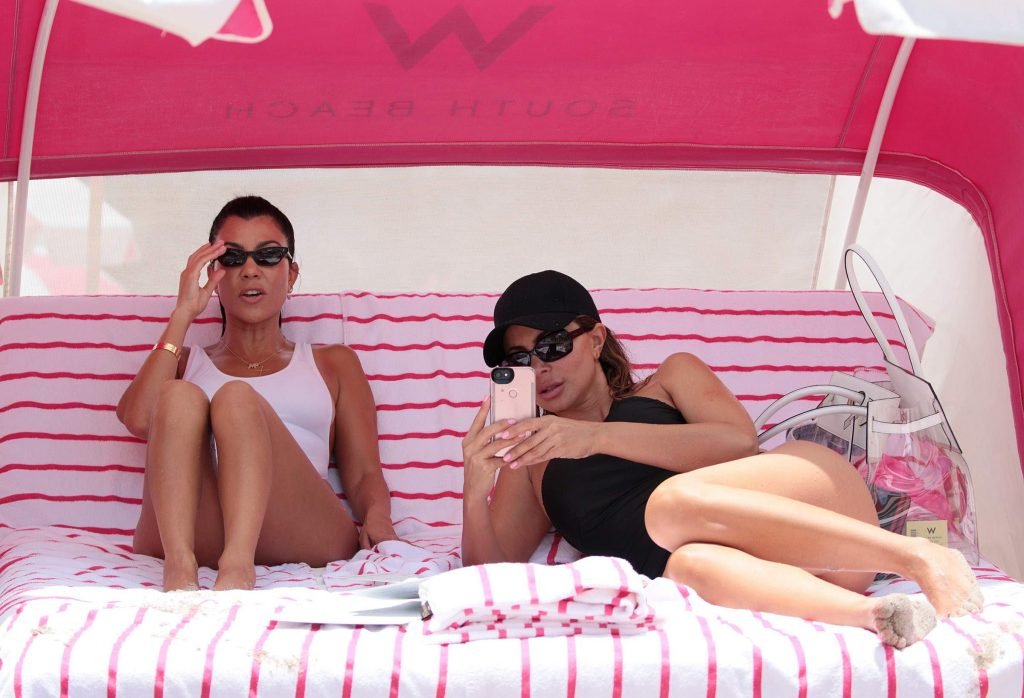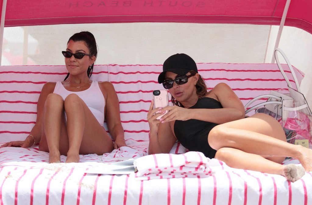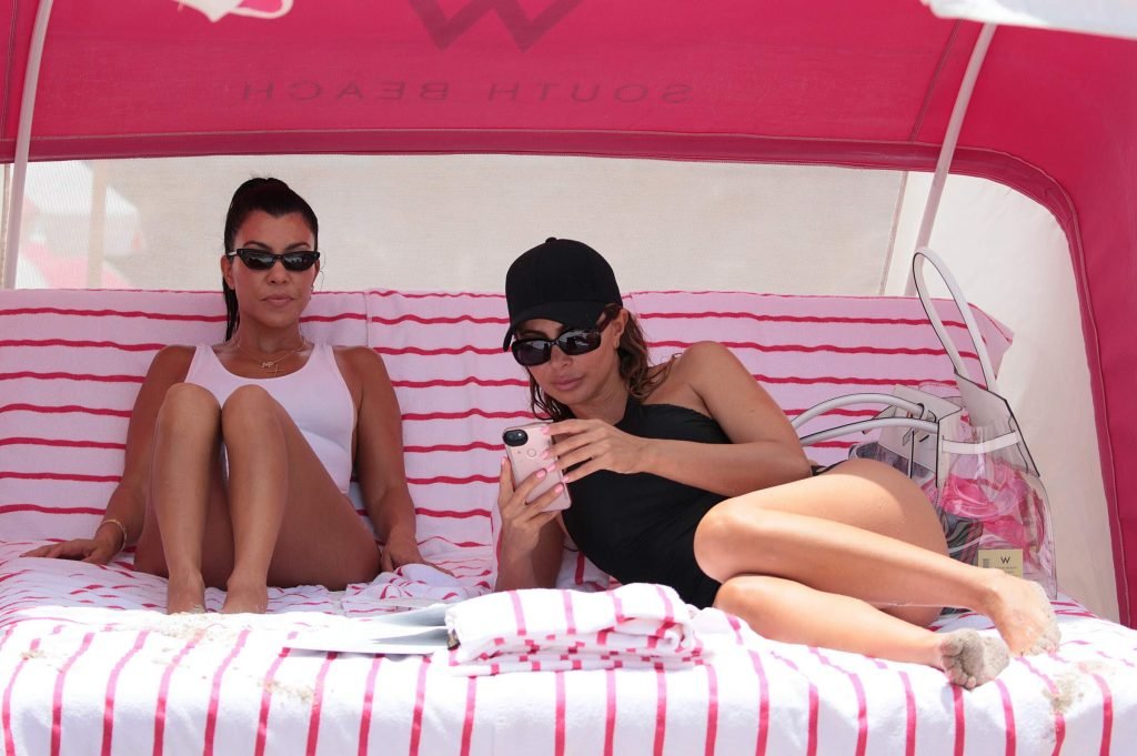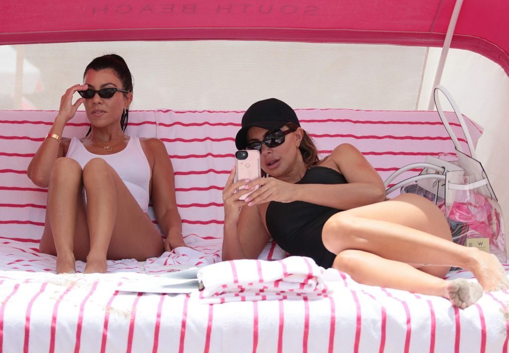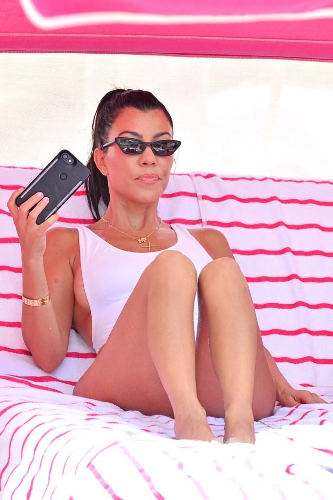 Kourtney Kardashian lleva un traje de baño blanco de una pieza en la playa de Miami, 11/06/2017. Kourtney Mary Kardashian es una estrella de televisión estadounidense del programa ‘Keeping Up with the Kardashians’, modelo, socialité. Edad – 38.