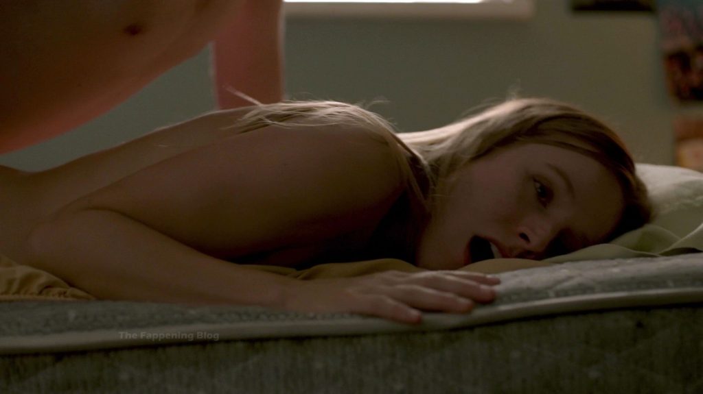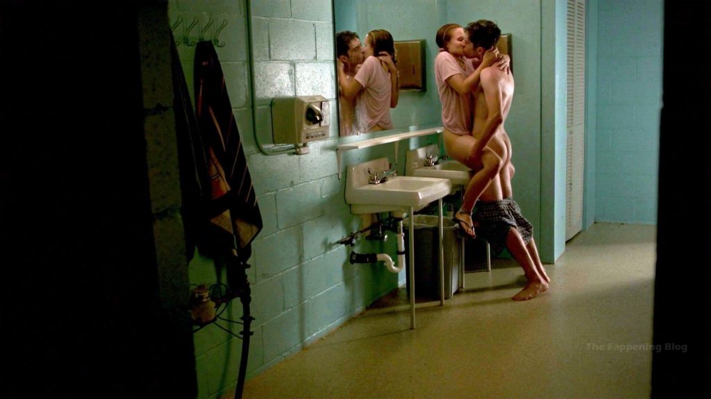 La actriz está besándose con un amante en un baño, el hombre metiendo la mano en sus bragas por delante y ella haciendo lo mismo con la mano dentro de sus pantalones. Luego se desliza completamente las bragas, mostrando su trasero desnudo de lado mientras se sienta al borde de un lavabo y el hombre está entre sus piernas y la levanta mientras tiene sexo con ella.