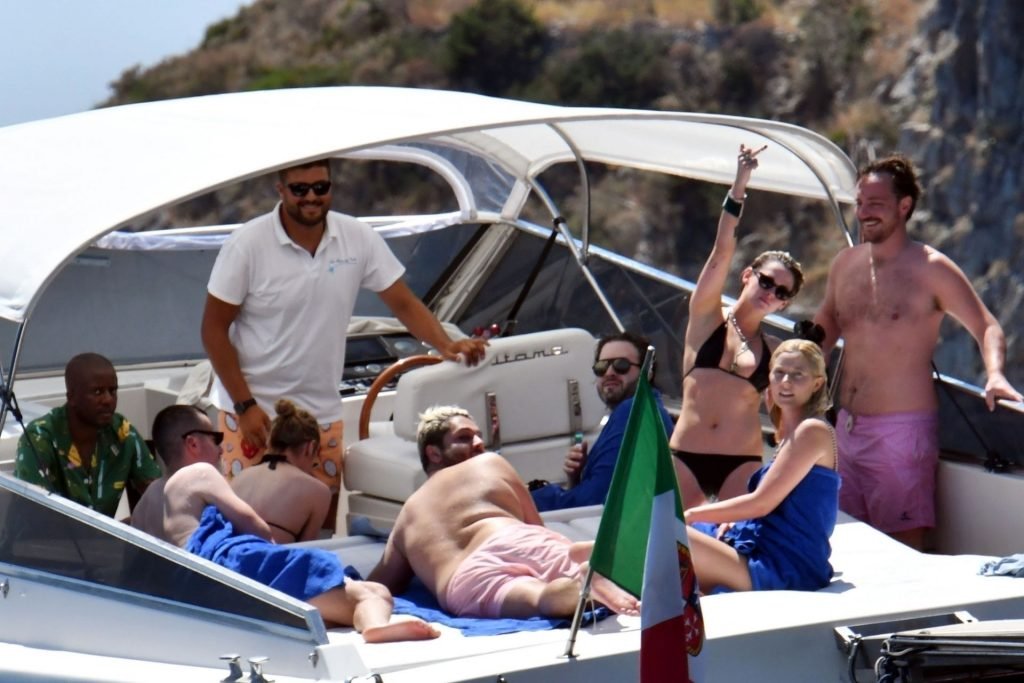 Mostrando su figura esbelta en su pequeño y escueto bikini negro, la actriz Kristen Stewart fue vista durante sus vacaciones de verano en la Costa Amalfitana, 14/07/2019. Kristen, famosa por su papel en las trilogías de “Crepúsculo”, se divirtió saltando desde su barco y relajándose con su novia Stella Maxwell y algunos amigos, y se quitó el top para disfrutar del cálido sol italiano.