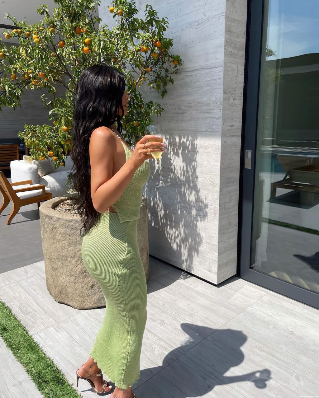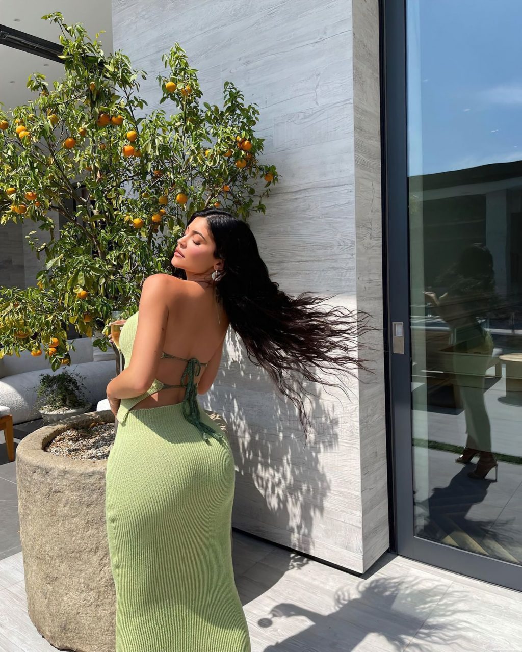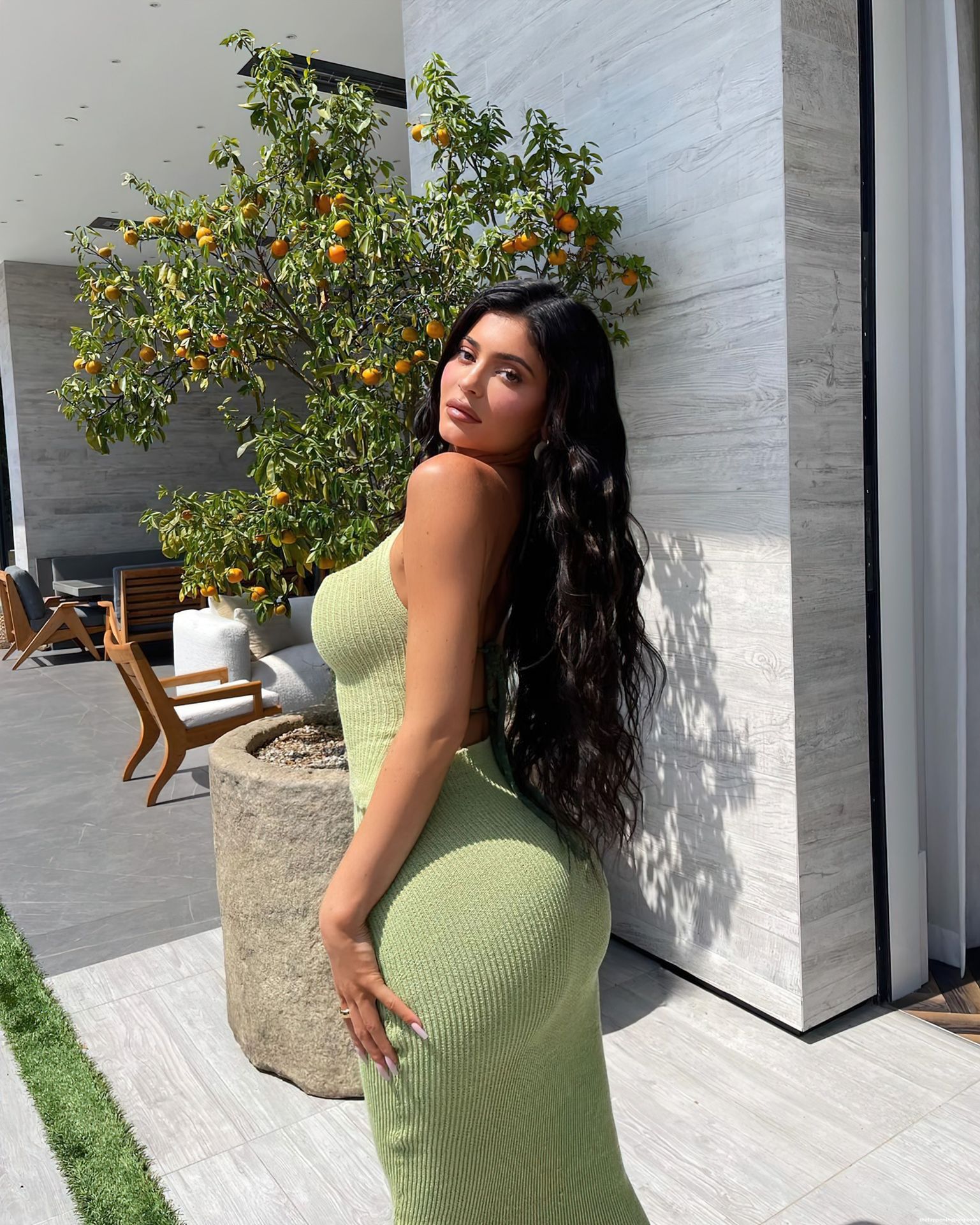 La estrella curvilínea de reality TV Kylie Jenner muestra sus pechos y trasero falsos con un vestido ajustado en una sesión de fotos en redes sociales (agosto 2021).