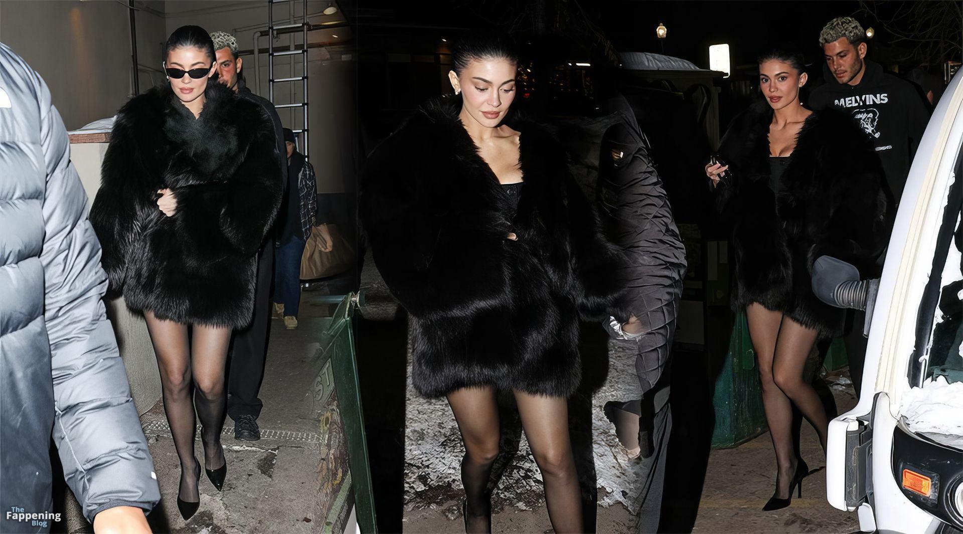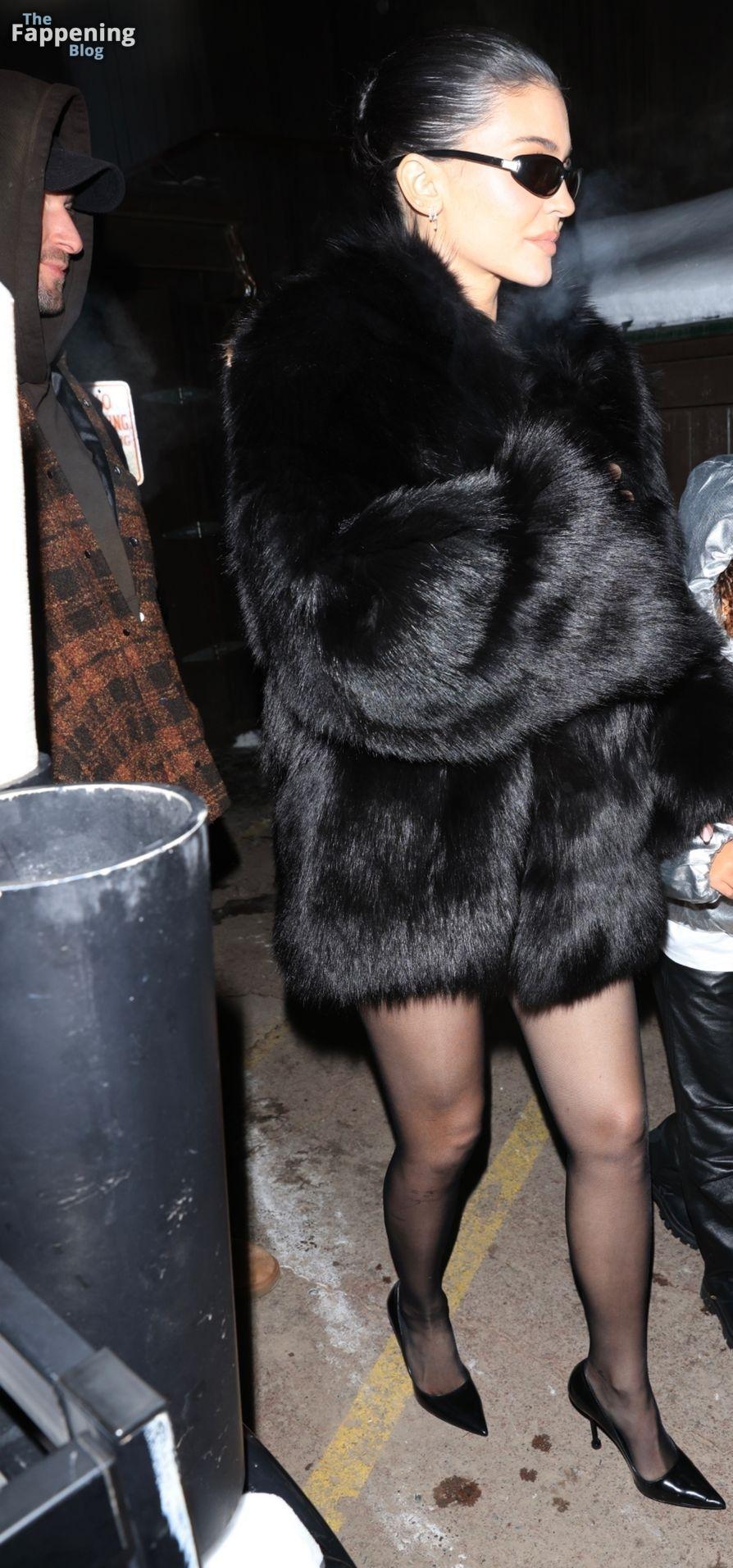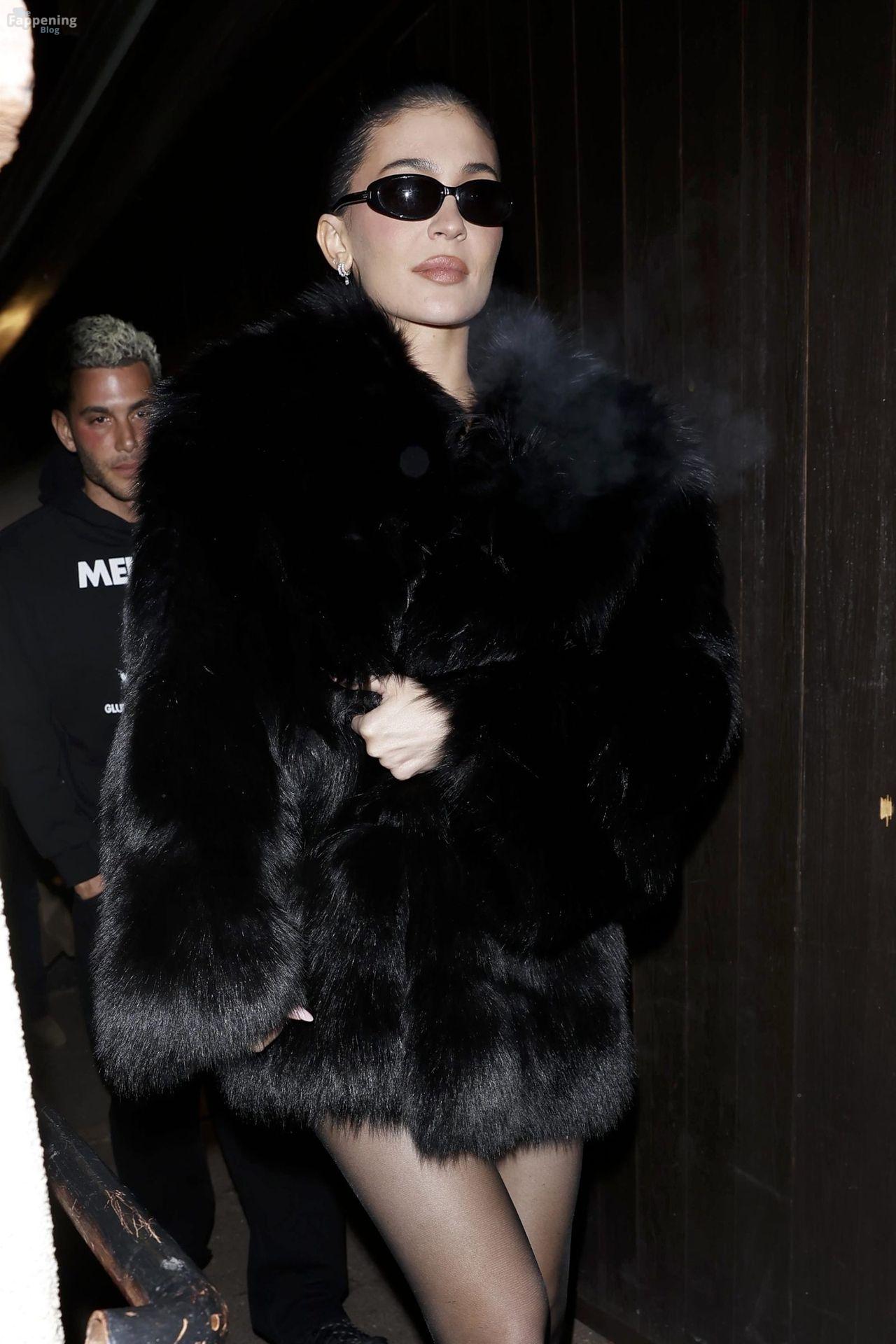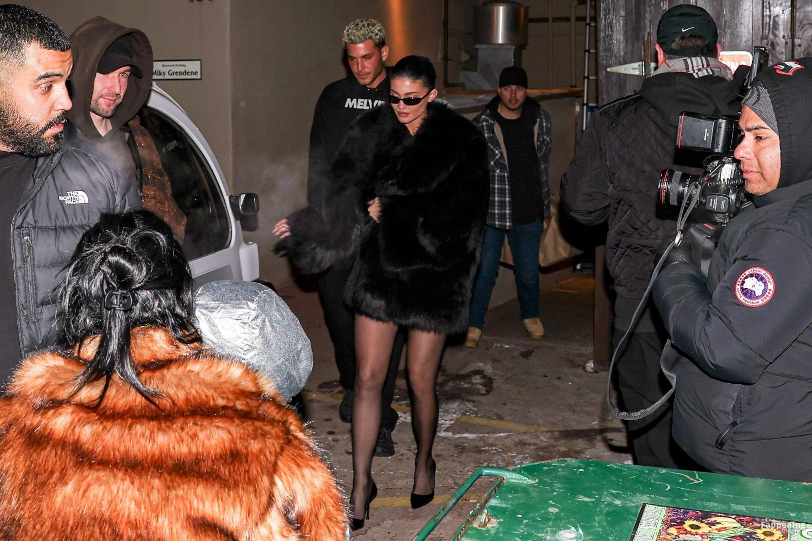 Kylie Jenner, luciendo piernas y cargando a su hija Stormi, deslumbra con un elegante abrigo de piel negro mientras salen de cenar en Casa Tua en Aspen.