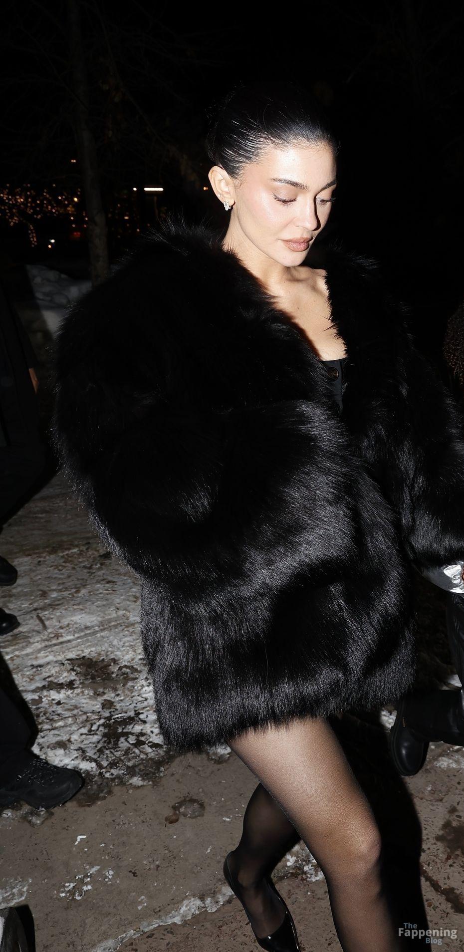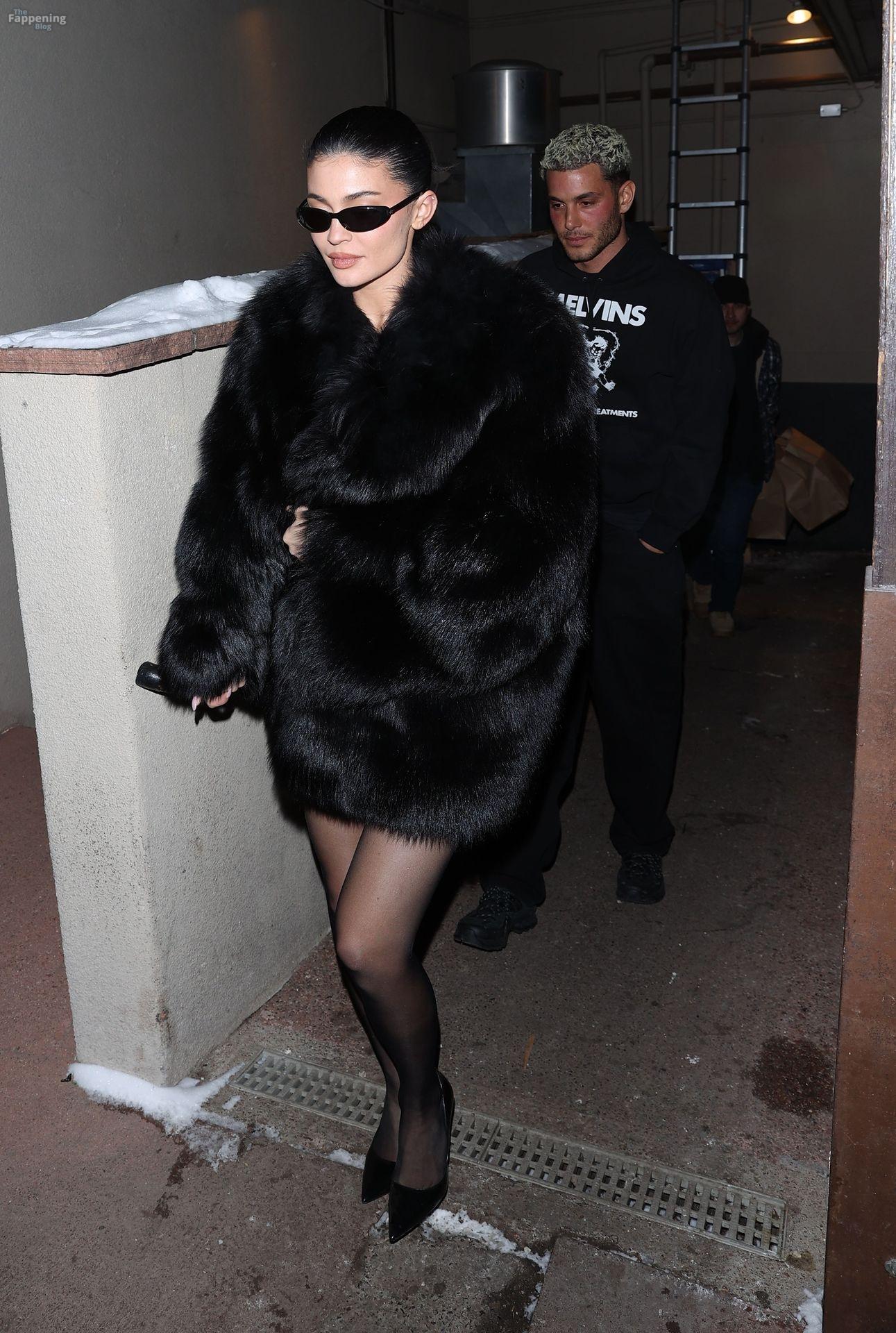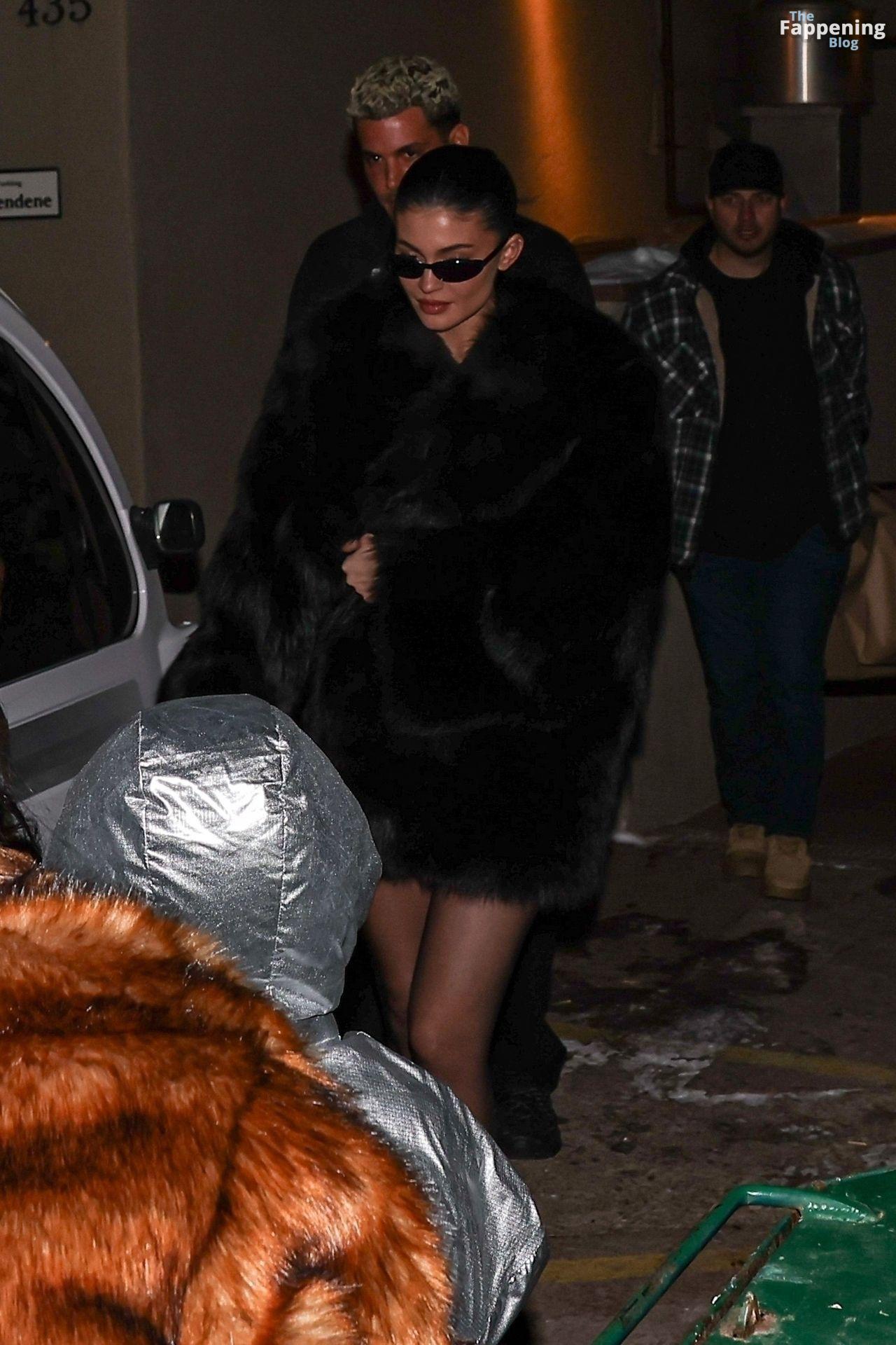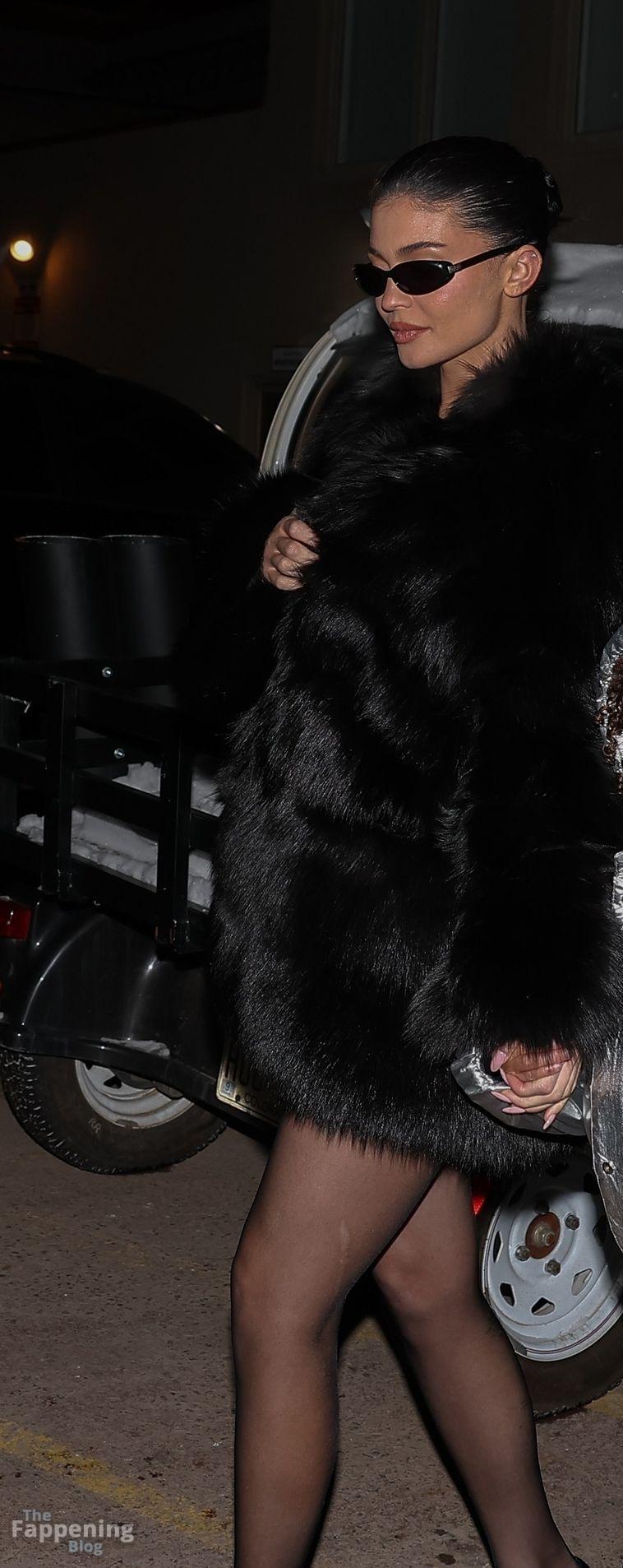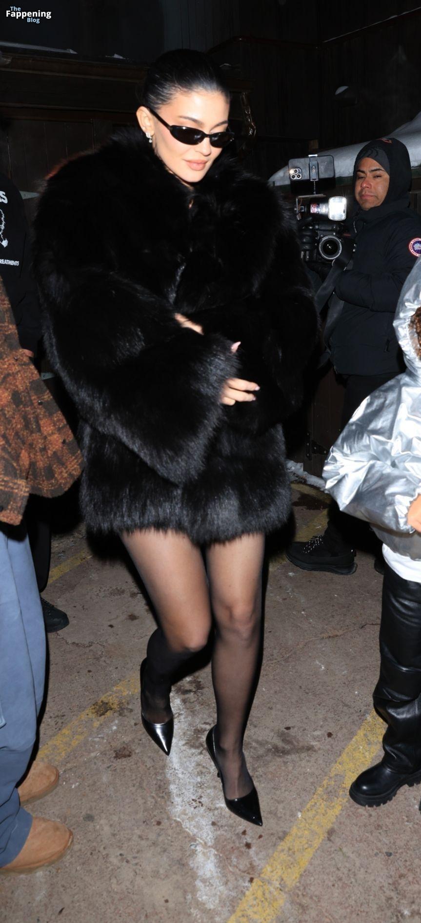 Kylie Jenner, luciendo piernas y cargando a su hija Stormi, deslumbra con un elegante abrigo de piel negro mientras salen de cenar en Casa Tua en Aspen.