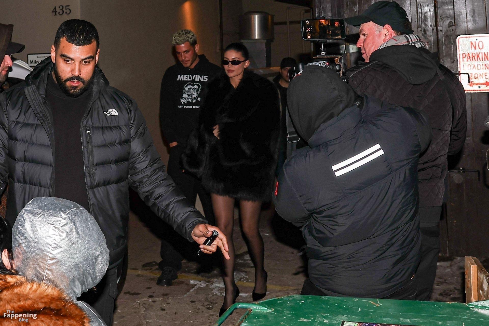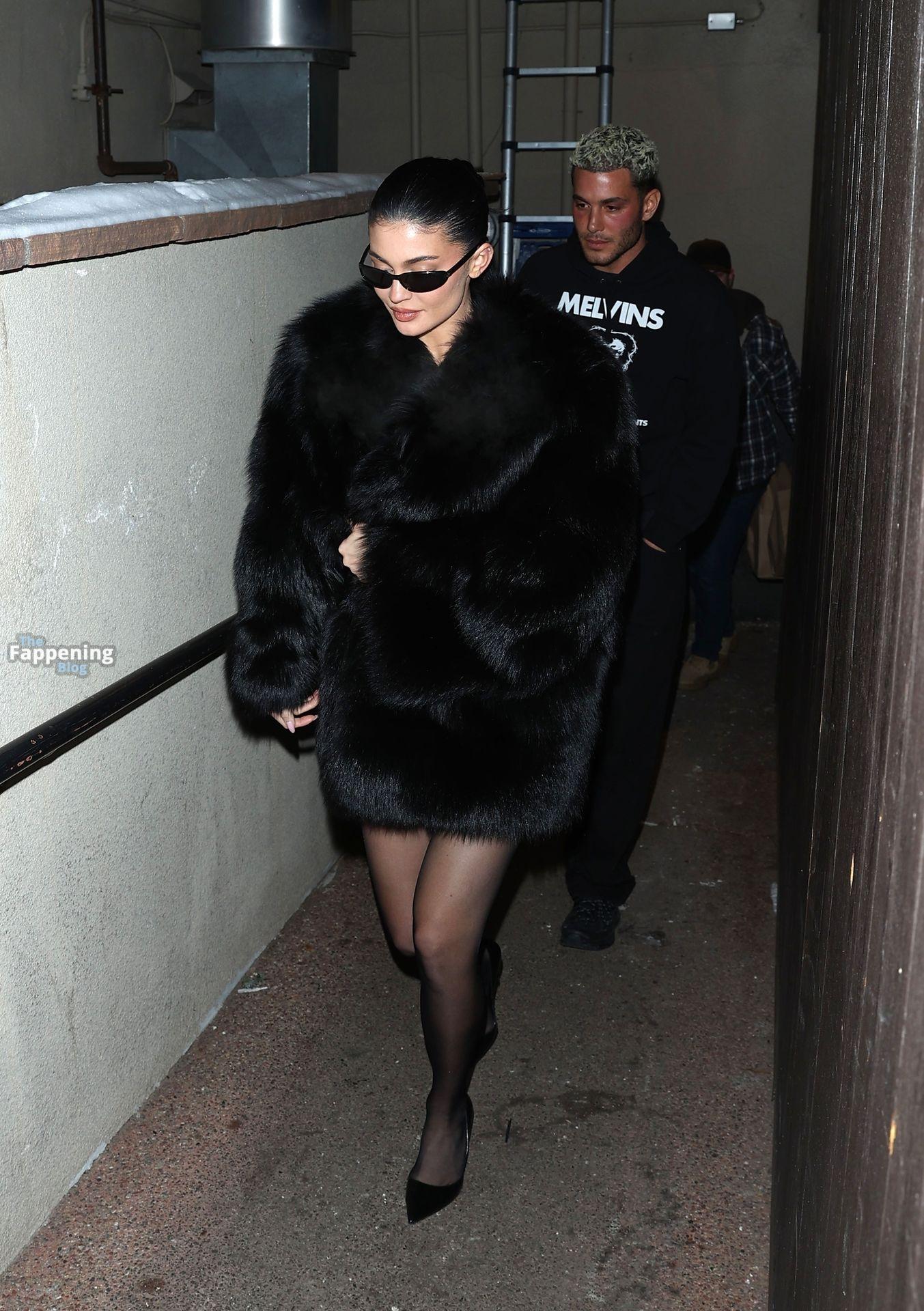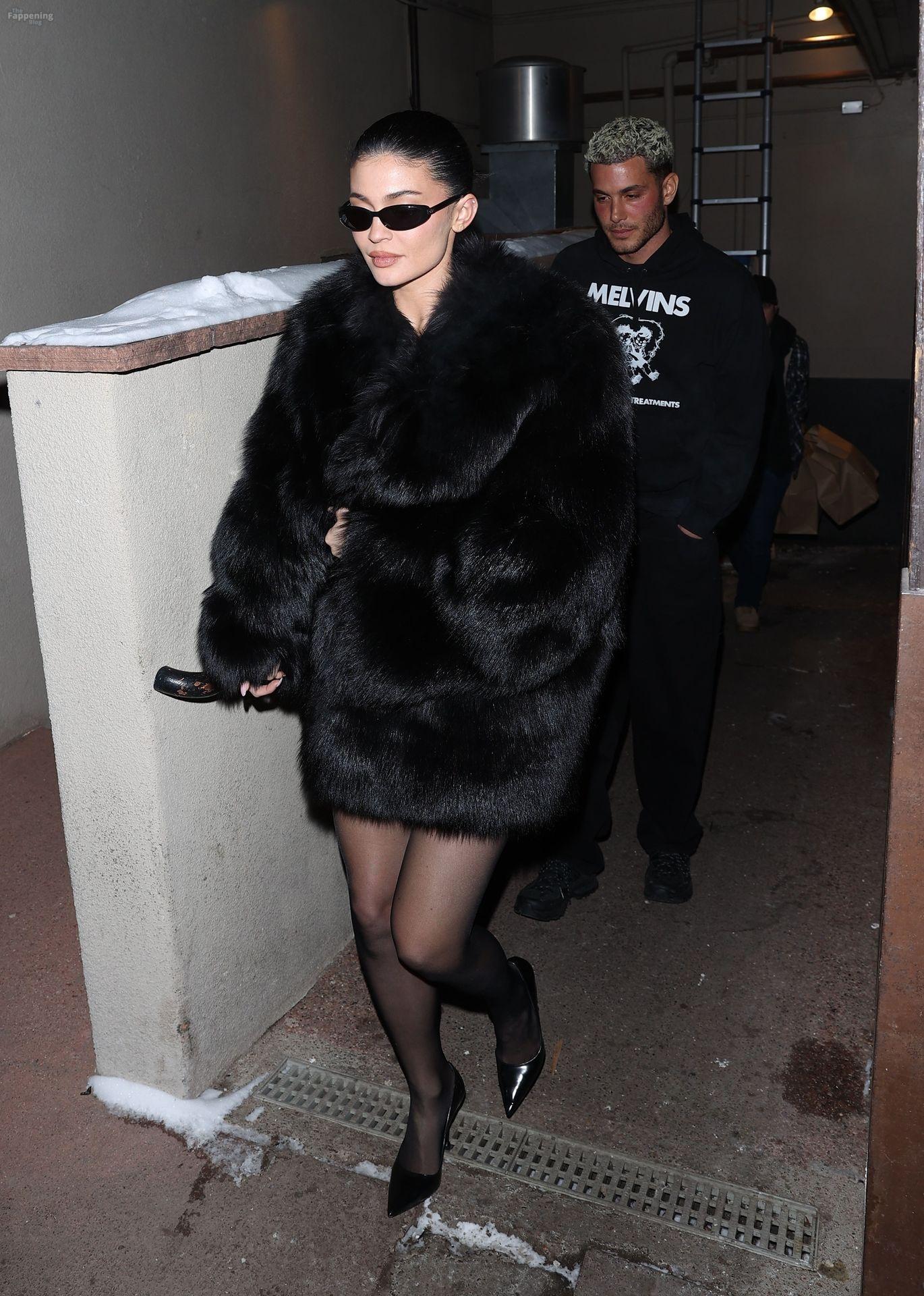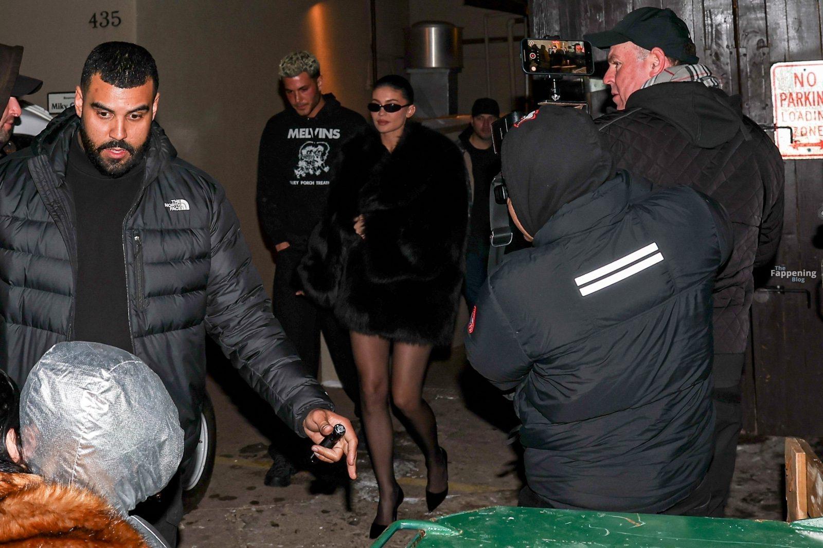Kylie Jenner, luciendo piernas y cargando a su hija Stormi, deslumbra con un elegante abrigo de piel negro mientras salen de cenar en Casa Tua en Aspen.