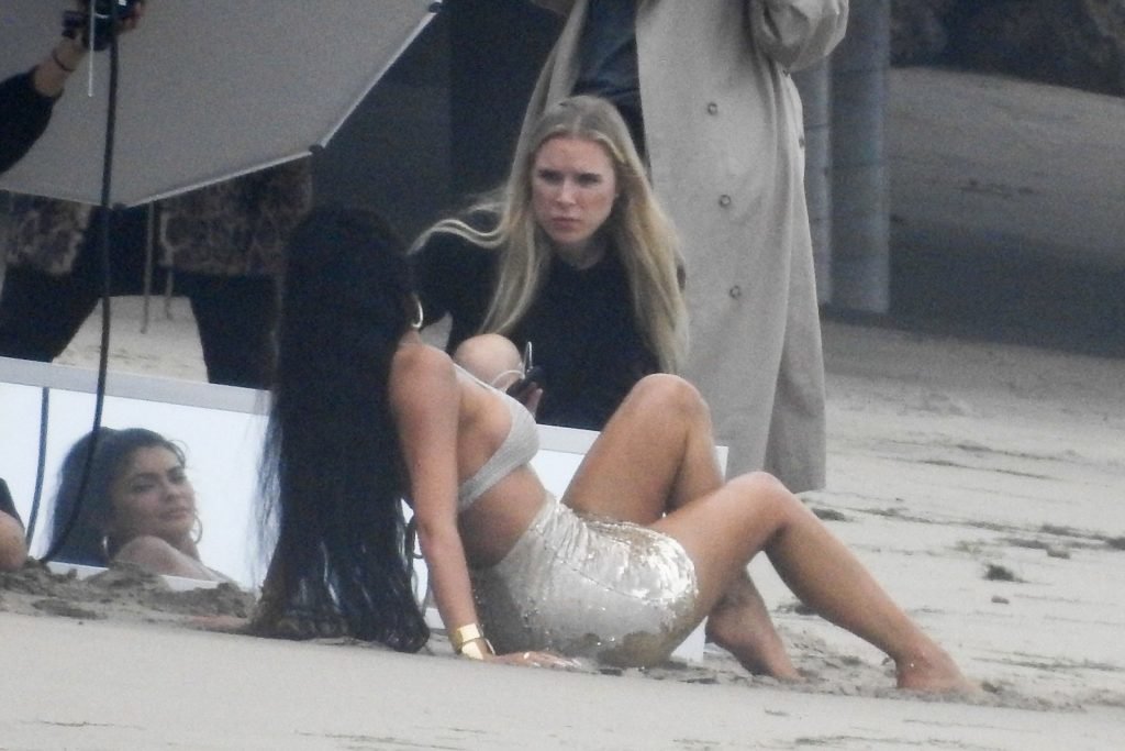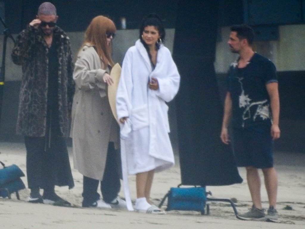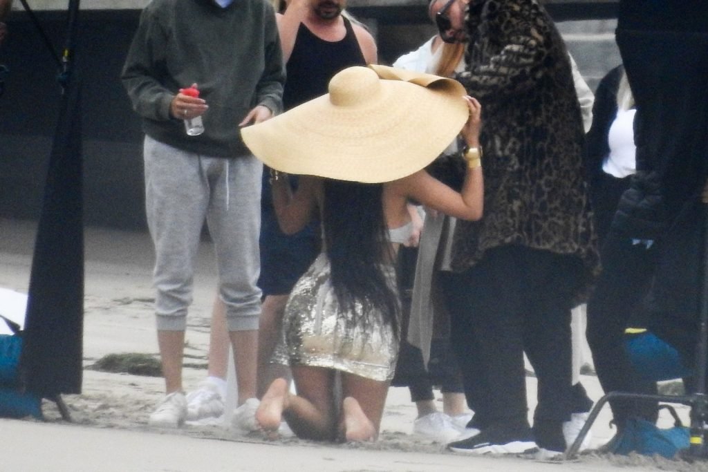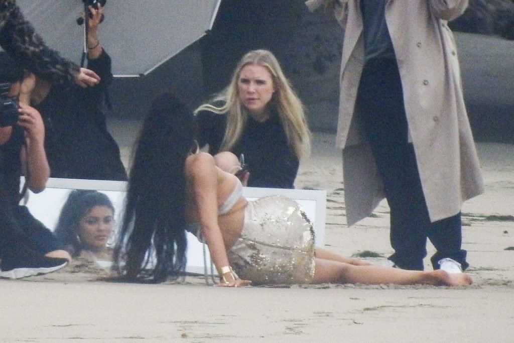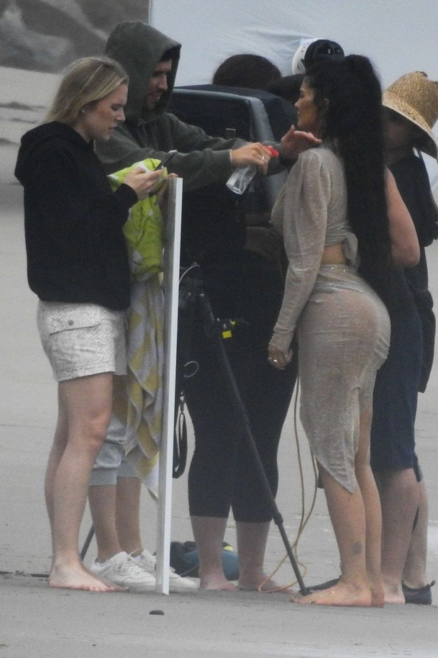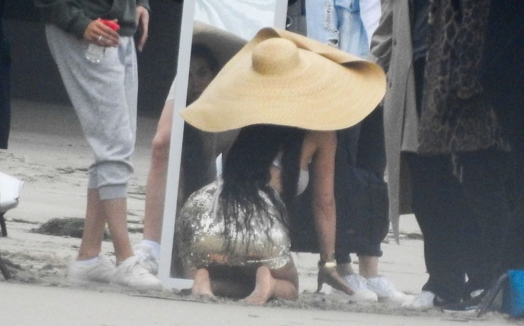 En otra escena, Kylie llevaba un top de bikini, una falda de lentejuelas y un sombrero de playa grande mientras posaba en la arena frente a un espejo. Mucho personal estuvo presente para ayudar, y un asistente afortunado tuvo la ardua tarea de rociarla con una botella de agua asegurándose de que tuviera la cantidad justa de agua y arena pegada en sus piernas.