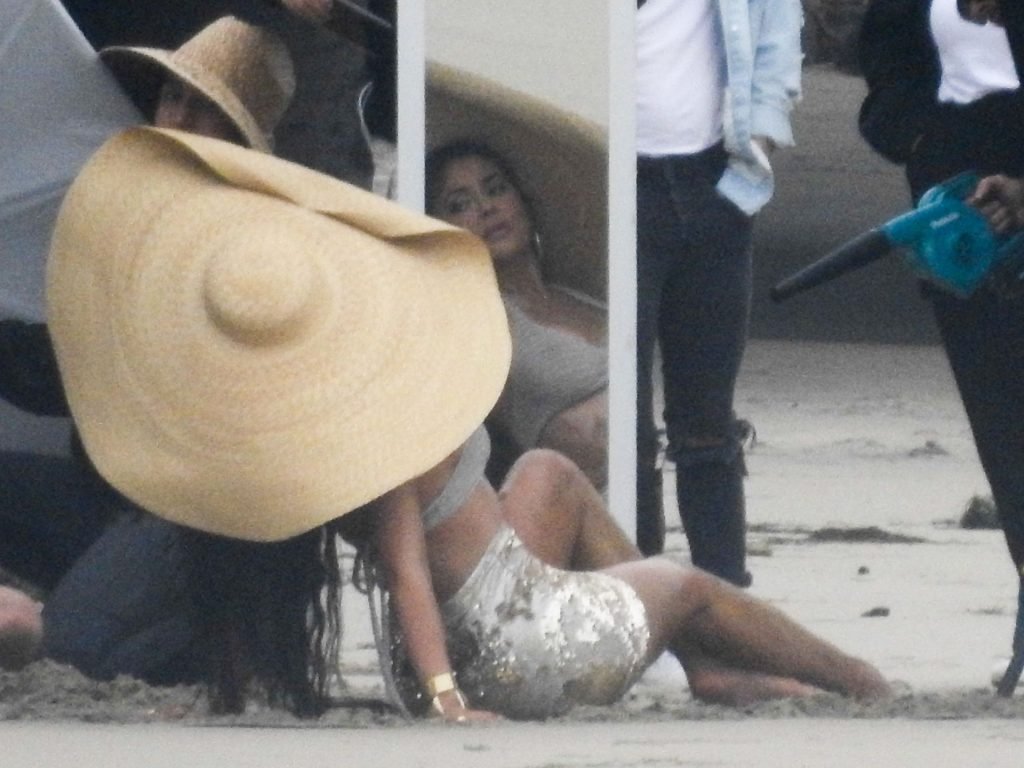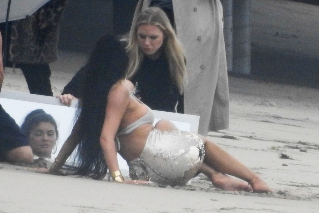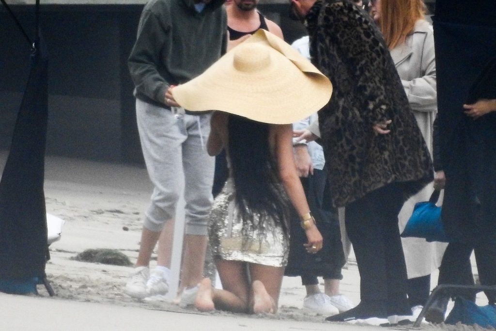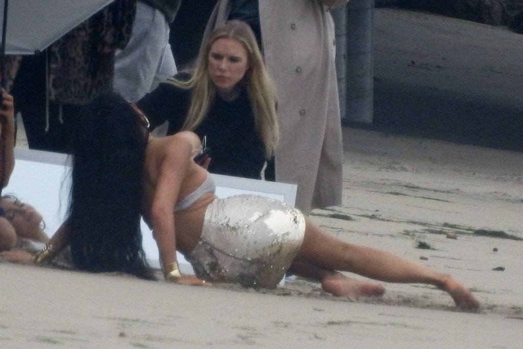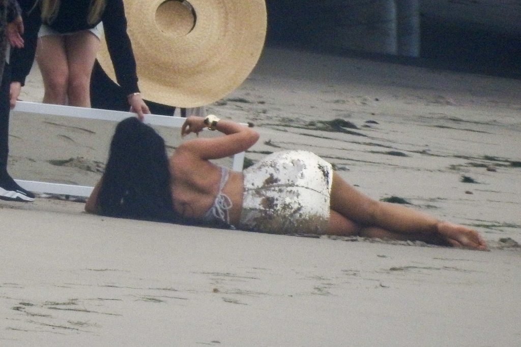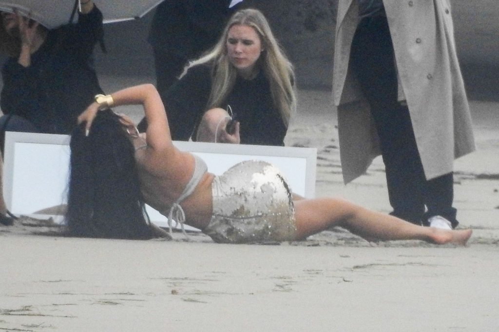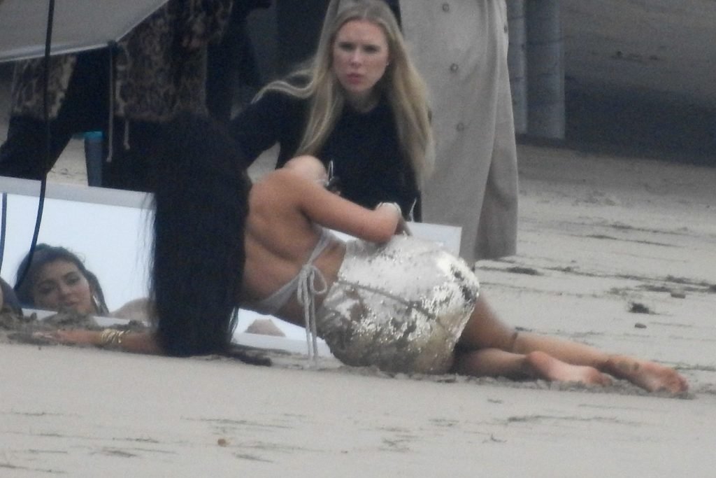 En otra escena, Kylie llevaba un top de bikini, una falda de lentejuelas y un sombrero de playa grande mientras posaba en la arena frente a un espejo. Mucho personal estuvo presente para ayudar, y un asistente afortunado tuvo la ardua tarea de rociarla con una botella de agua asegurándose de que tuviera la cantidad justa de agua y arena pegada en sus piernas.